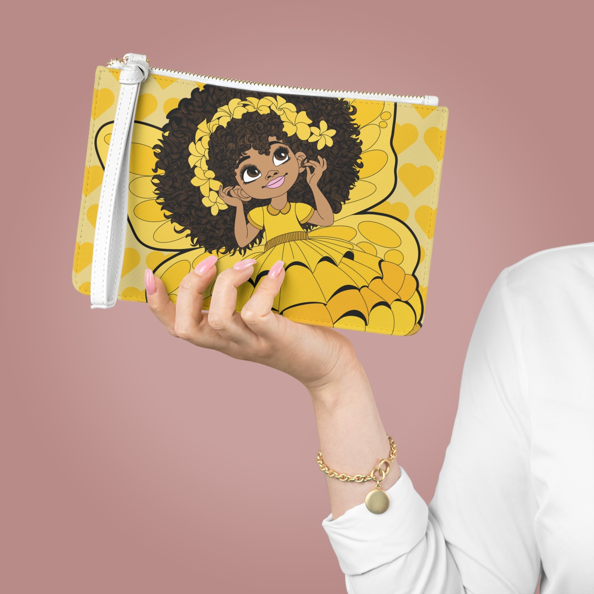 The Blissful Brandie Clutch Bag from the Coco Pixies collection is a bright, feel-good accessory bursting with personality and charm. Featuring Blissful Brandie in her signature golden dress, lush curls, and fluttering pixie wings, this clutch is set against a playful heart pattern that adds instant warmth and style. Designed to stand out while staying practical, it brings character and confidence to every outing.