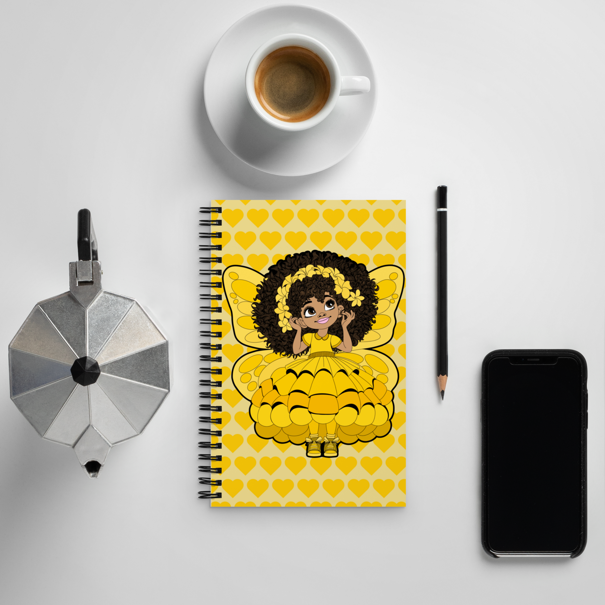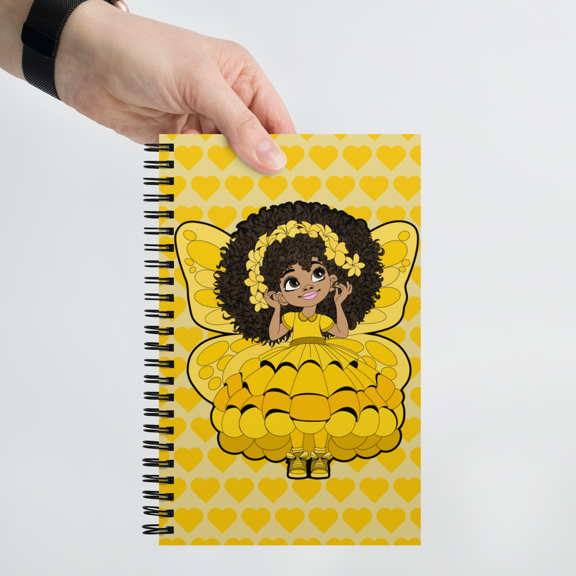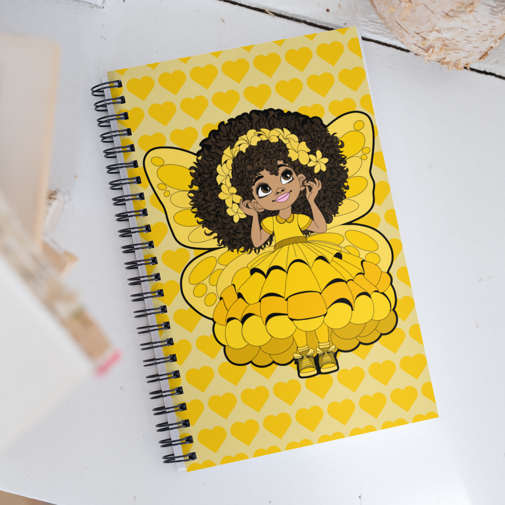 Sunshine spills across every page of the Blissful Brandie Notebook from the Coco Pixies collection. Wrapped in a radiant golden heart pattern and featuring Brandie in her petal-inspired yellow dress, butterfly wings, and signature curls crowned with blossoms, this journal captures warmth, confidence, and bright imagination in one unforgettable design.