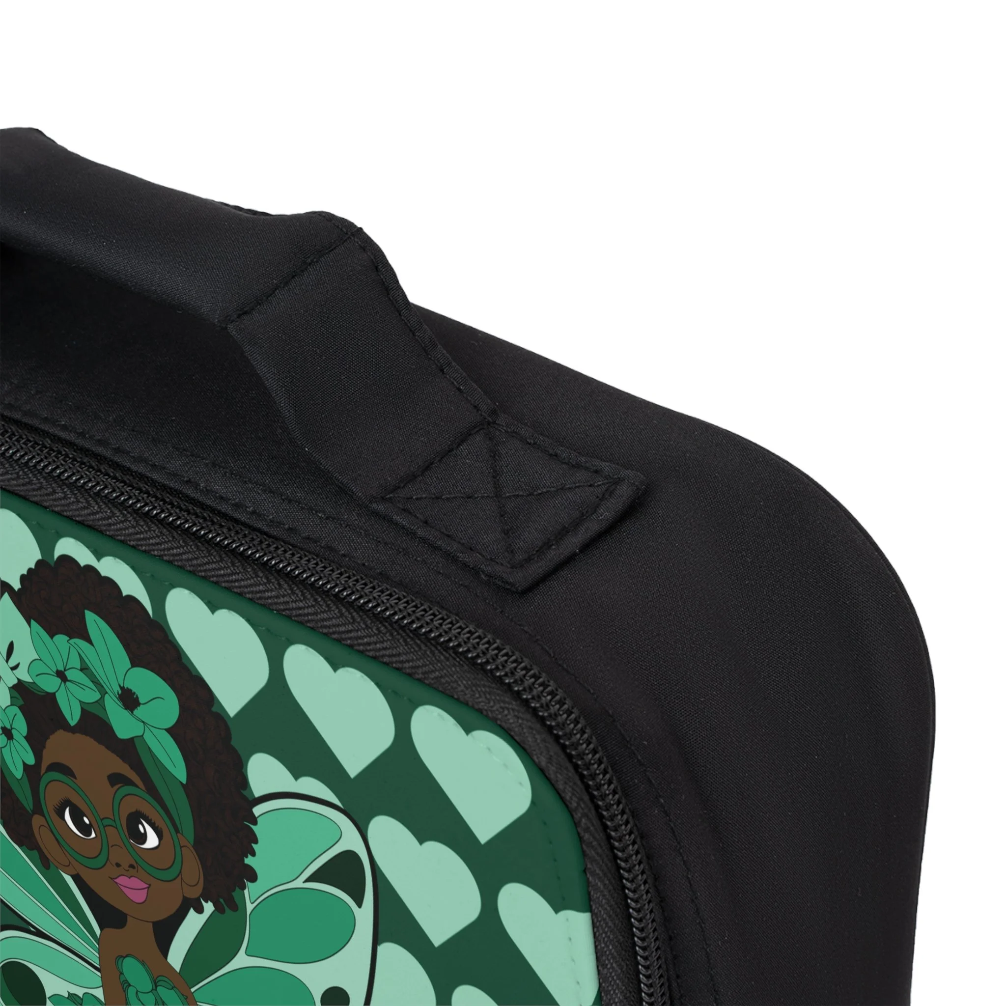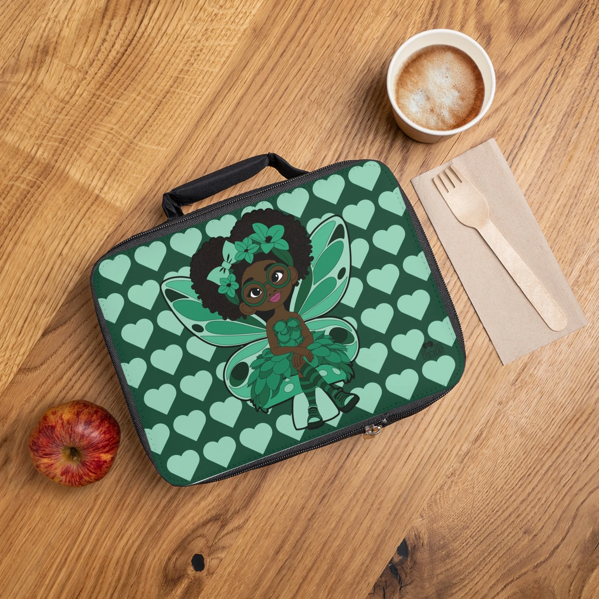The Brilliant Bailey Lunch Bag from Coco Pixies brings bold personality and thoughtful design together in one standout accessory. Featuring Brilliant Bailey seated confidently against a rich green heart-patterned background, this lunch bag celebrates intelligence, creativity, and self-assured style. From the layered leaf-inspired outfit to her signature afro puffs and glasses, Bailey’s look is both playful and empowering—perfectly paired with a practical, everyday carry.