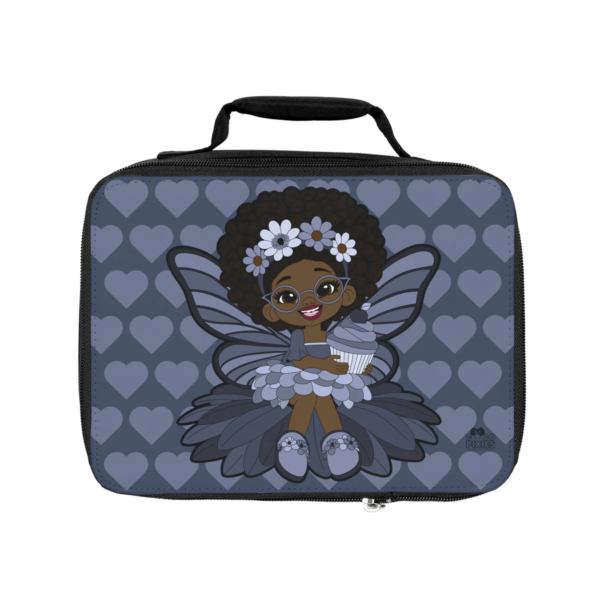 Bubbly Brooke brings charm, sweetness, and standout style to this Coco Pixies lunch bag, designed to make everyday moments feel a little more special. Featuring Brooke’s signature afro puffs, soft floral crown, delicate wings, and a coordinated heart-pattern background, this bag balances playful character art with a polished, modern palette. The structured shape, smooth zip closure, and easy-carry handle make it both practical and eye-catching—perfect for school days, outings, or anywhere snacks need to travel in style.