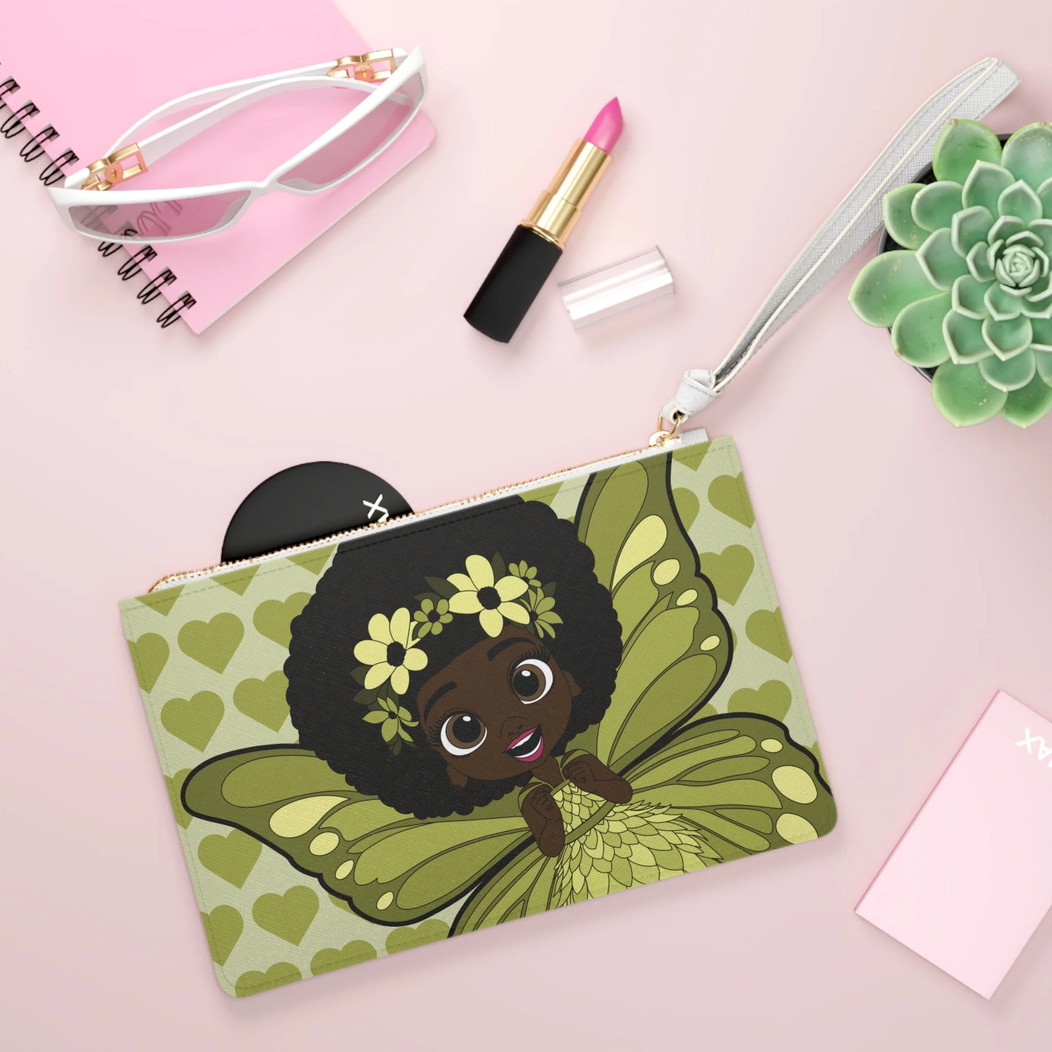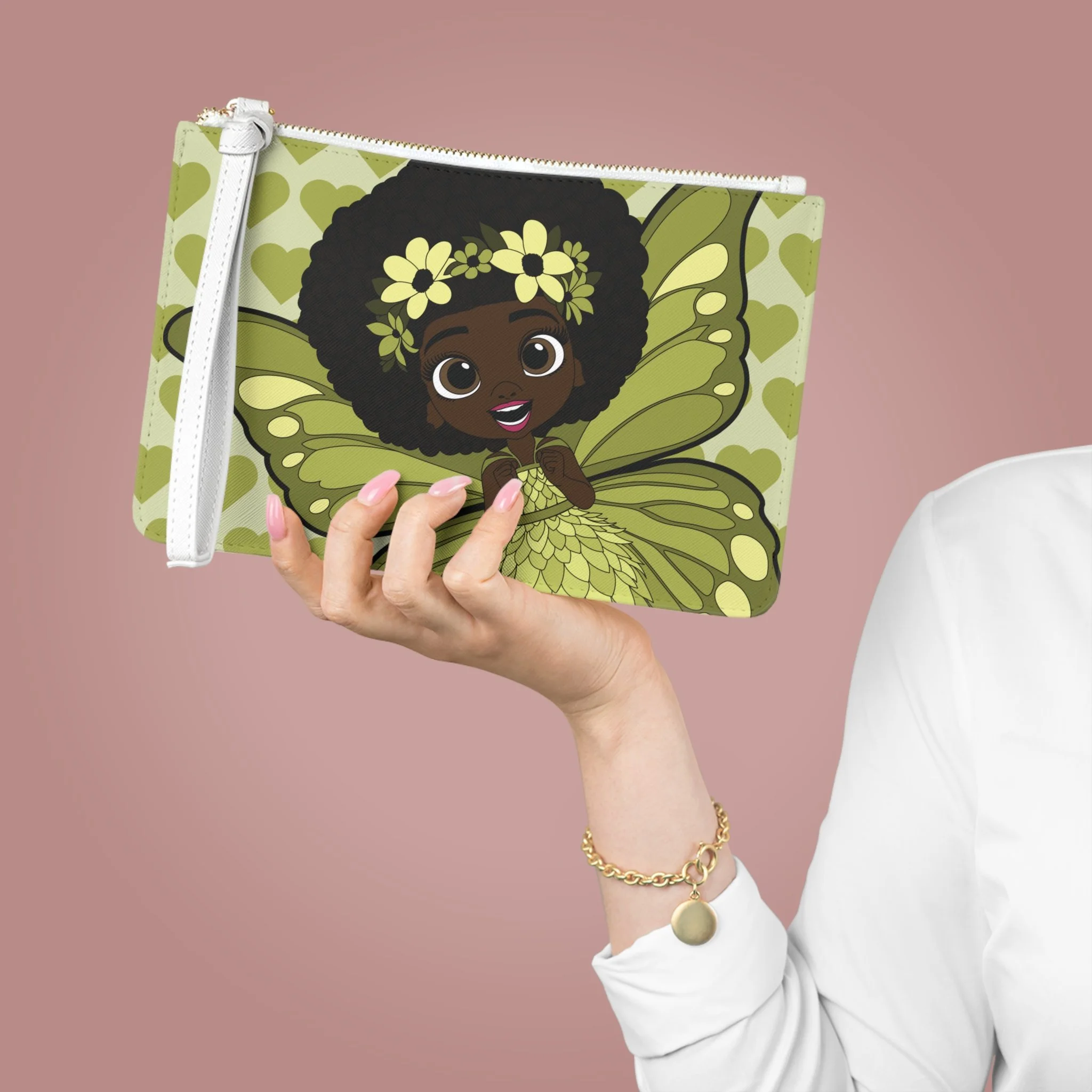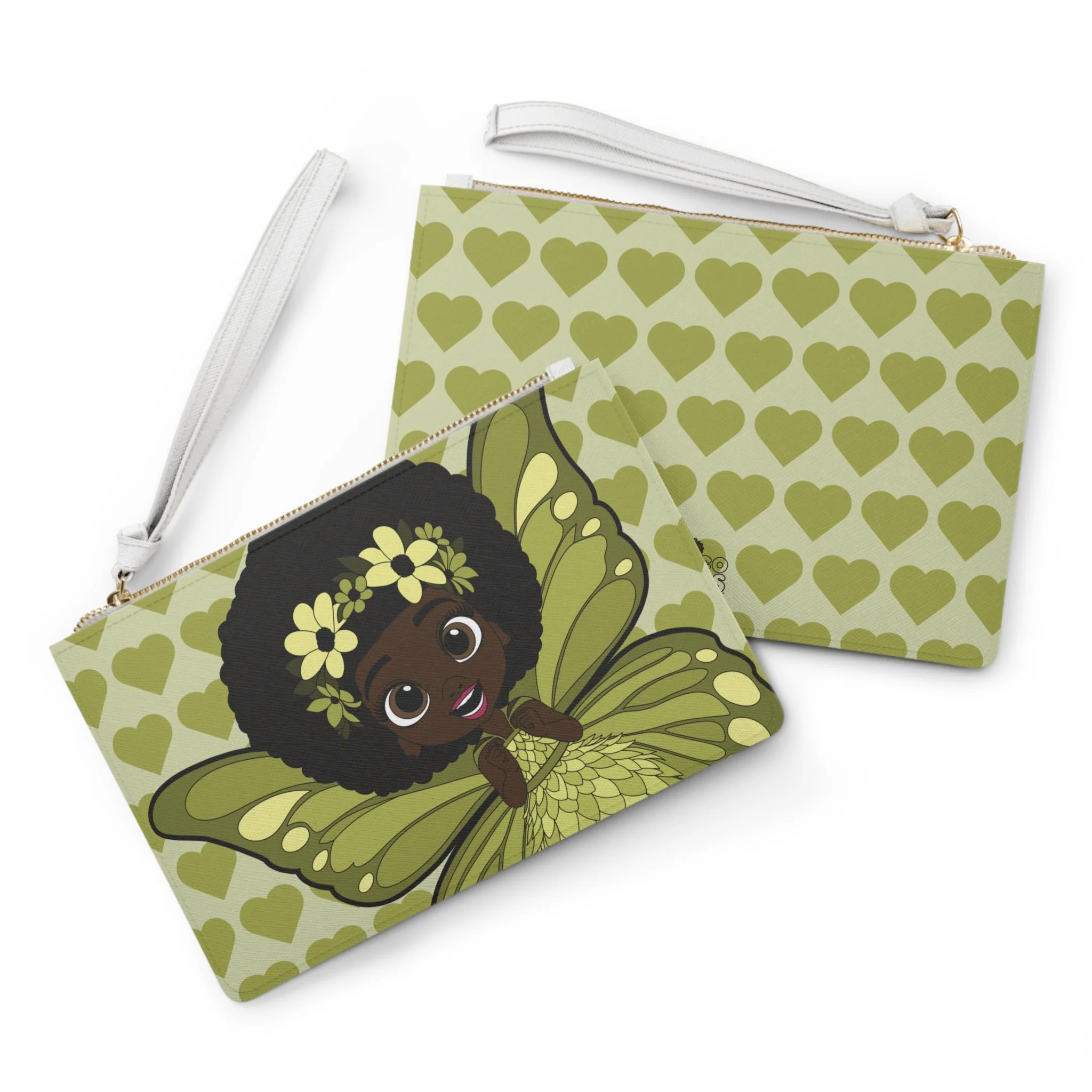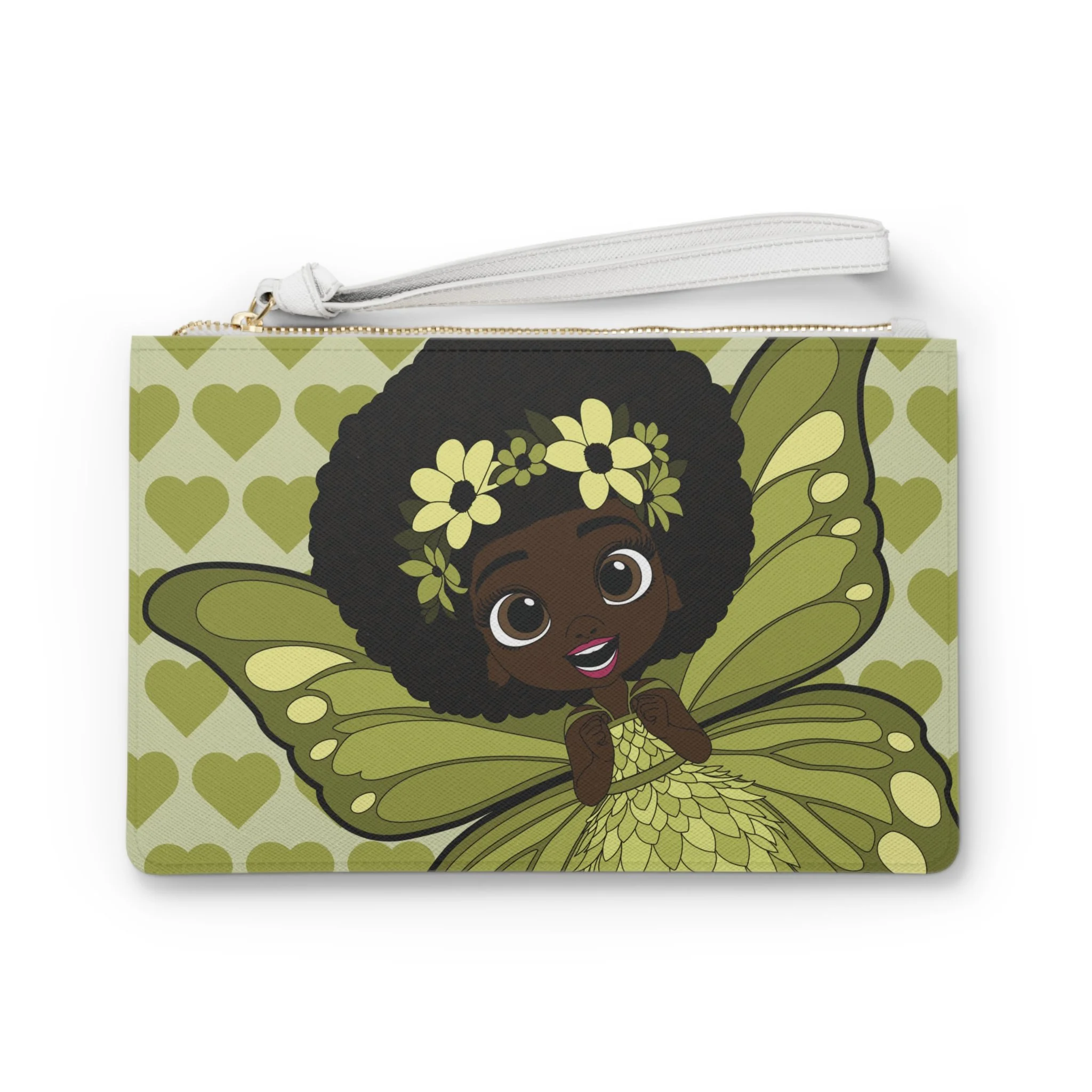 Say hello to Cheerful Charlotte, a bright and lovable pixie from the Coco Pixies collection, featured front and center on this beautifully illustrated clutch bag. Dressed in layered shades of green with softly detailed wings, floral accents, and a heart-filled backdrop, Cheerful Charlotte brings warmth, confidence, and personality to an accessory designed for everyday adventures. This clutch blends playful storytelling with practical design, making it both expressive and easy to carry.