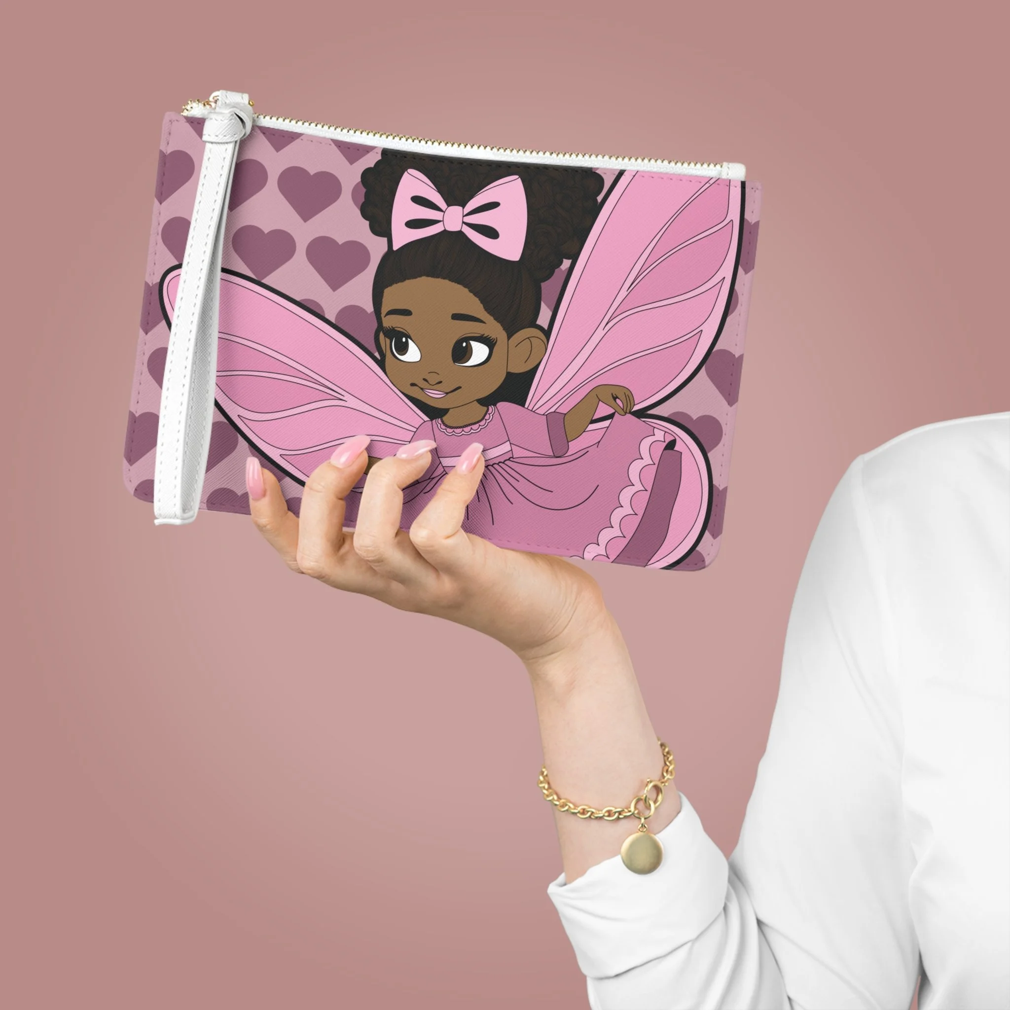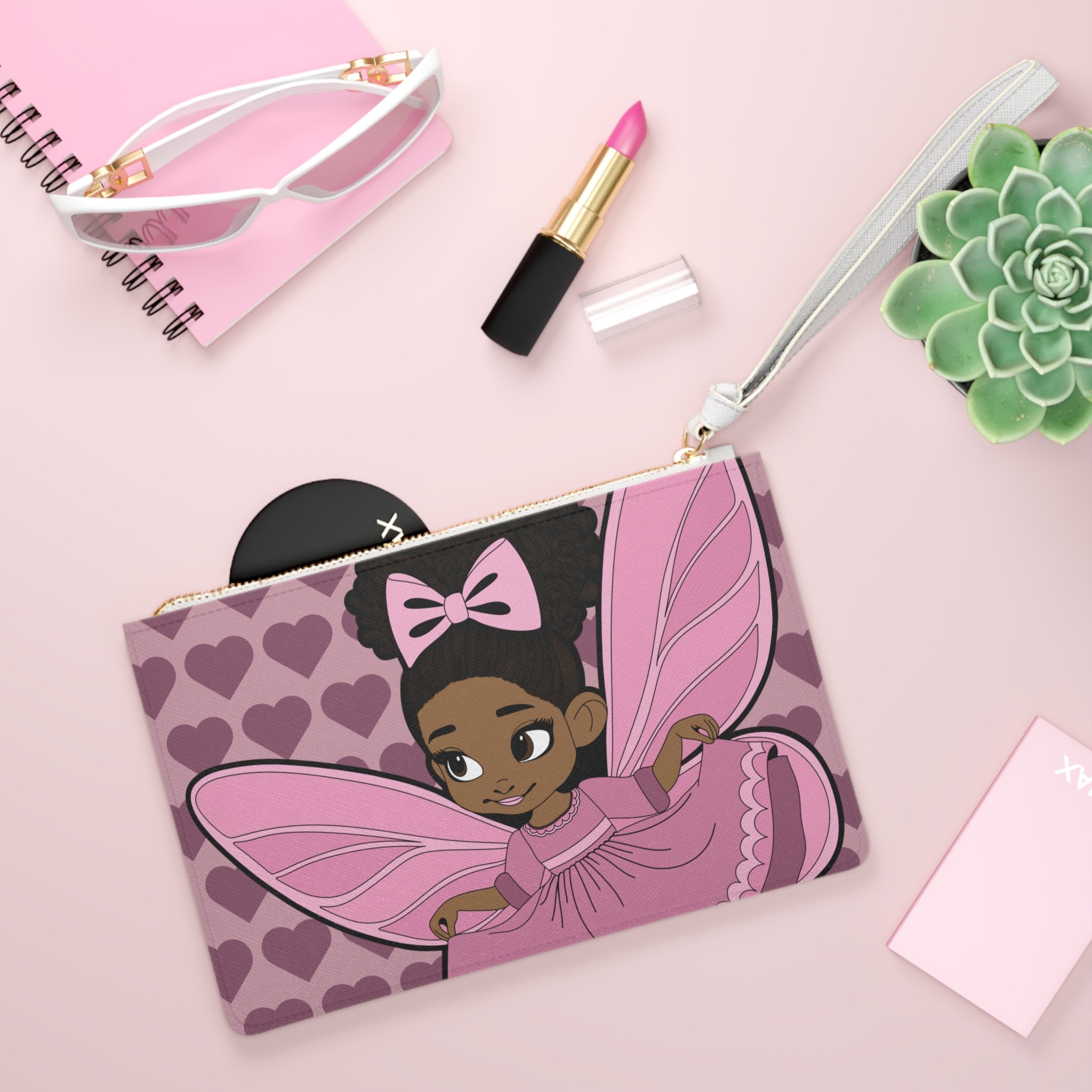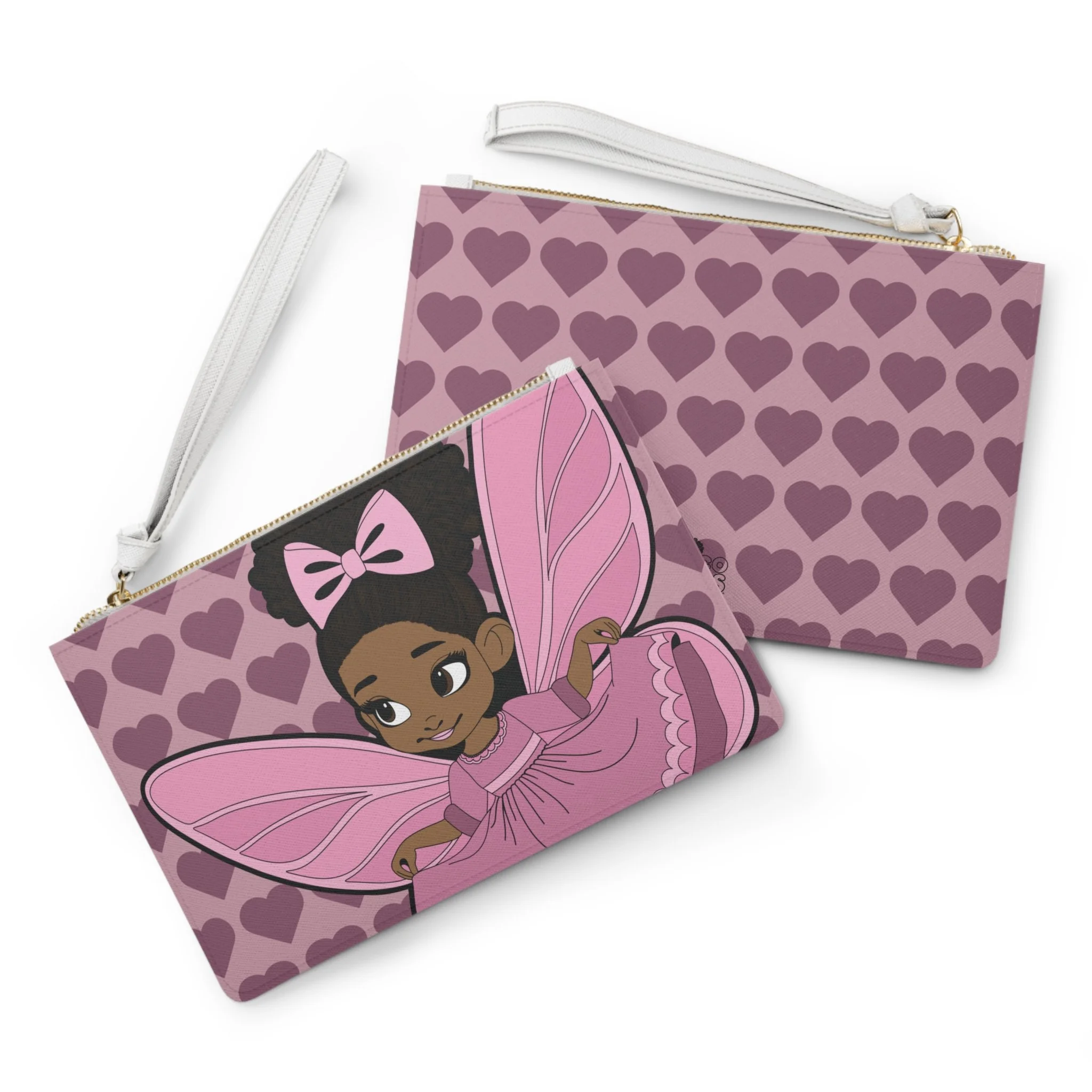 Sweet, stylish, and full of personality, the Darling Daphne Clutch Bag from Coco Pixies captures a soft, storybook moment with a modern twist. Daphne is illustrated mid-twirl in a rosy pink dress, her delicate wings extended against a signature heart-patterned background. With her bow-topped afro puffs and gentle expression, Darling Daphne brings a polished yet playful presence to this charming wristlet, designed for everyday adventures and special moments alike.
