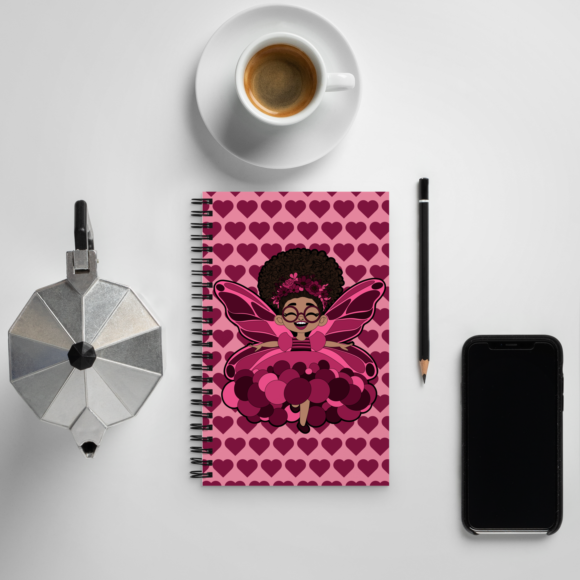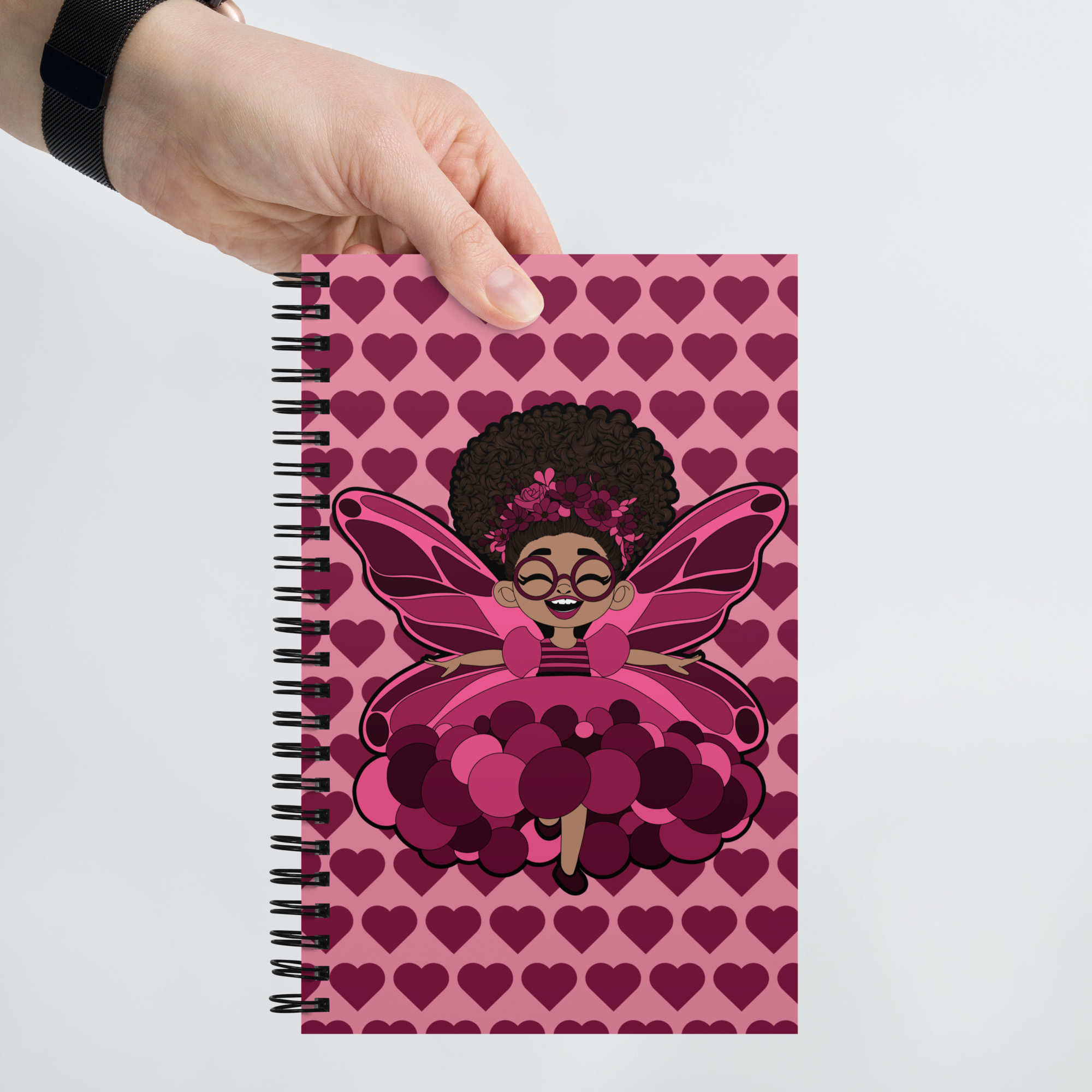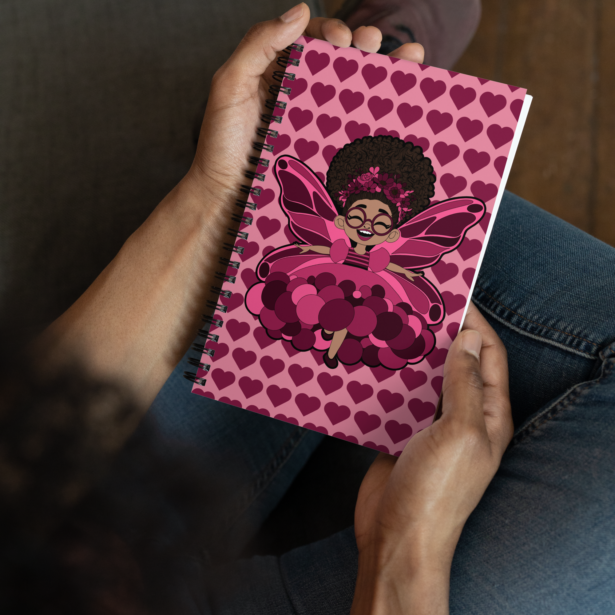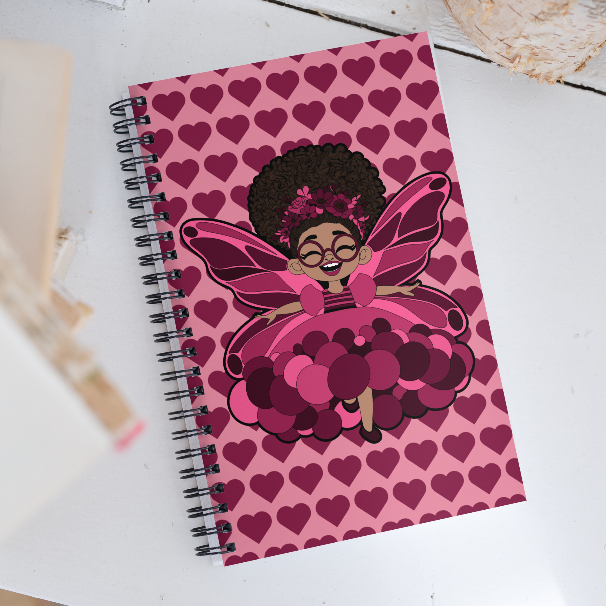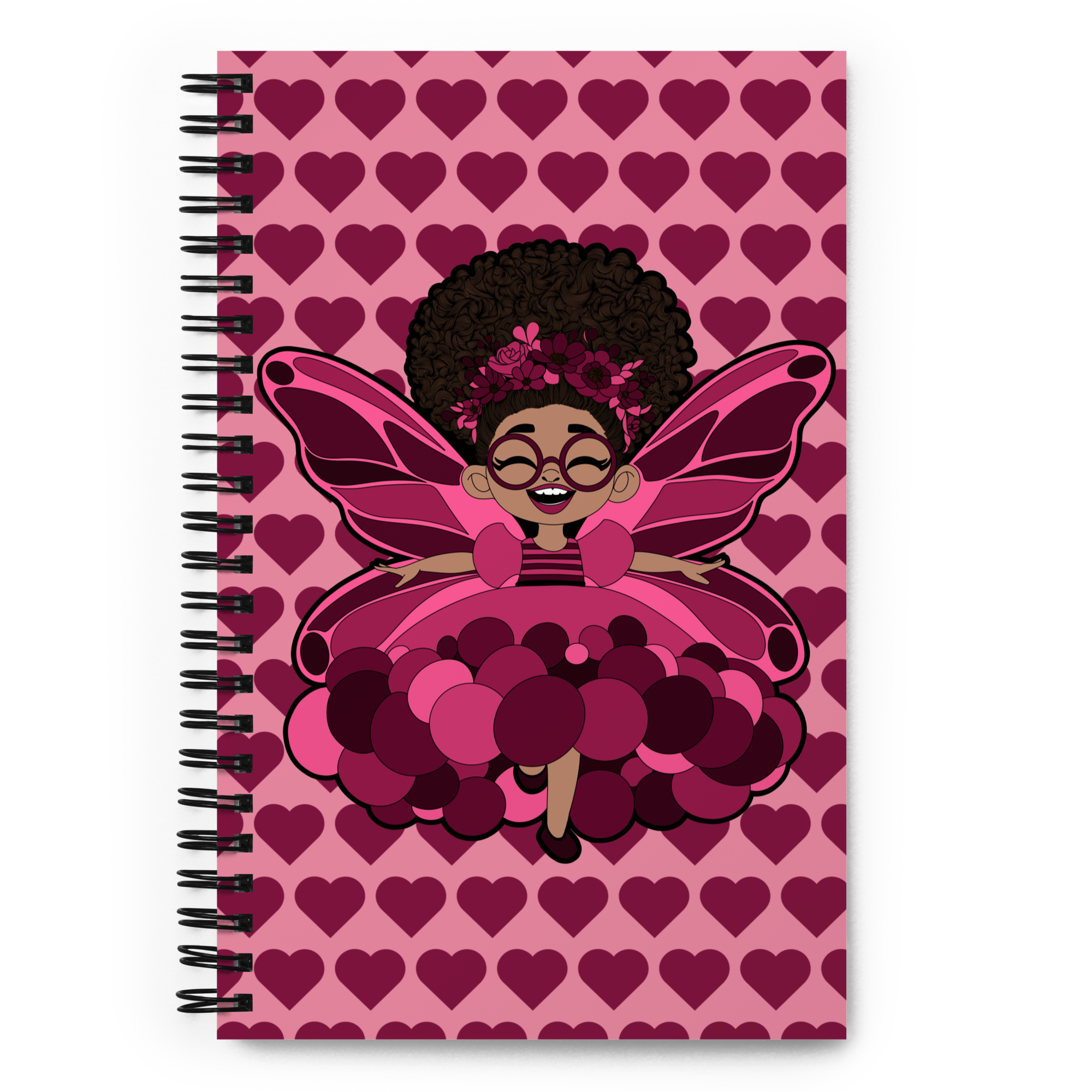 Delightful Daisy by Coco Pixies turns every page into a celebration of confidence and color. Set against a playful pink backdrop filled with bold berry hearts, Daisy floats front and center in layered shades of rose and raspberry. Her signature afro puff crowned with florals, oversized glasses, and radiant smile make this notebook as expressive as the girl who carries it.
