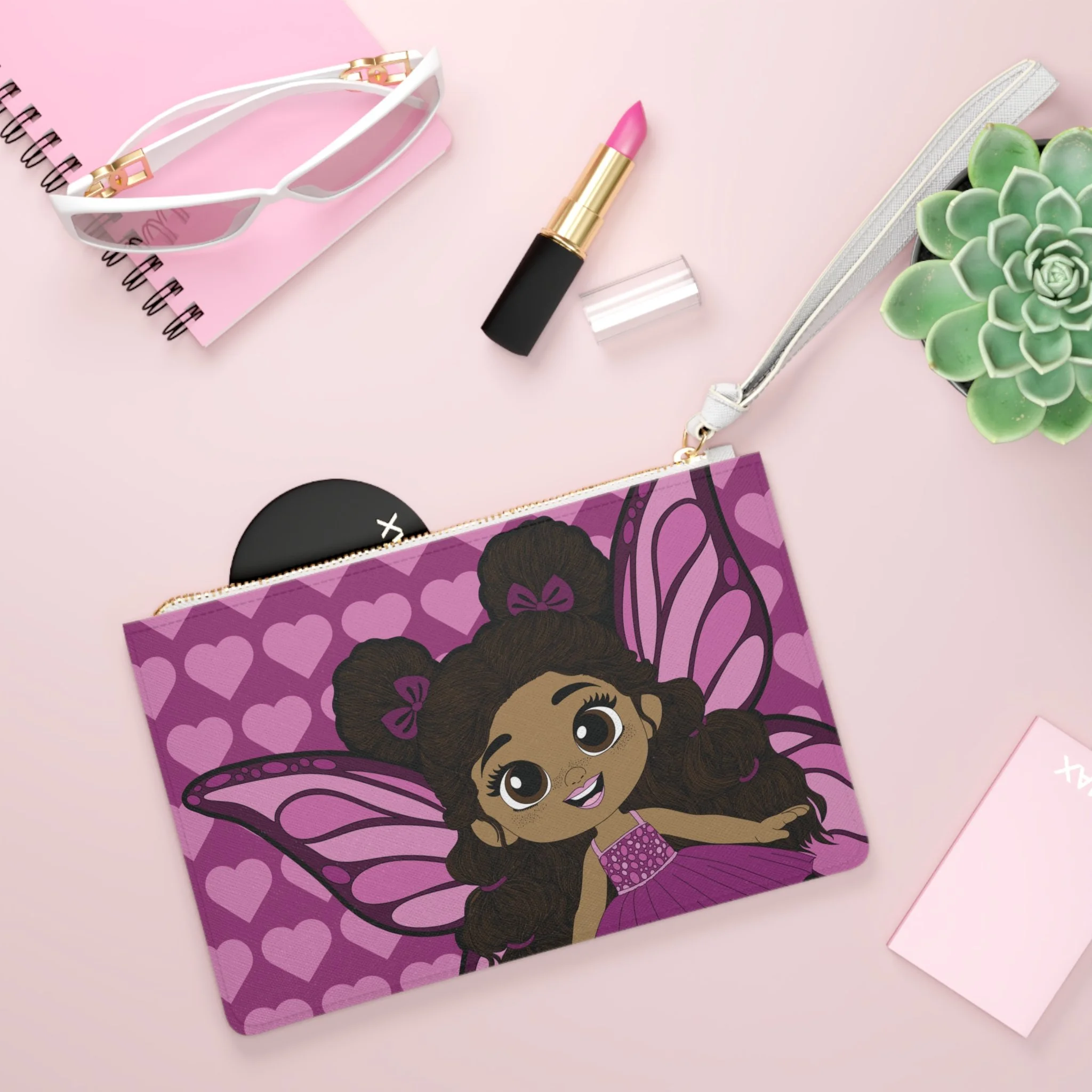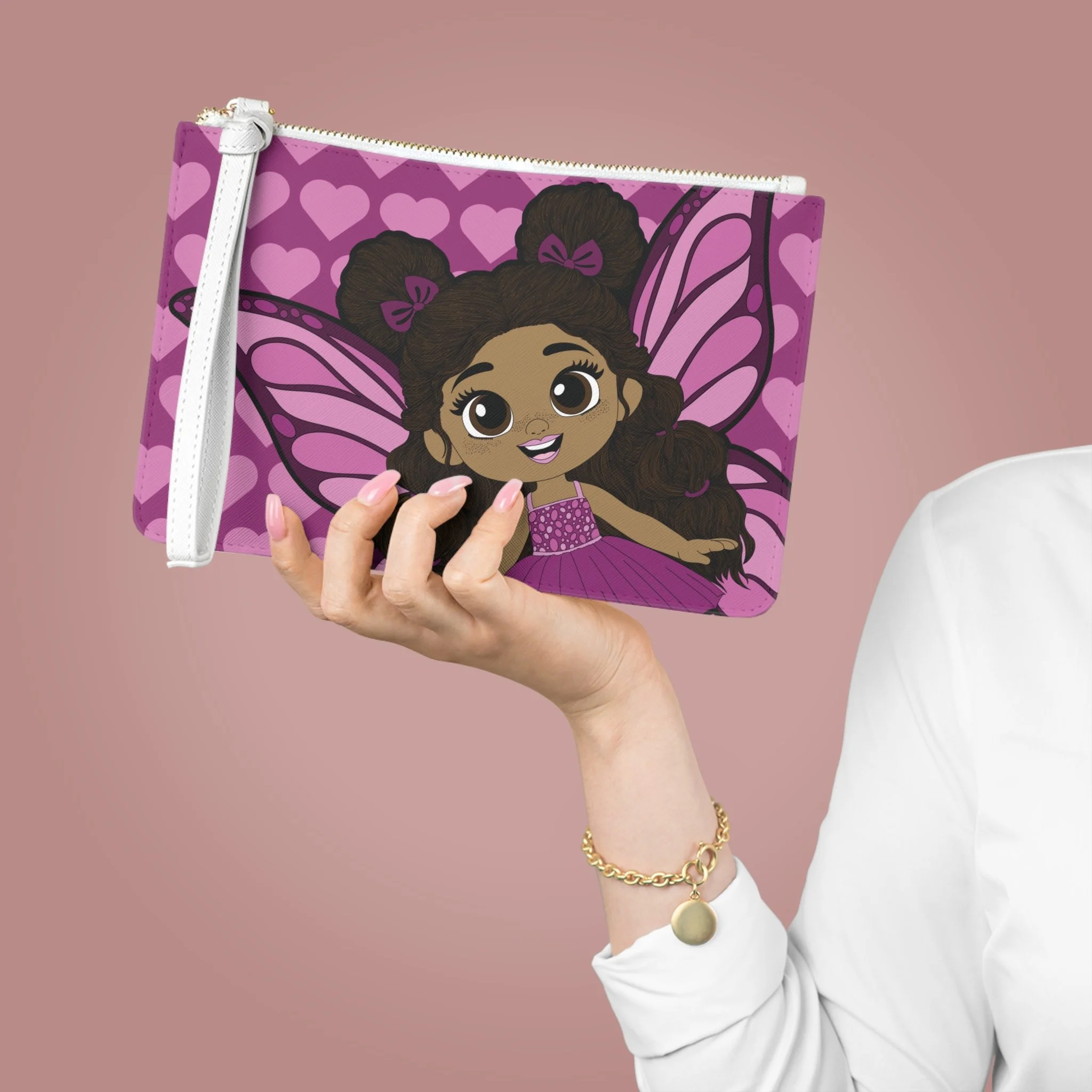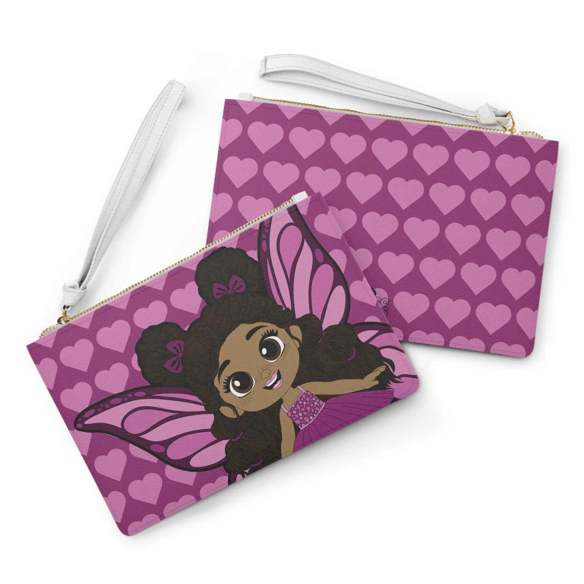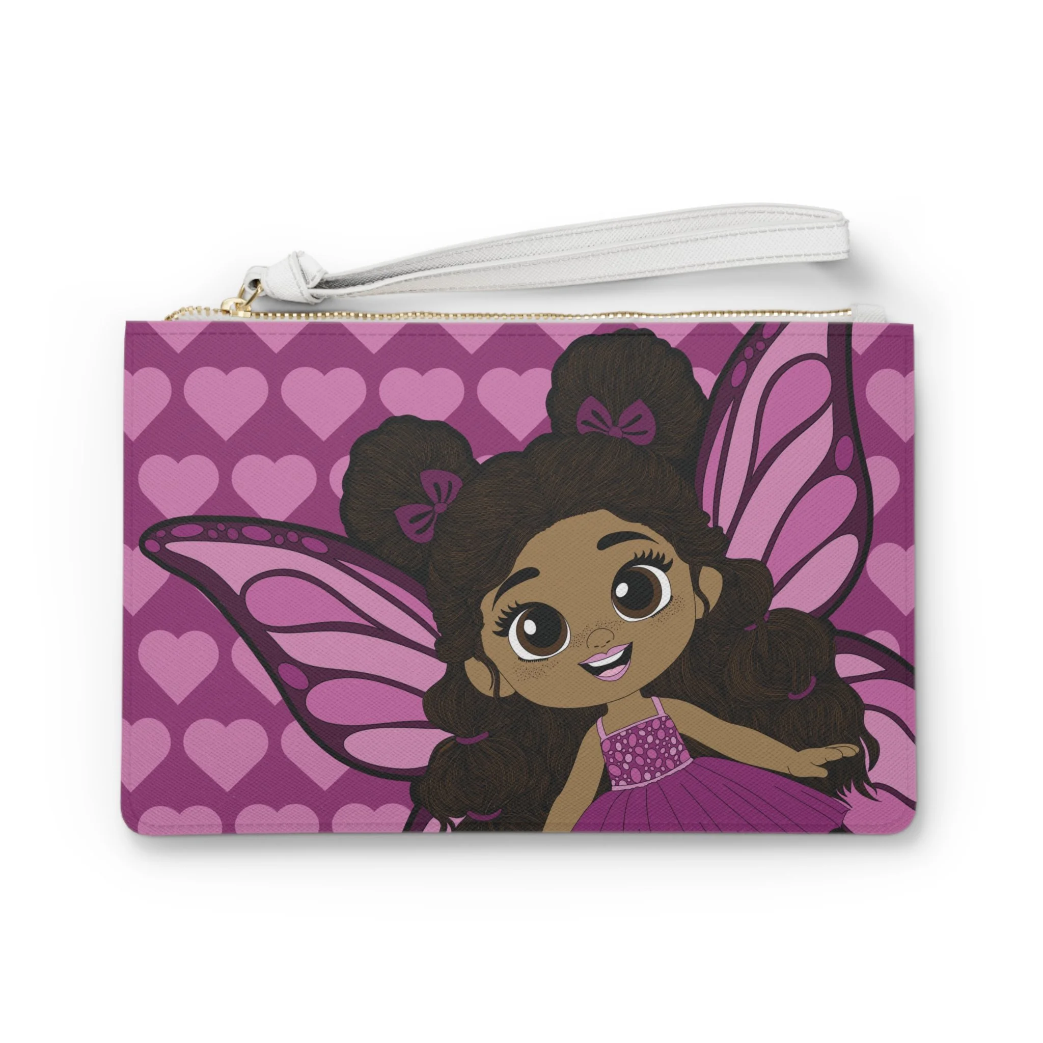 Say hello to the Fiona Flutter Clutch Bag from the Coco Pixies collection, a bright and lovable accessory bursting with personality. Featuring Fiona Flutter front and center, this clutch showcases her soft pink wings, heart-filled backdrop, and adorable curls styled into fluffy puffs with bow accents. The rich pink palette and expressive illustration make this clutch feel playful, confident, and full of charm.