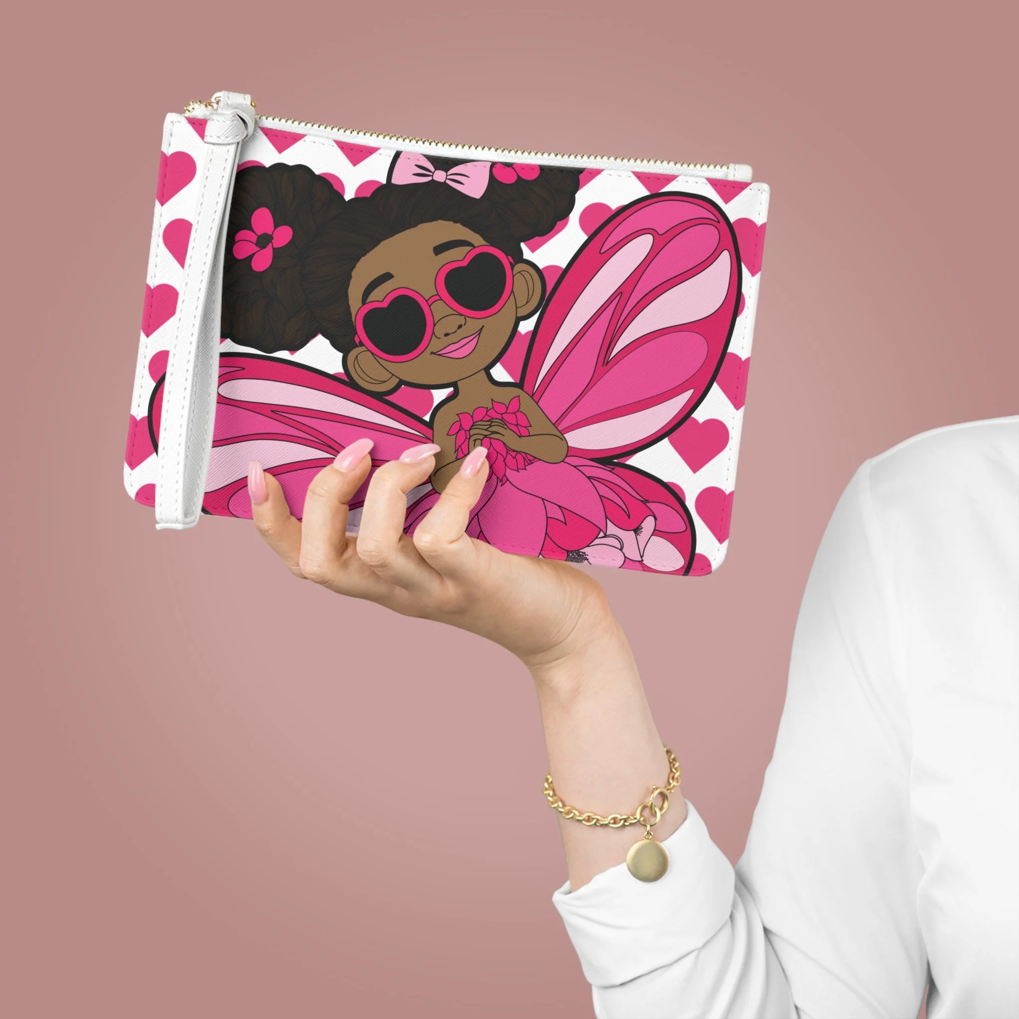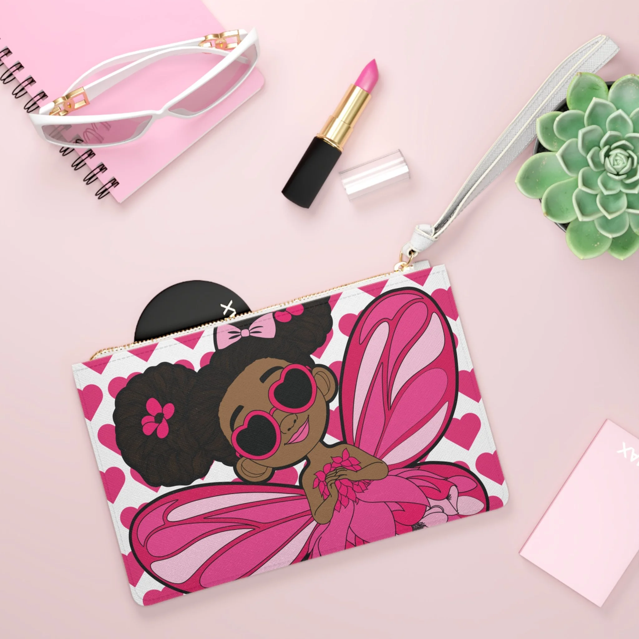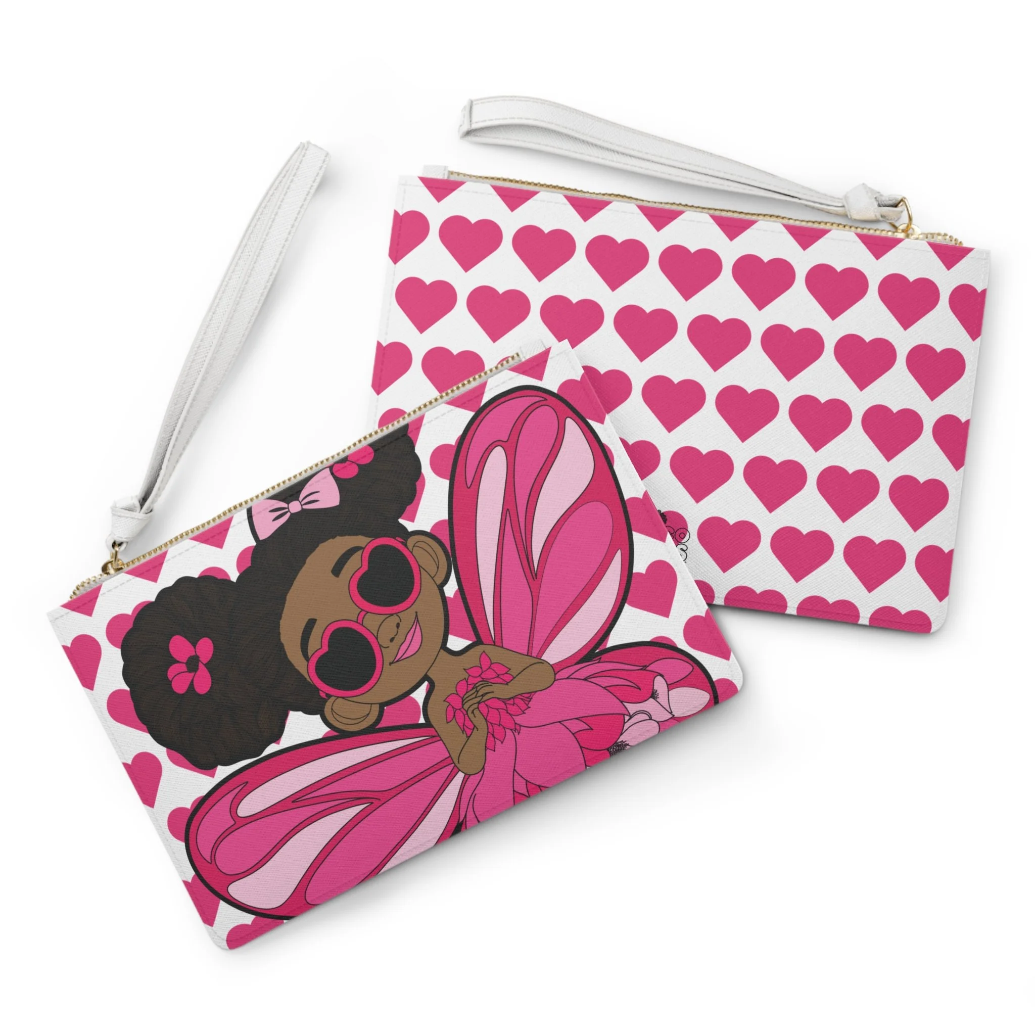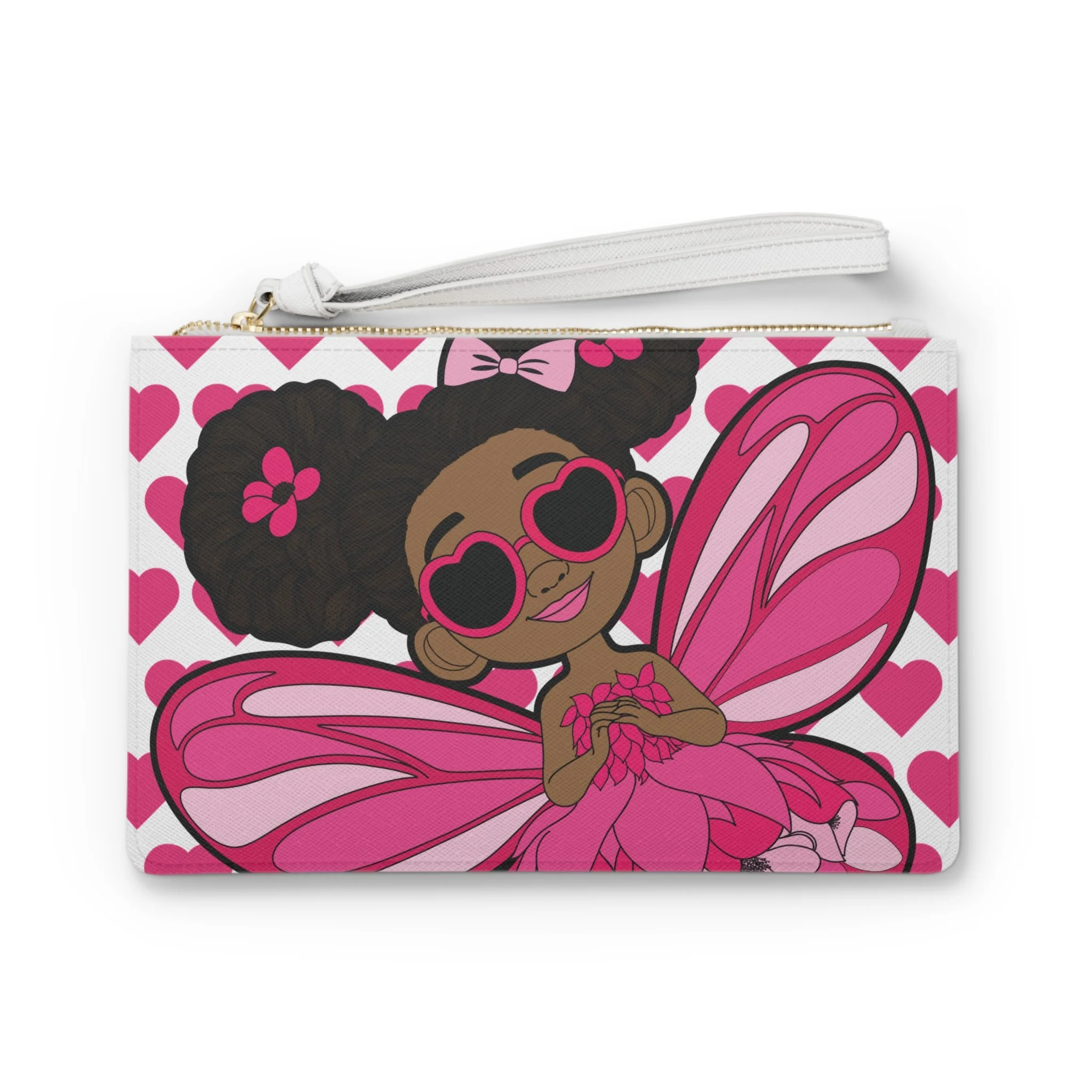 Meet the Glitzy Gracelynn Clutch Bag from the Coco Pixies collection, where confidence sparkles and style takes flight. Featuring Gracelynn with her bold afro puffs, heart-shaped sunglasses, and shimmering pink pixie wings, this clutch is all about personality. The playful heart-pattern background and vibrant pink palette make it a standout accessory that feels expressive, fun, and unapologetically fabulous.