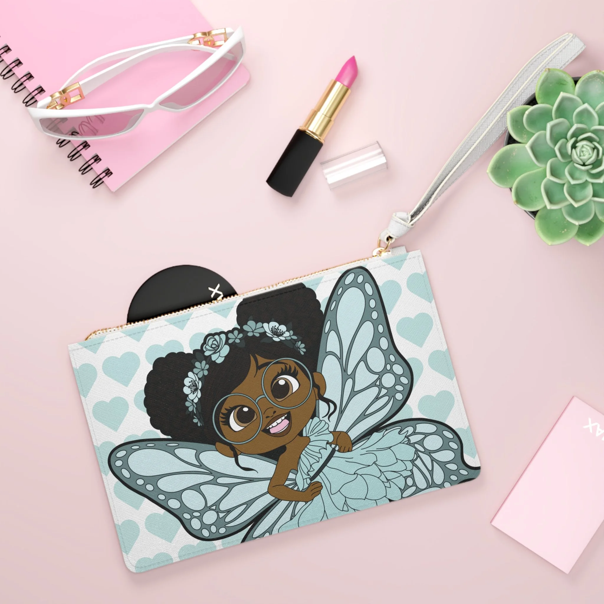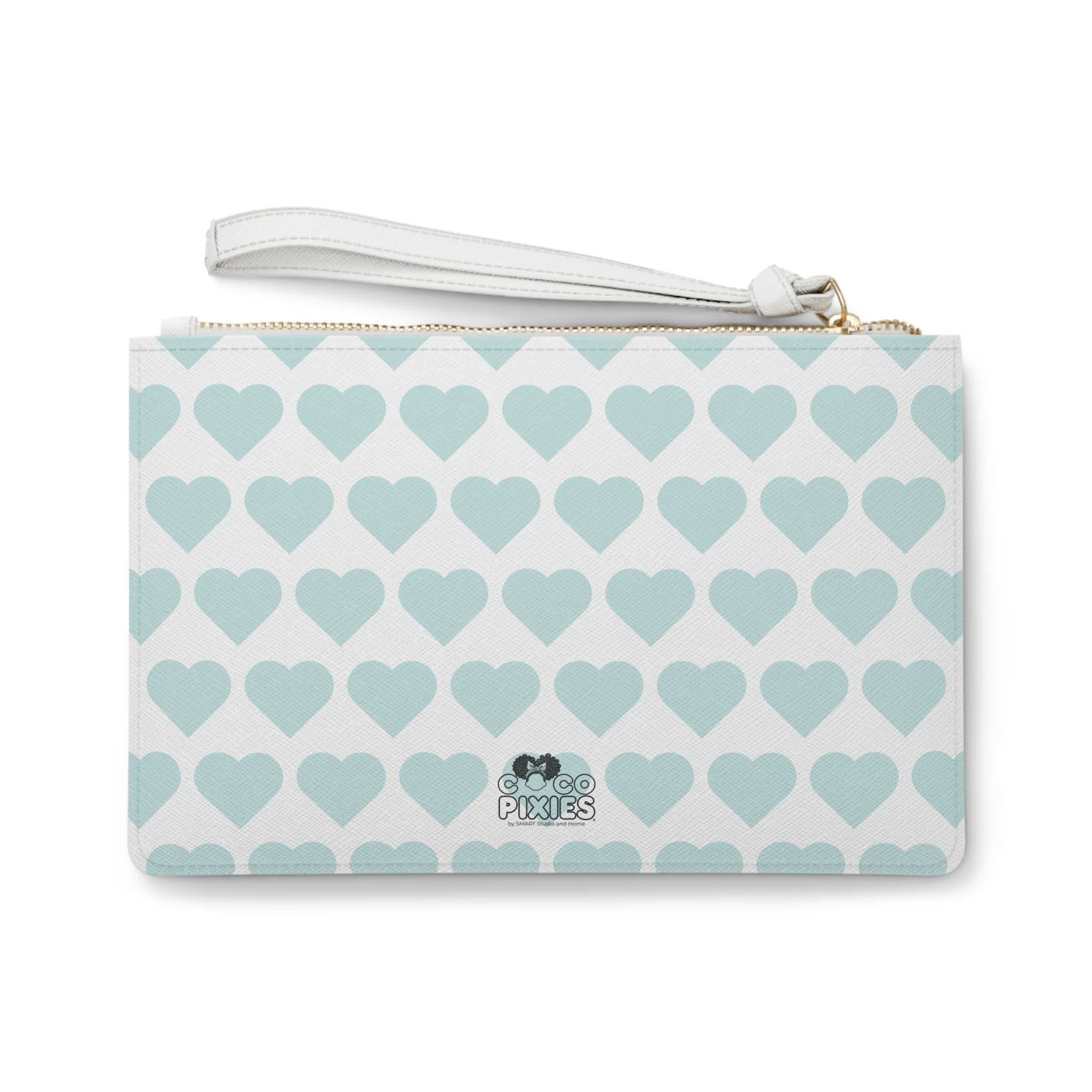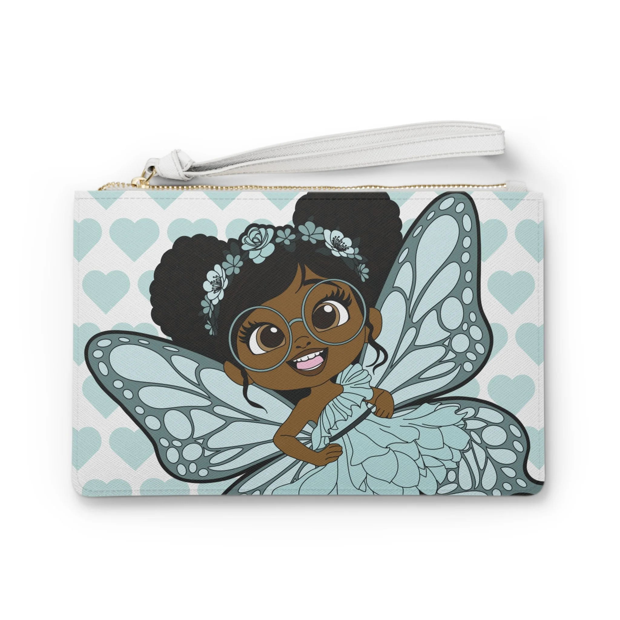 Playful detail meets polished style in the JoJo Jollypuff Pixie Clutch Bag from Coco Pixies. This standout accessory features a bold close-up of JoJo Jollypuff, highlighting her signature double Afro puffs, oversized glasses, and confident expression. Set against a soft aqua signature heart pattern, her delicately detailed wings and layered petal-inspired dress create a design that feels both expressive and elevated. It’s a statement piece that adds personality without sacrificing versatility.