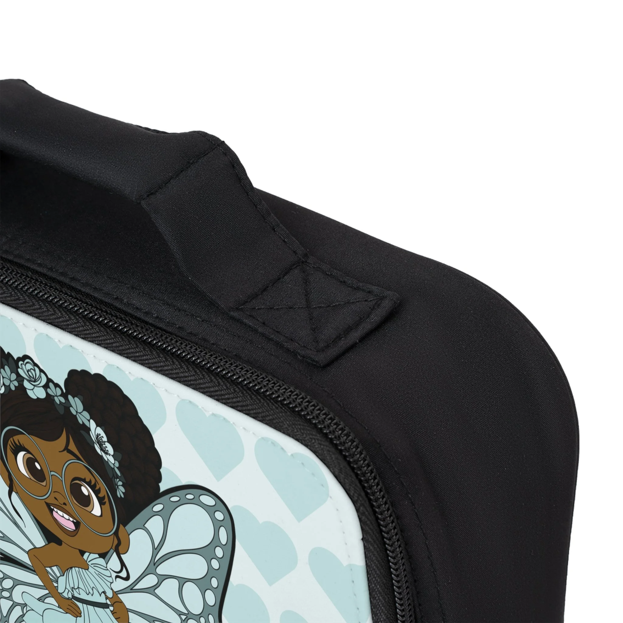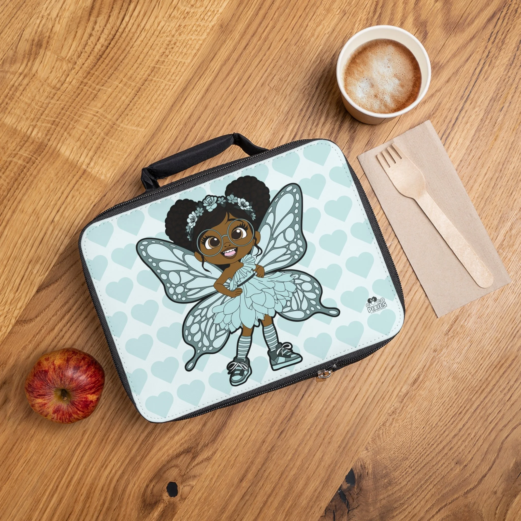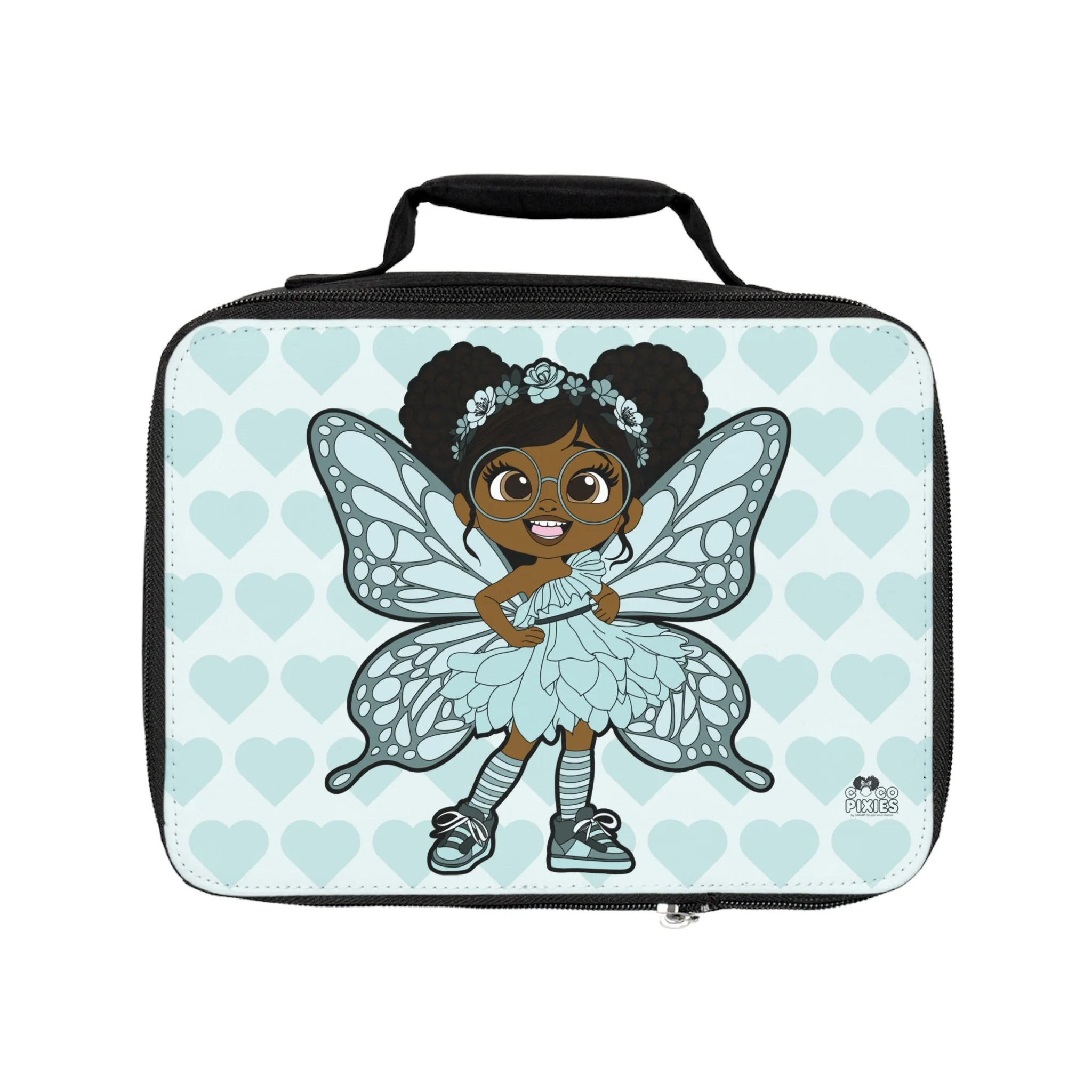 Bright, bold, and full of personality, the JoJo Jollypuff Pixie Lunch Bag from Coco Pixies turns every mealtime into a stylish moment. Featuring JoJo Jollypuff front and center, this design showcases her signature double Afro puffs, oversized glasses, and confident stance. Set against a soft aqua heart pattern, her detailed wings and layered petal-inspired dress create a playful yet polished look that stands out in any lunchroom.