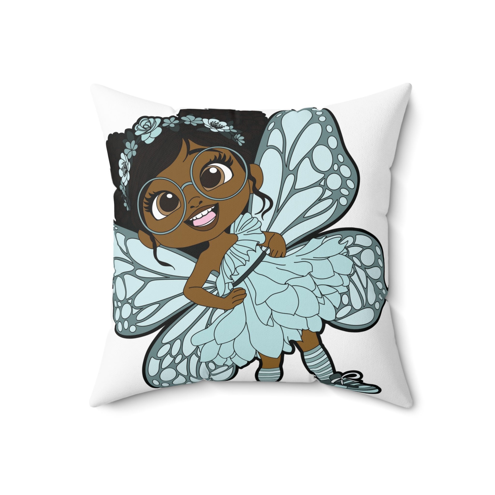 JoJo Jollypuff Pixie Pillow from Coco Pixies delivers a soft, stylish accent with personality that instantly brightens any space. Set against a crisp white backdrop, JoJo’s expressive eyes, oversized glasses, and signature double Afro puffs take center stage, complemented by her airy blue tones and intricately detailed wings. The design feels fresh, playful, and polished—perfect for adding character without overwhelming your décor.