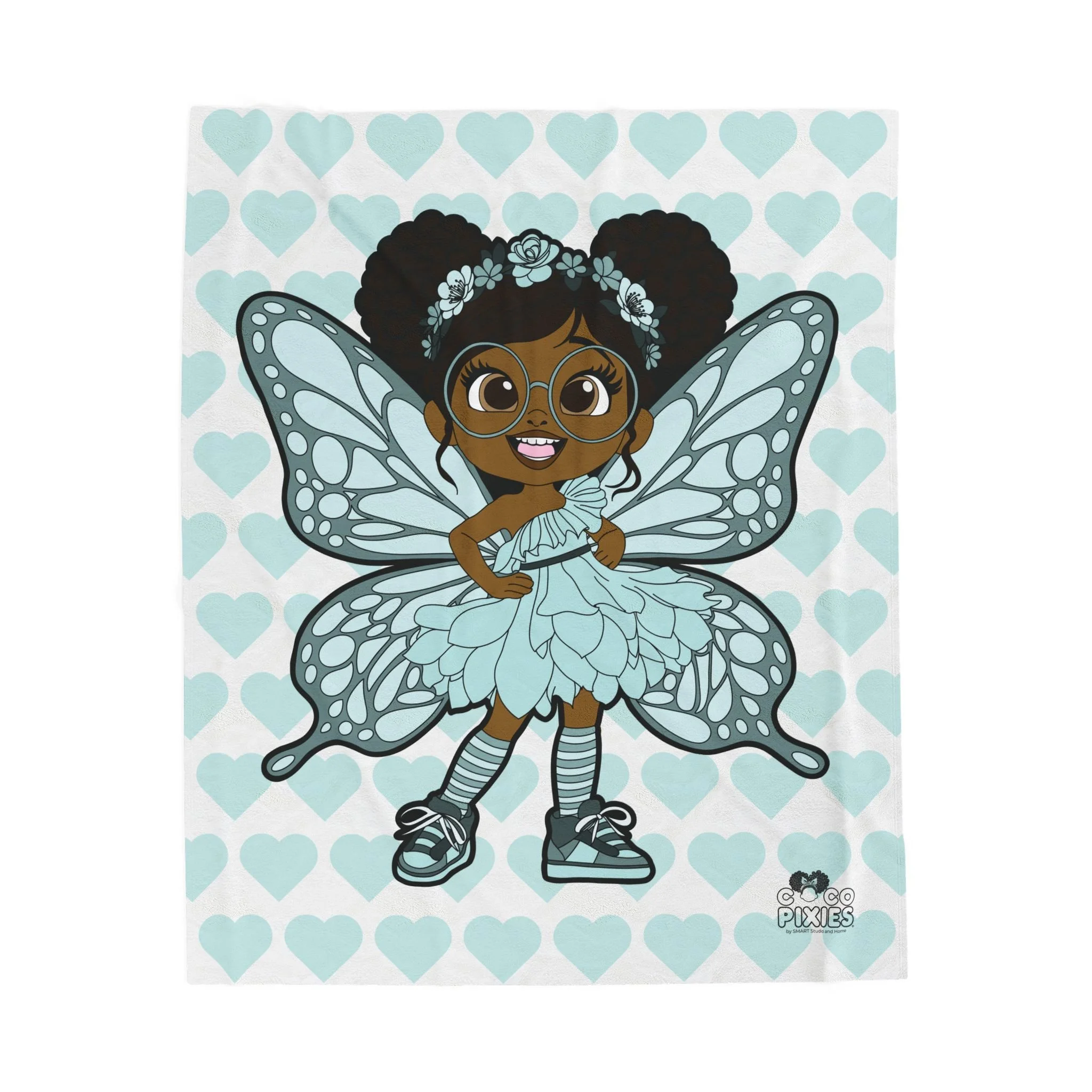 JoJo Jollypuff Pixie Velveteen Plush Blanket from Coco Pixies blends soft comfort with standout personality. Set against a signature mint heart background, this design highlights JoJo’s confident stance, oversized glasses, and double Afro puffs adorned with delicate florals. The airy blue tones and detailed wings create a light, stylish look that instantly elevates any room while delivering that ultra-cozy feel you reach for again and again.
