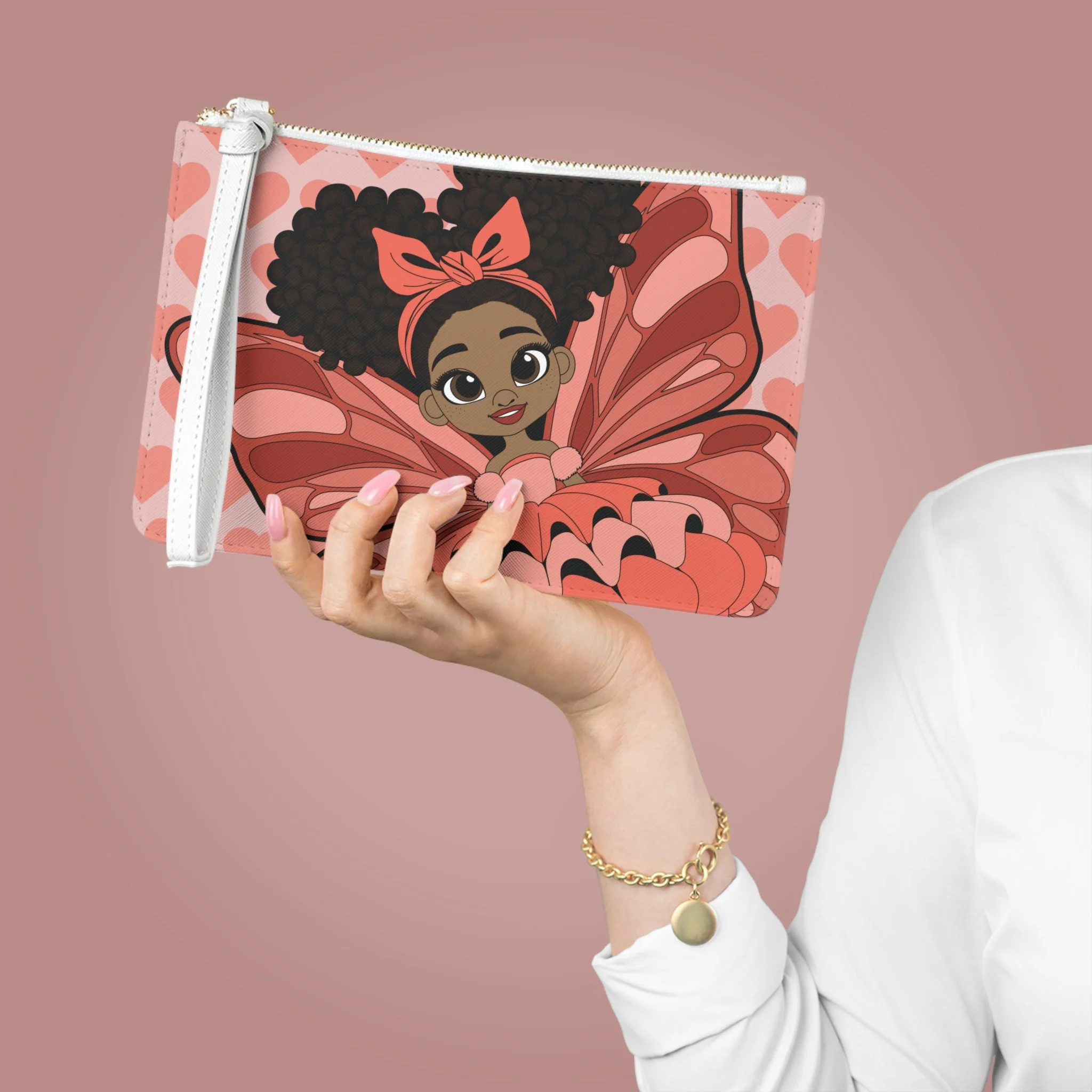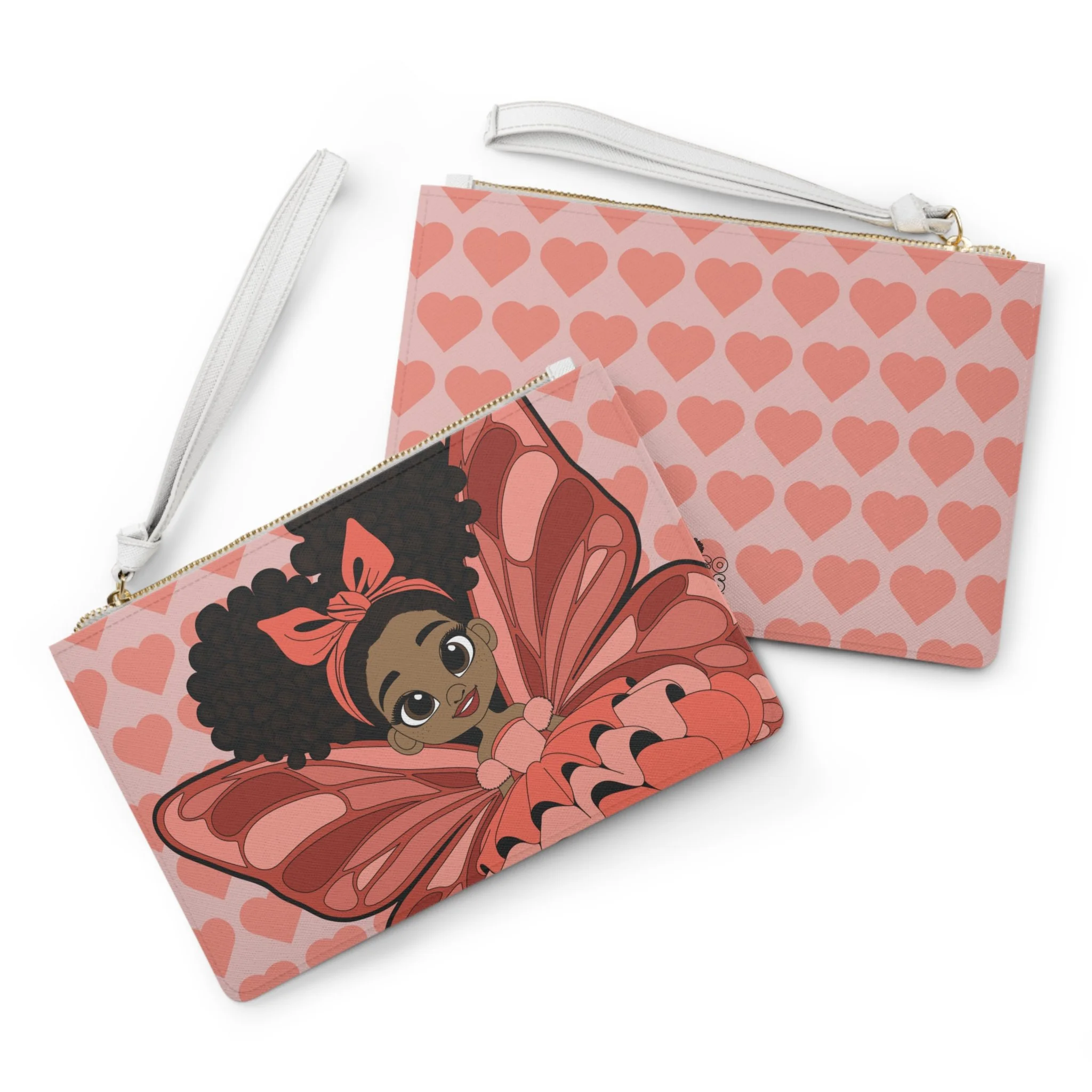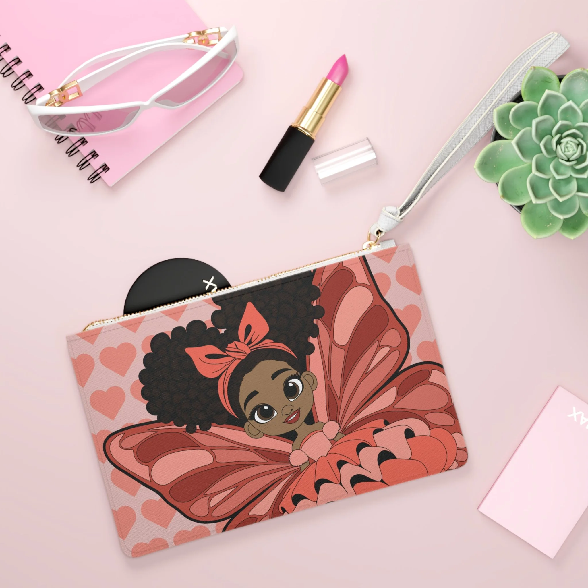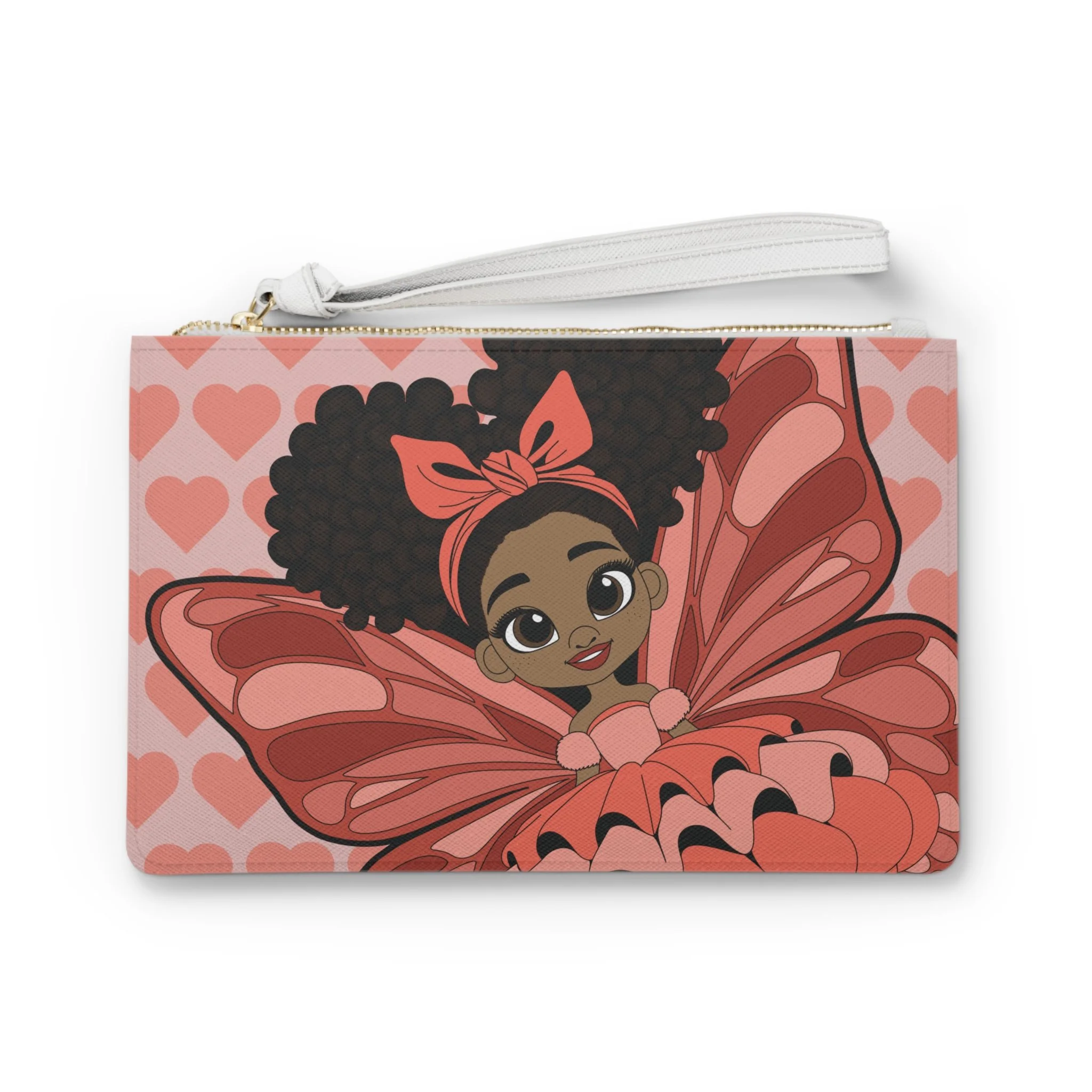 Sweet, stylish, and full of heart, the Lovely Layla Clutch Bag brings gentle confidence to the Coco Pixies collection. Featuring Lovely Layla with her signature afro puffs, soft bow, and beautifully layered pixie wings, this clutch is set against a charming heart-pattern background in warm blush and coral tones. It’s a playful yet polished accessory designed to carry small essentials while showcasing personality and imagination.