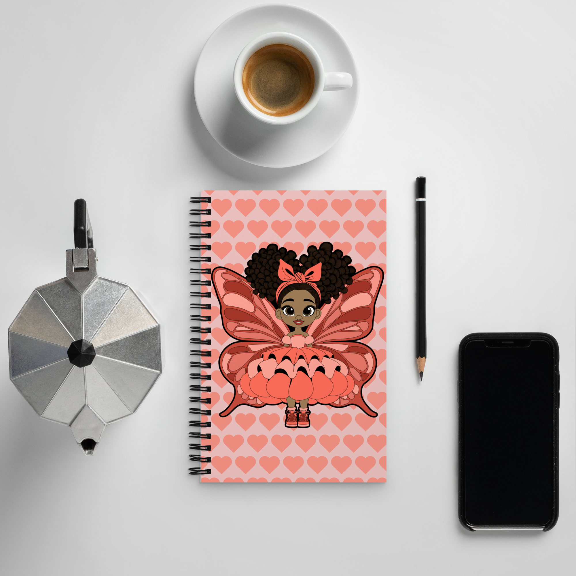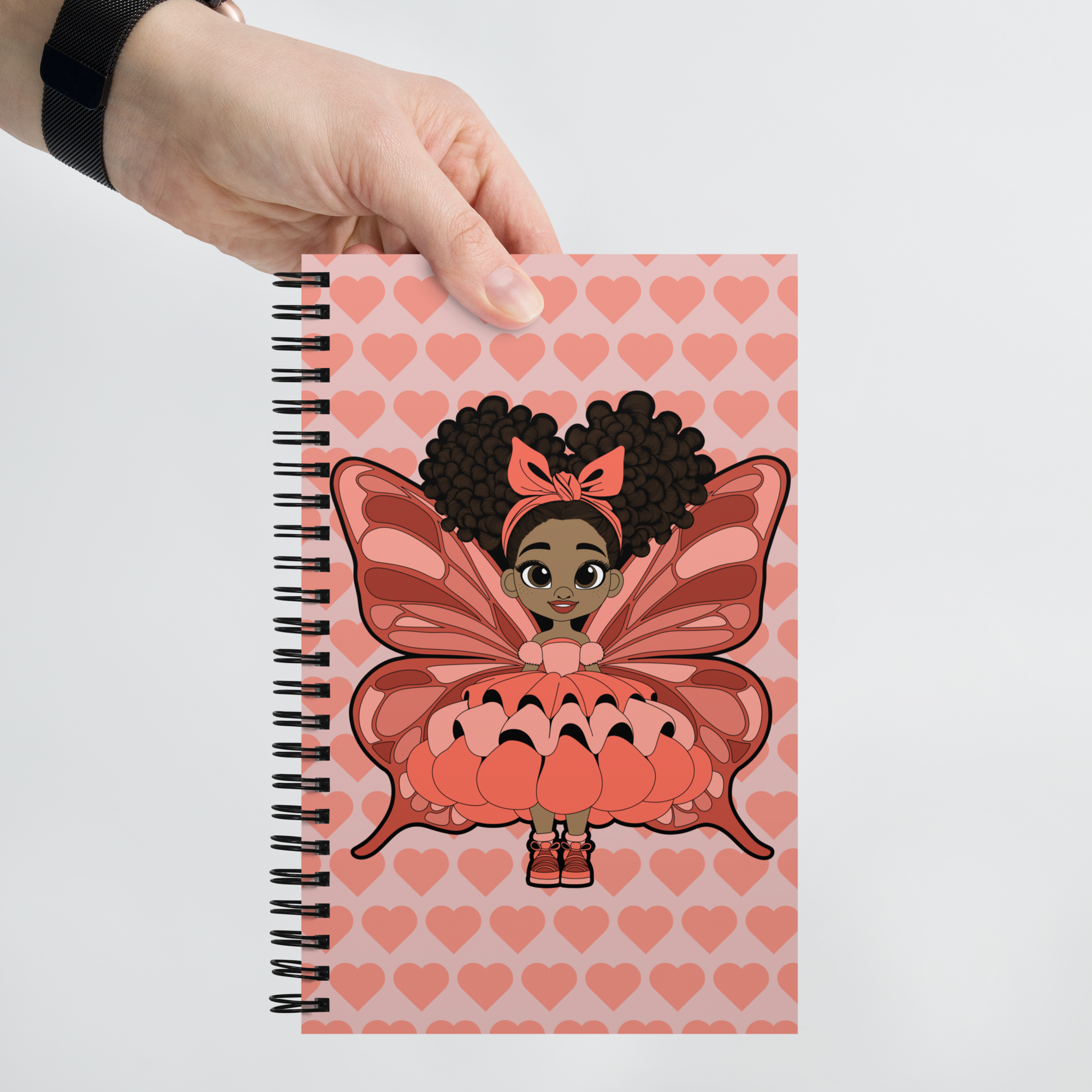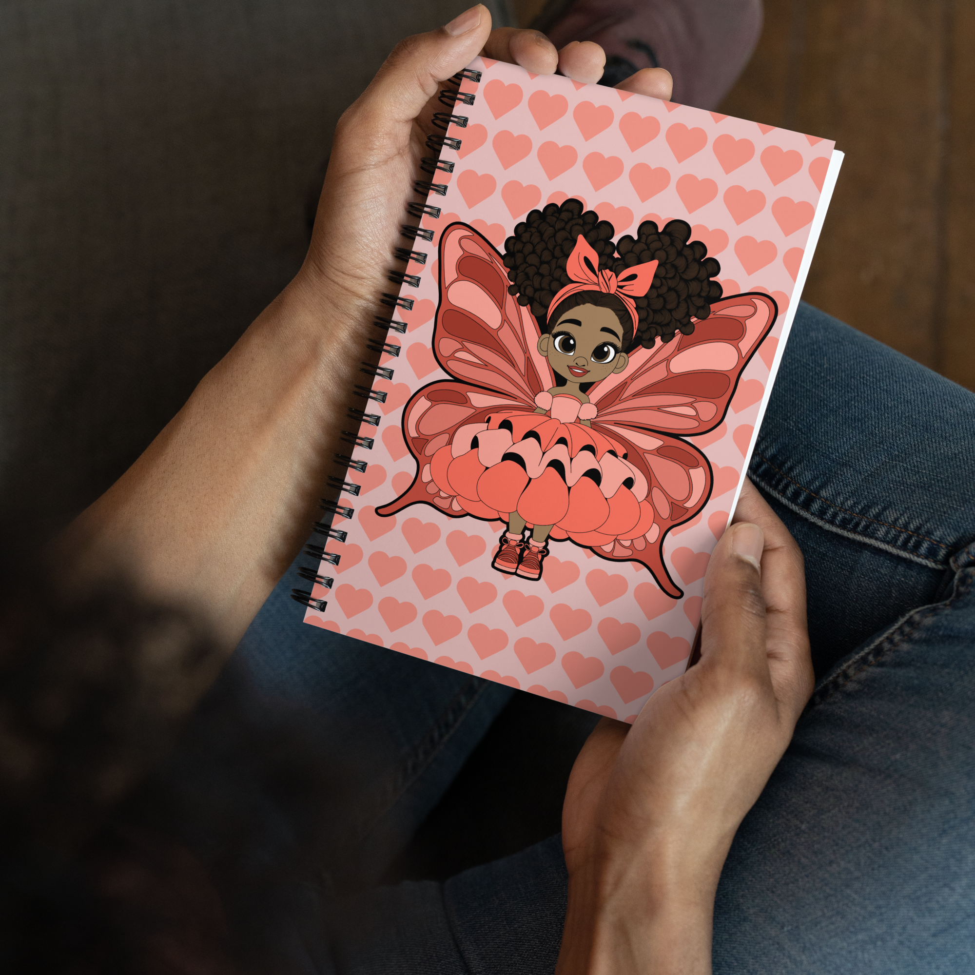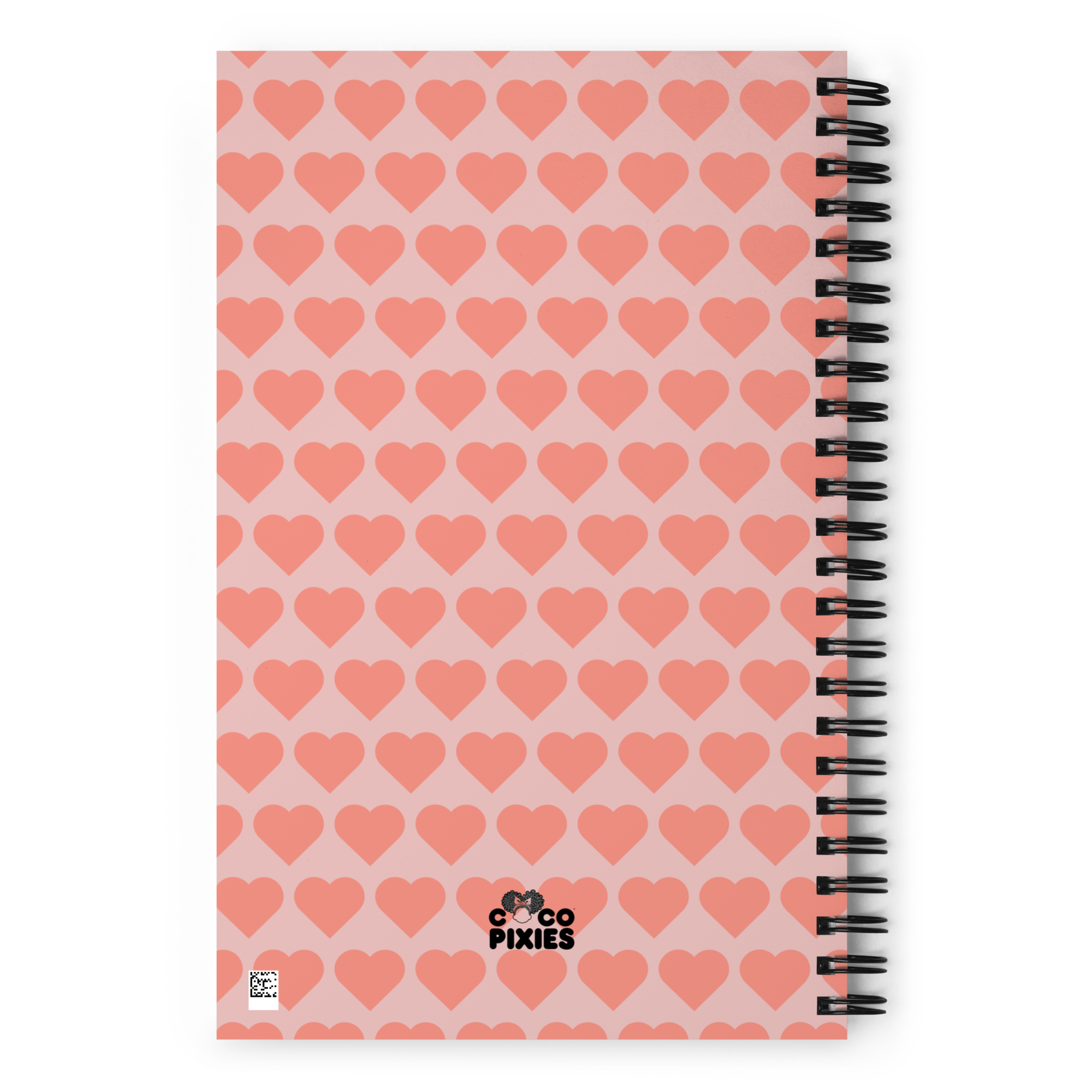 Lovely Layla brings soft confidence and sweet sophistication to every page of this Coco Pixies notebook. Wrapped in a blush pink backdrop with a repeating heart pattern, Lovely Layla shines in coral-toned wings, a layered petal-inspired dress, matching bow, and coordinating sneakers. Her bold afro puffs and warm smile create a cover design that feels playful, polished, and full of personality—perfect for girls who love expressing themselves in style.