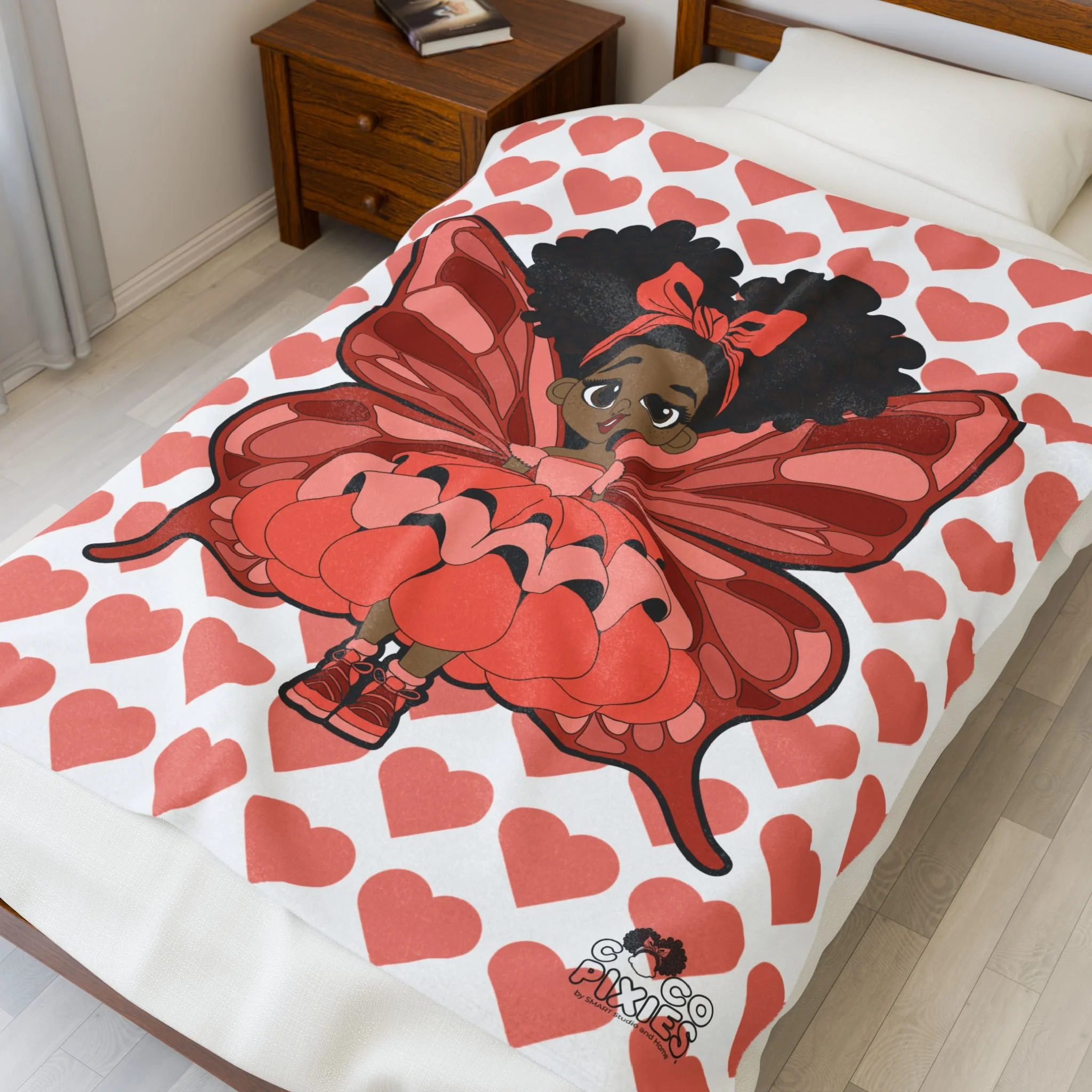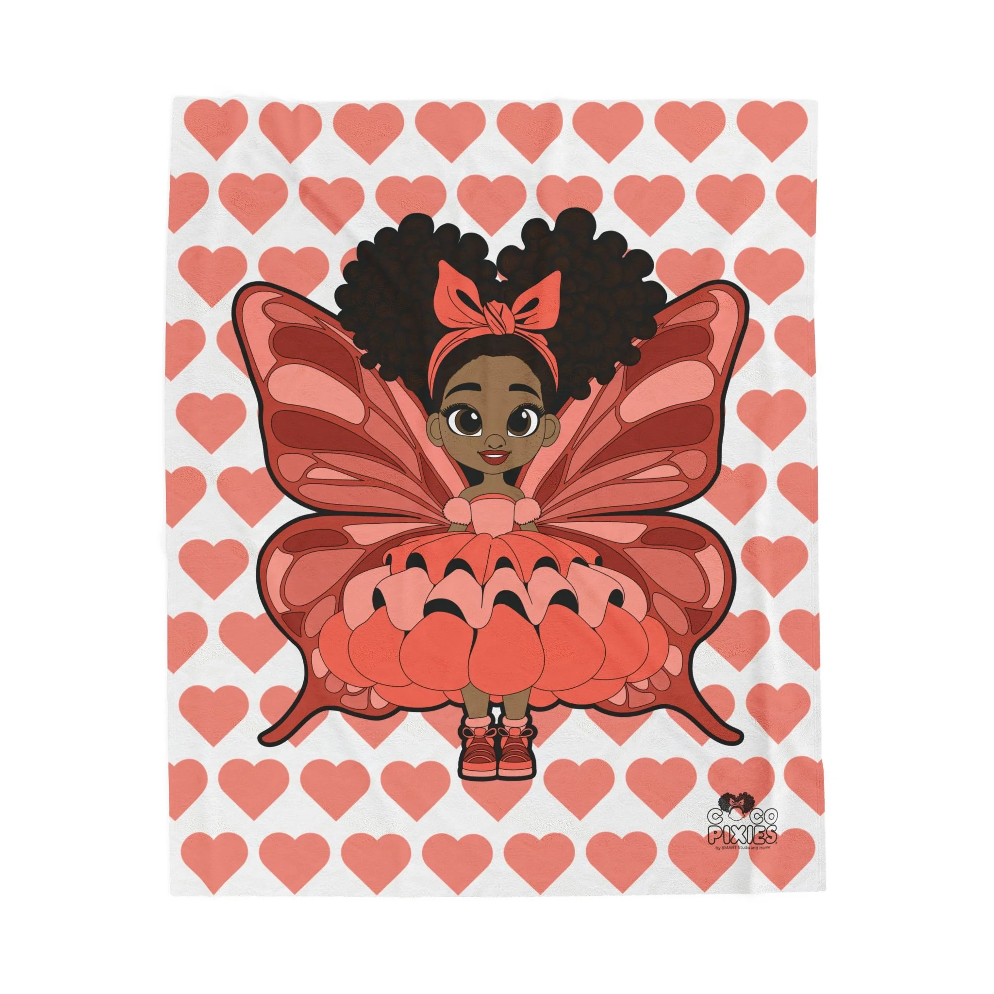 Wrap your little one in comfort, confidence, and cozy pixie magic with the Coco Pixies Lovely Layla Velveteen Blanket. Featuring Lovely Layla surrounded by a charming heart pattern, this ultra-soft velveteen blanket adds warmth, sweetness, and personality to bedrooms, reading corners, and nap time rituals. Designed to feel gentle on young skin while elevating everyday comfort.