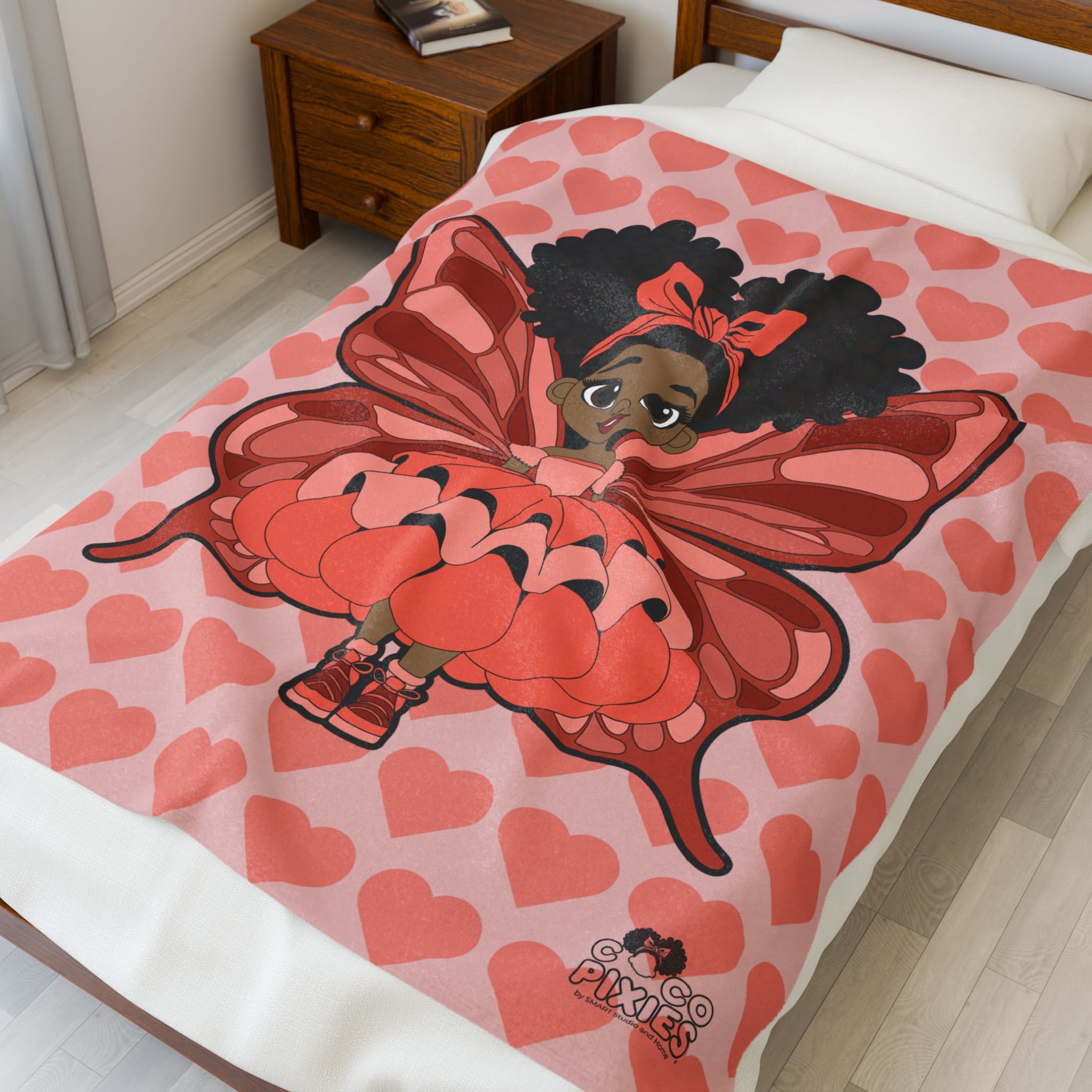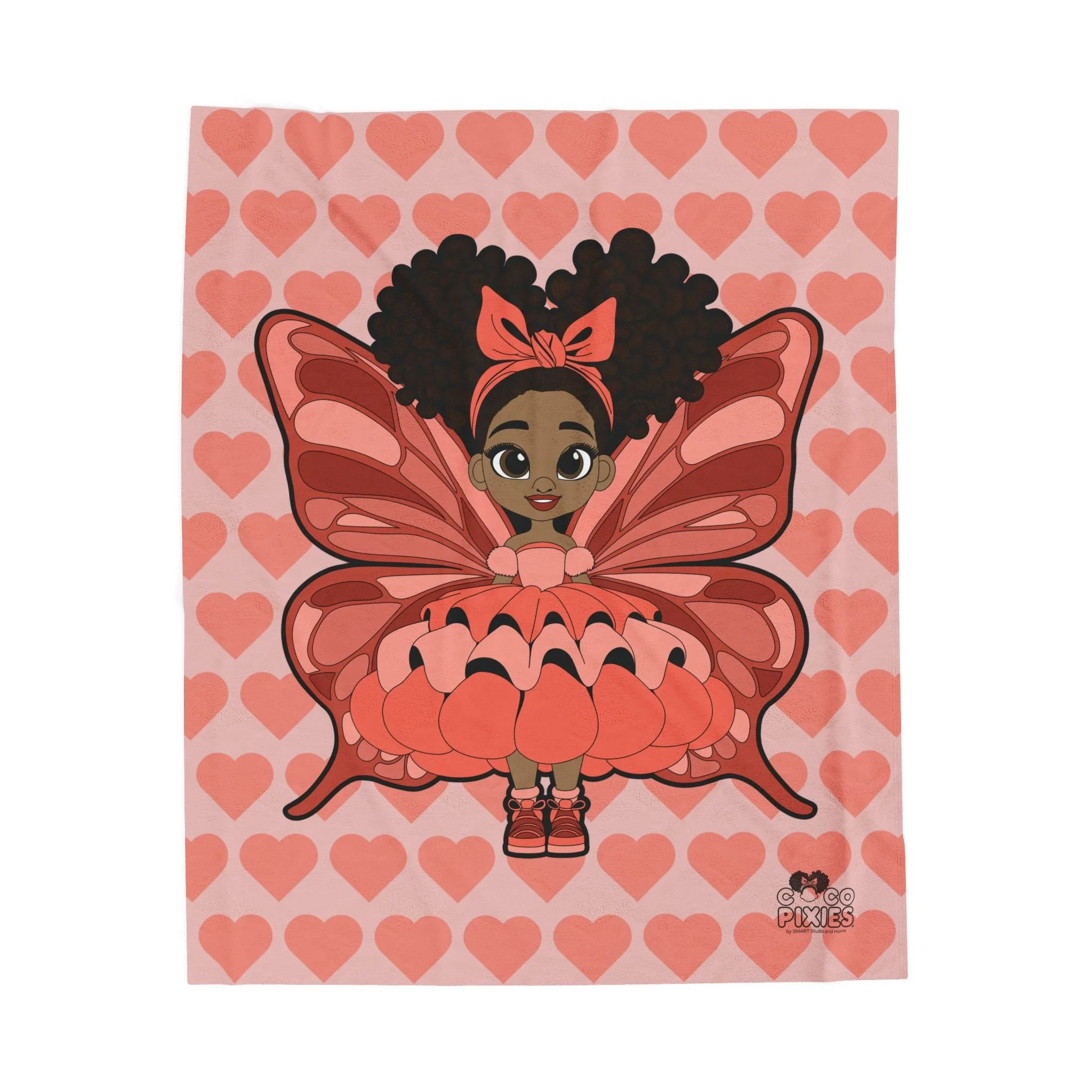Wrap your little one in comfort, confidence, and cozy pixie magic with the Coco Pixies Lovely Layla Velveteen Blanket. Featuring Lovely Layla surrounded by a charming heart pattern, this ultra-soft velveteen blanket adds warmth, sweetness, and personality to bedrooms, reading corners, and nap time rituals. Designed to feel gentle on young skin while elevating everyday comfort.