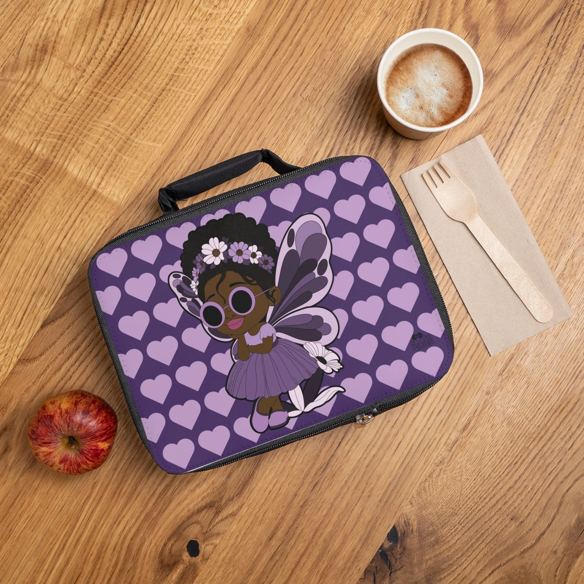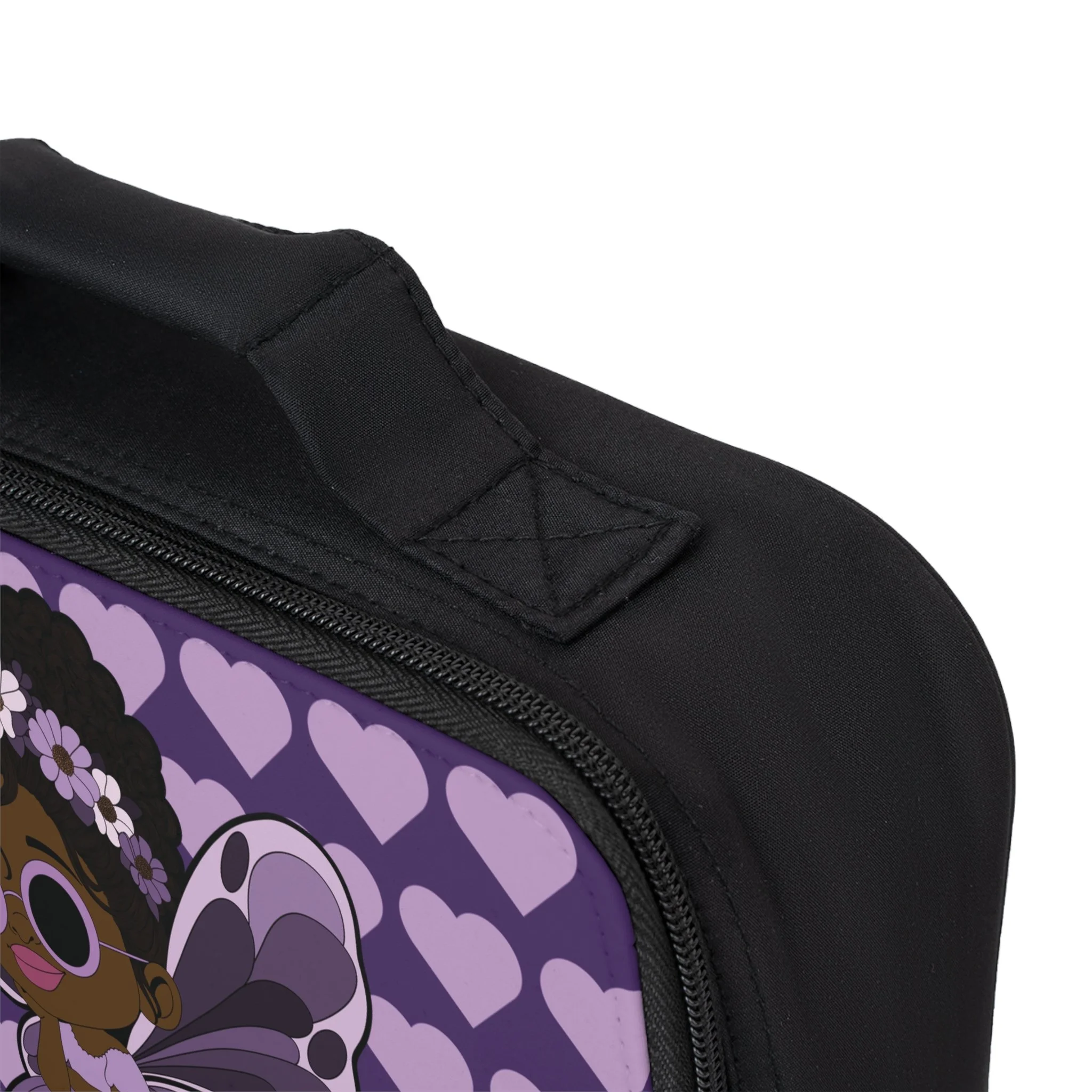 Marvelous Mia brings her signature confidence to this standout Coco Pixies lunch bag, blending playful polish with everyday practicality. Dressed in rich purples with a heart-pattern backdrop, Mia’s afro puffs, floral crown, and statement wings create a bold look that feels stylish and expressive. This insulated lunch bag doubles as a chic clutch-style carry, making it as functional as it is eye-catching—perfect for school days, outings, or creative adventures on the go.