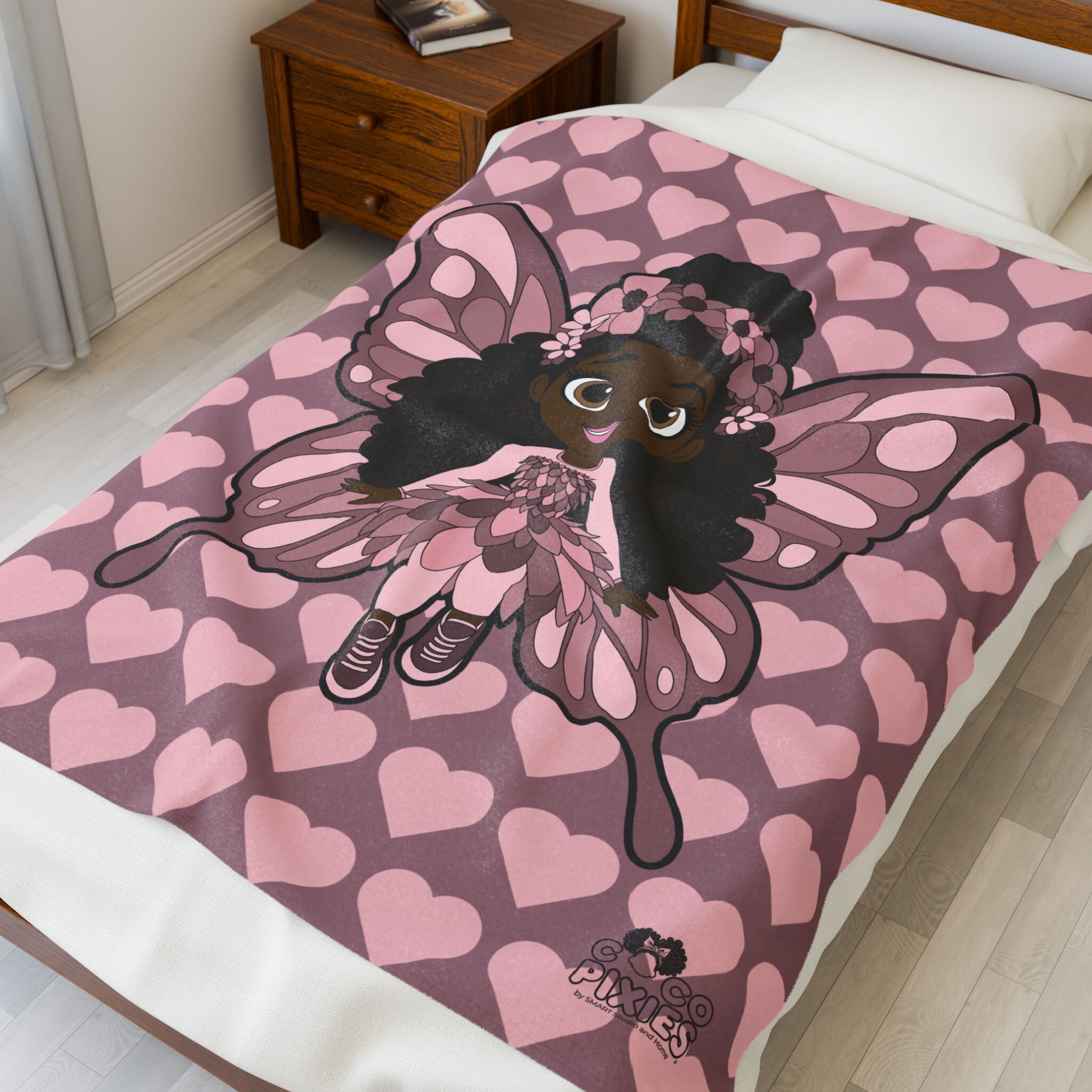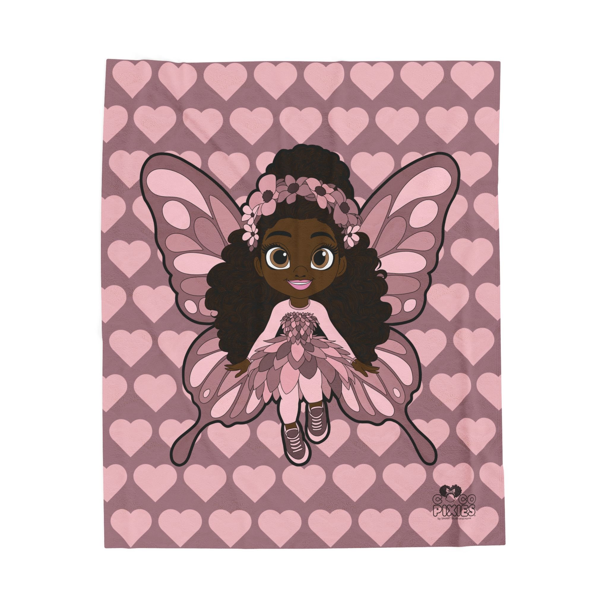 Wrap your little one in comfort, warmth, and pixie magic with the Coco Pixies Penelope Pixie Velveteen Blanket. Featuring Penelope Pixie surrounded by soft pink hearts, this ultra-plush blanket creates a cozy, nurturing atmosphere perfect for naps, bedtime, and everyday snuggles. Designed with kids in mind, it’s irresistibly soft to the touch and gentle against sensitive skin—making it a favorite for both children and parents alike.
