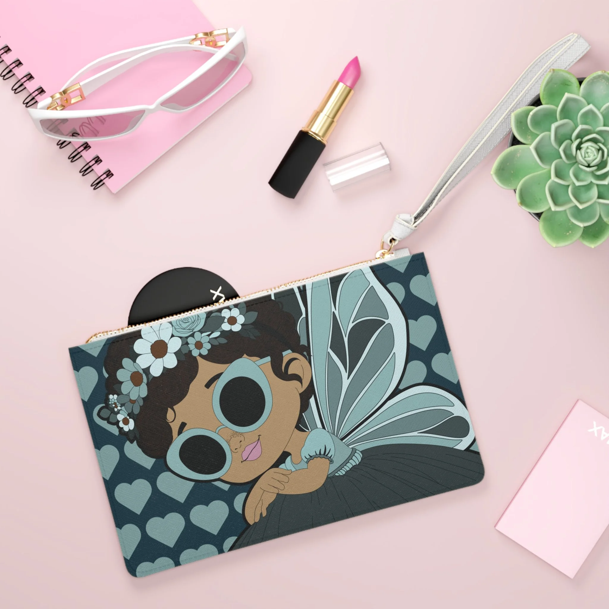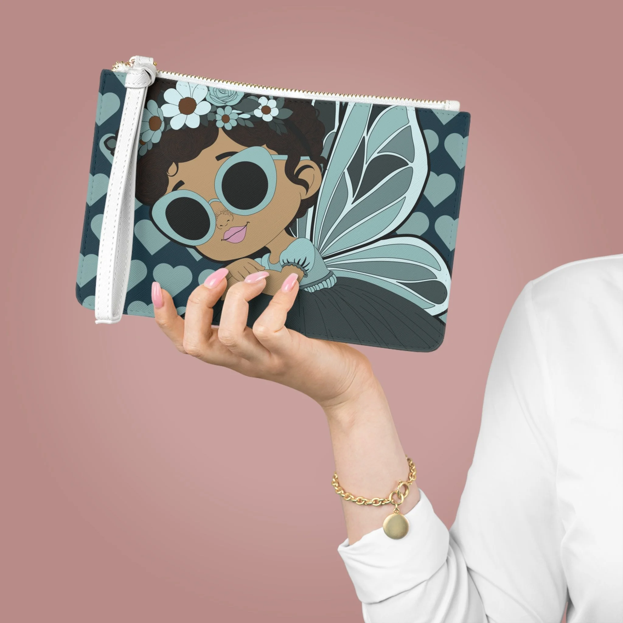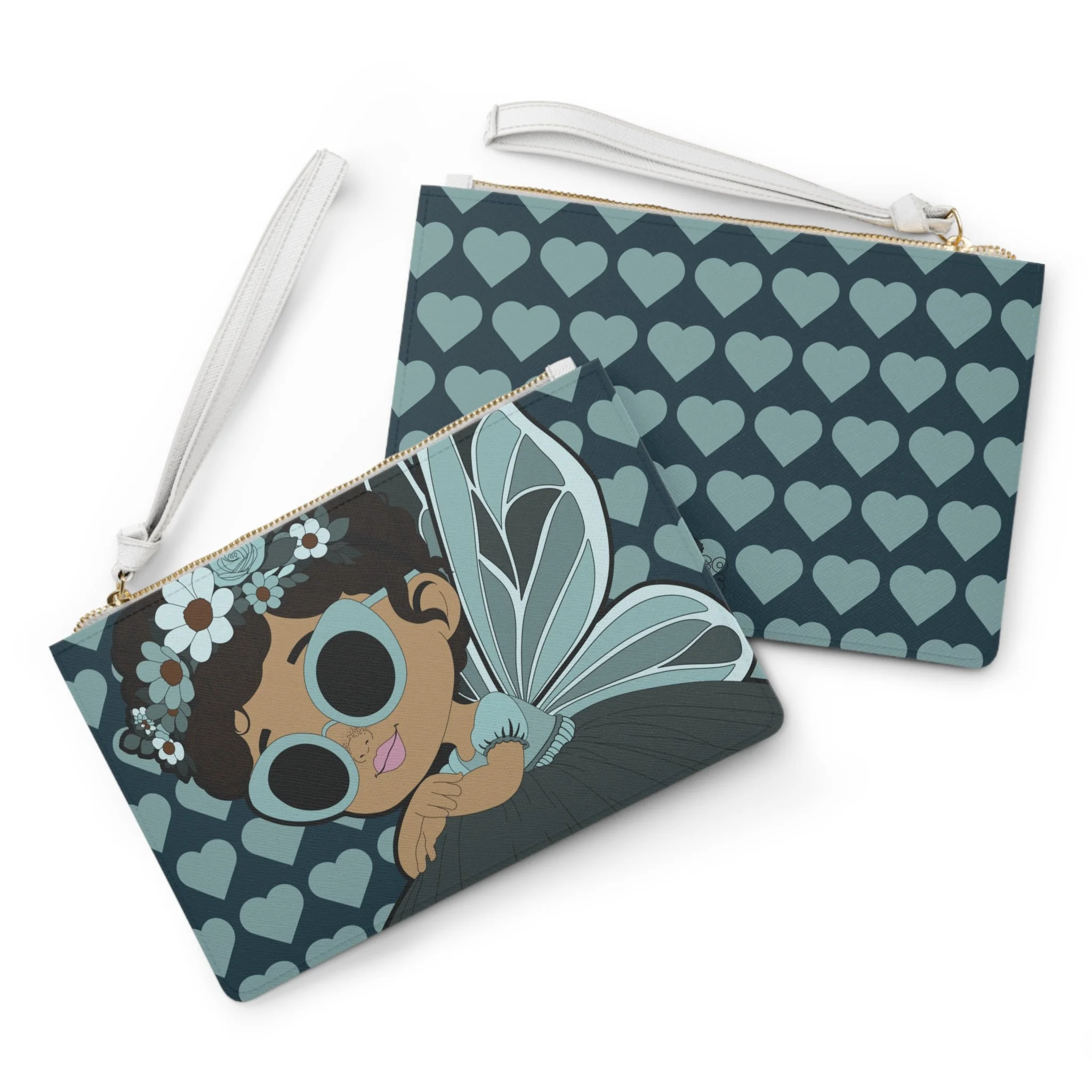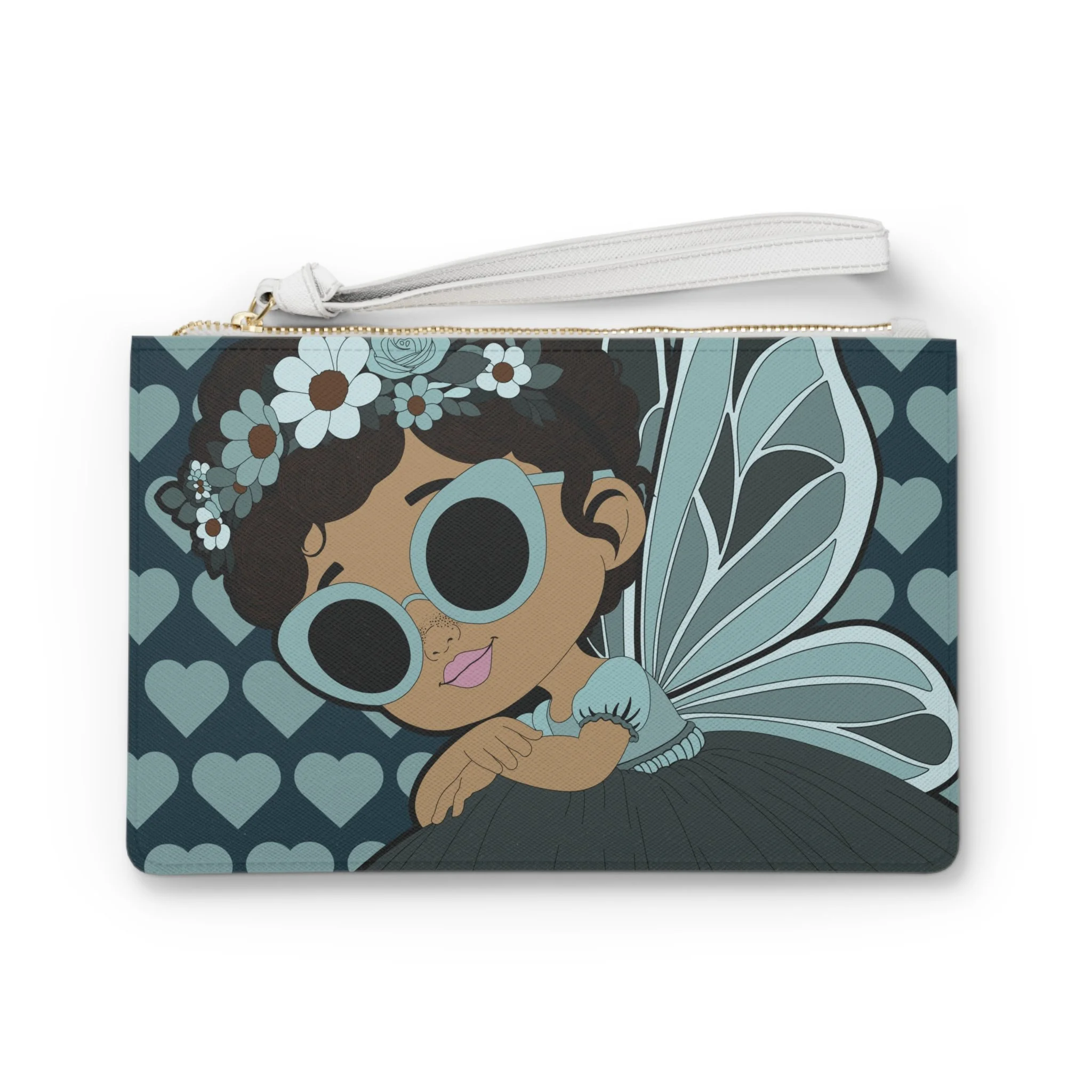 Meet Pixie Piper, a confident style-setter from the Coco Pixies collection, featured on this eye-catching clutch bag designed to stand out wherever you go. With her oversized teal sunglasses, delicate floral crown, soft wing details, and signature heart background, Pixie Piper brings playful sophistication to an everyday accessory that’s as functional as it is expressive.