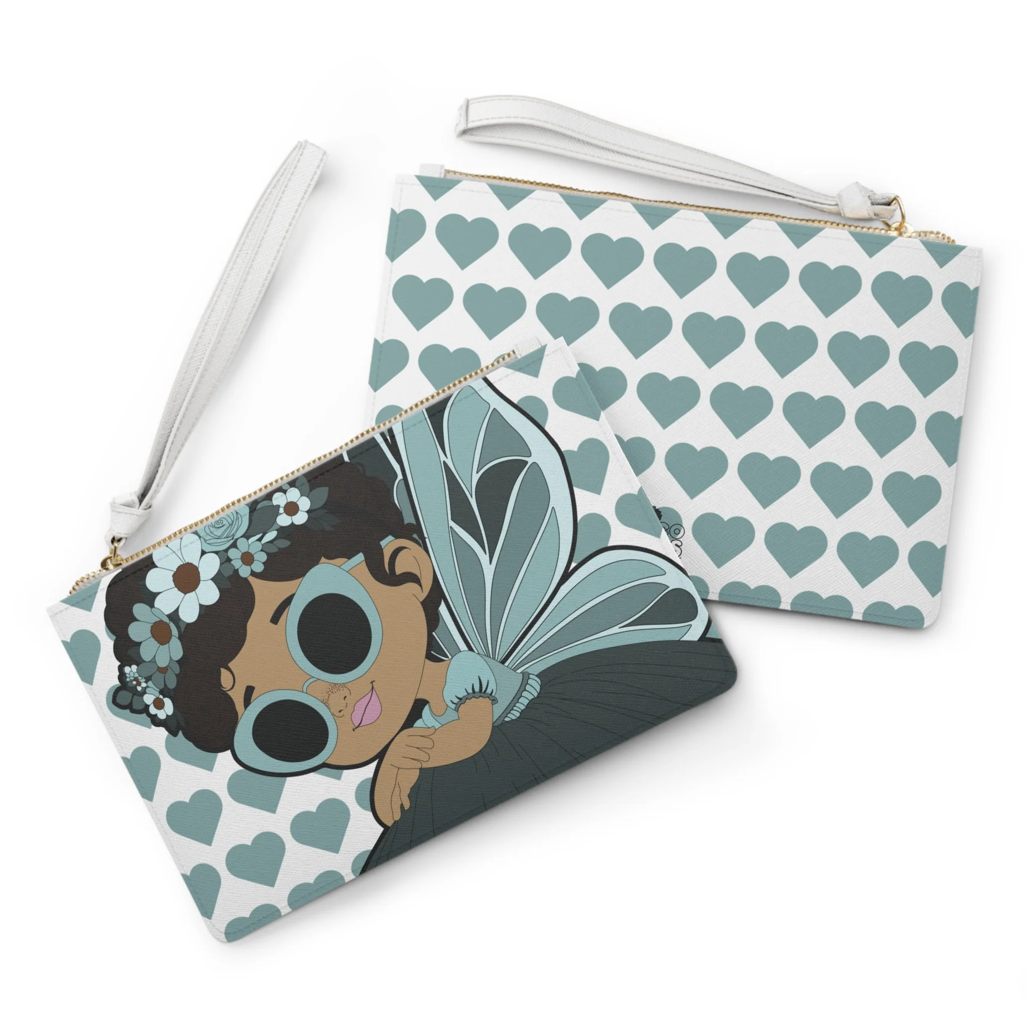 Meet Pixie Piper, one of the most stylish stars of the Coco Pixies collection, brought to life on this charming and functional clutch bag. Featuring Piper’s signature oversized sunglasses, soft teal wings, and sweet floral details, this clutch blends playful personality with everyday practicality. The heart-patterned background and calming color palette make it a standout accessory that feels both whimsical and modern.