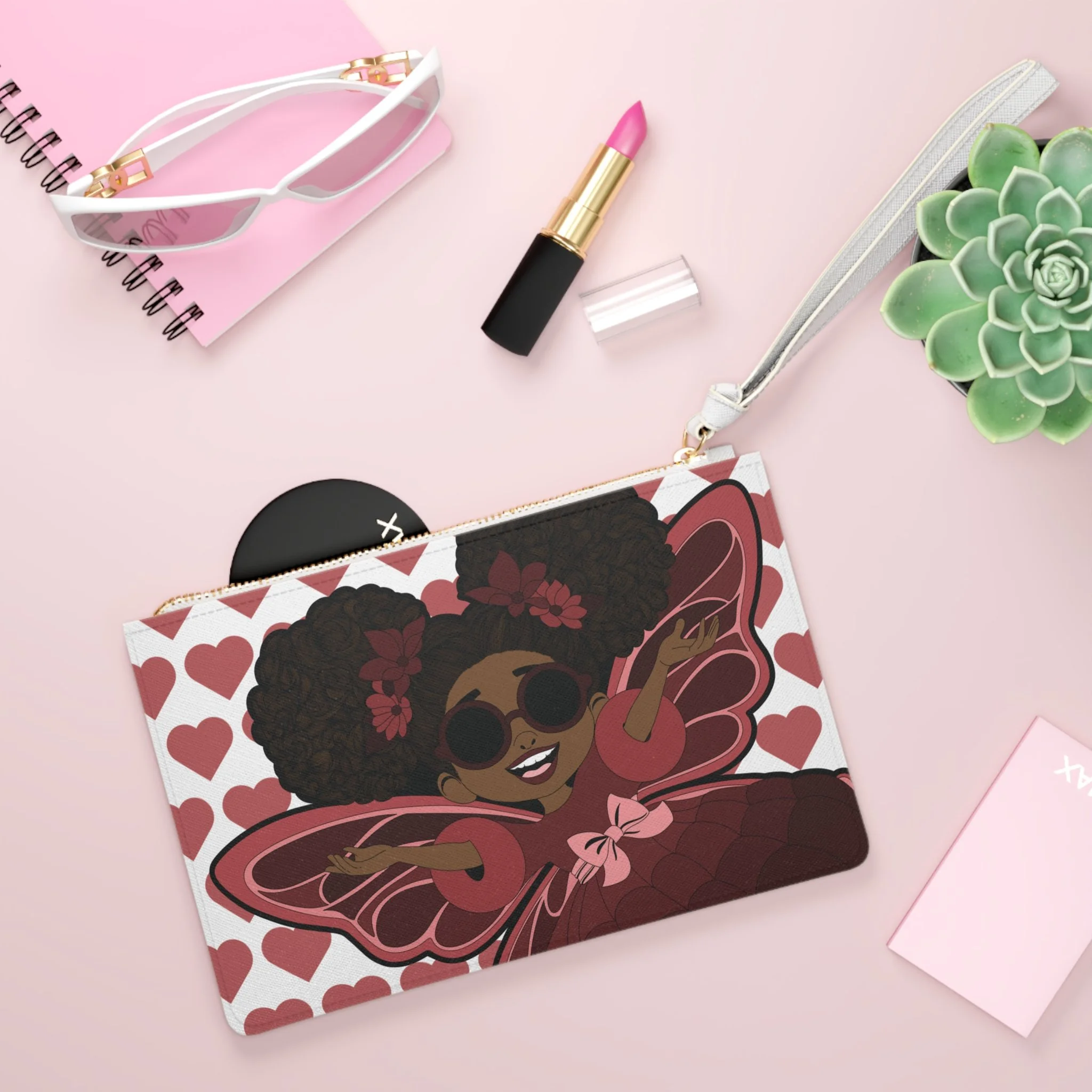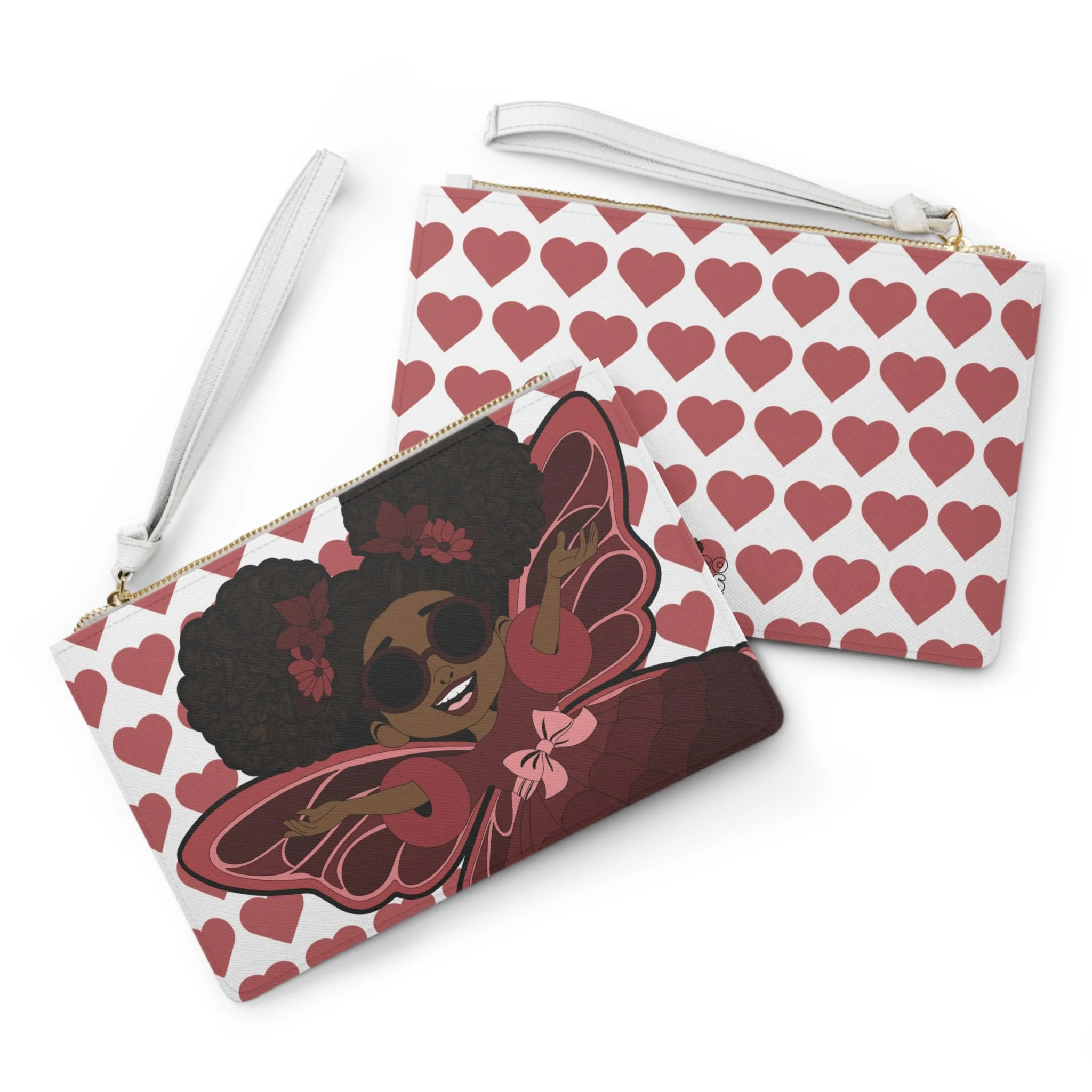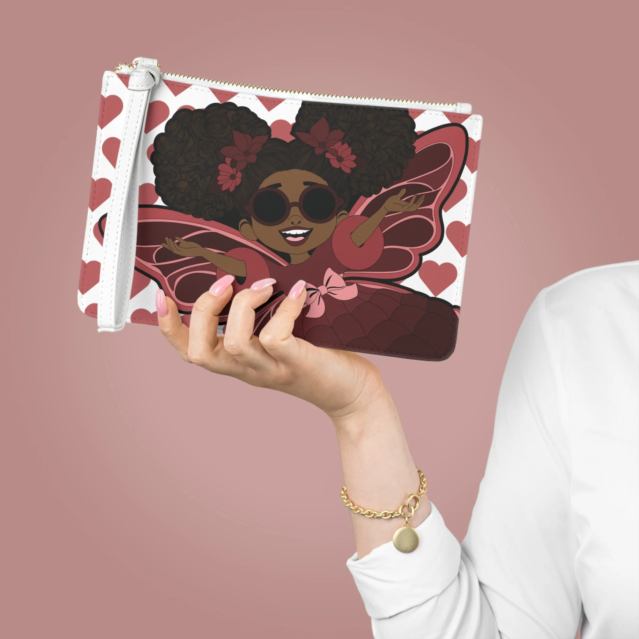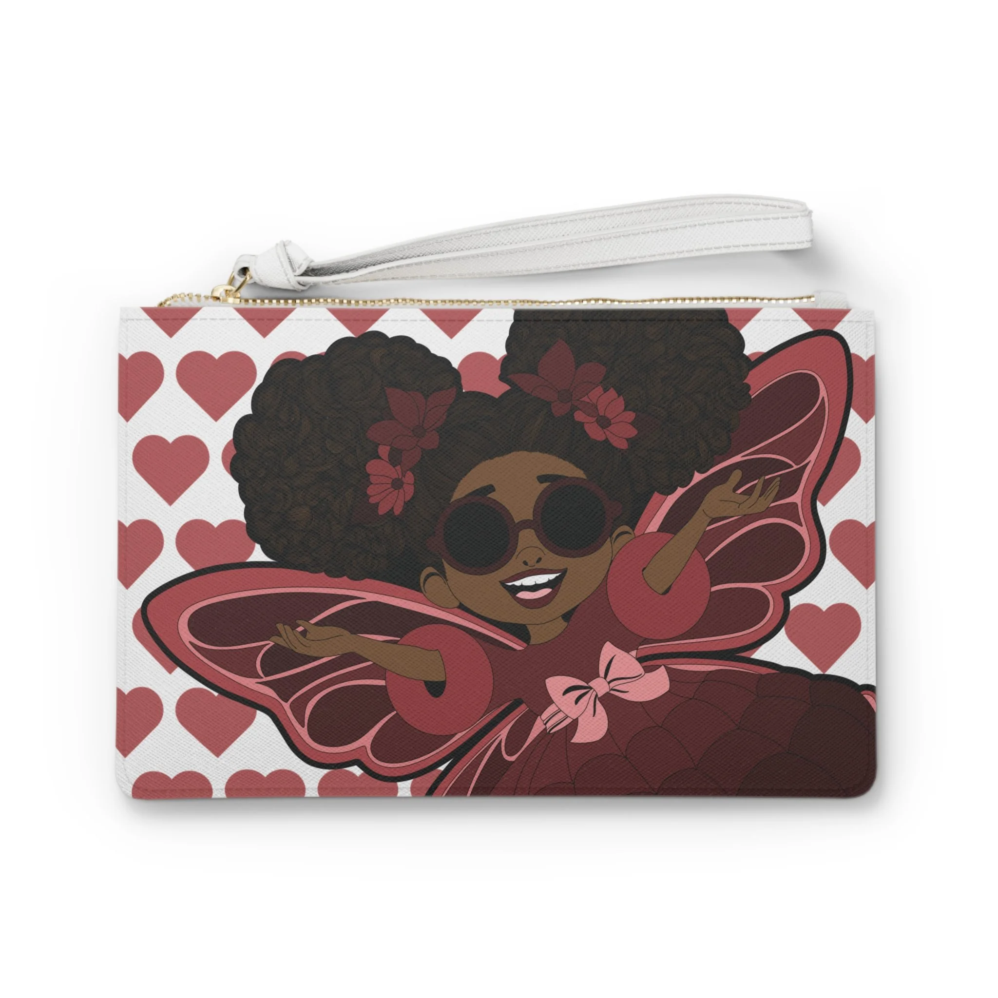 Make a bold statement with the Radiant Ruby Clutch Bag from the Coco Pixies collection—a playful yet polished accessory designed to sparkle with personality. Featuring Radiant Ruby’s signature afro puffs, stylish shades, and confident pose against a charming heart-pattern backdrop, this clutch blends sass, sweetness, and standout style. Finished with a sleek wrist strap and secure zipper closure, it’s as practical as it is eye-catching.