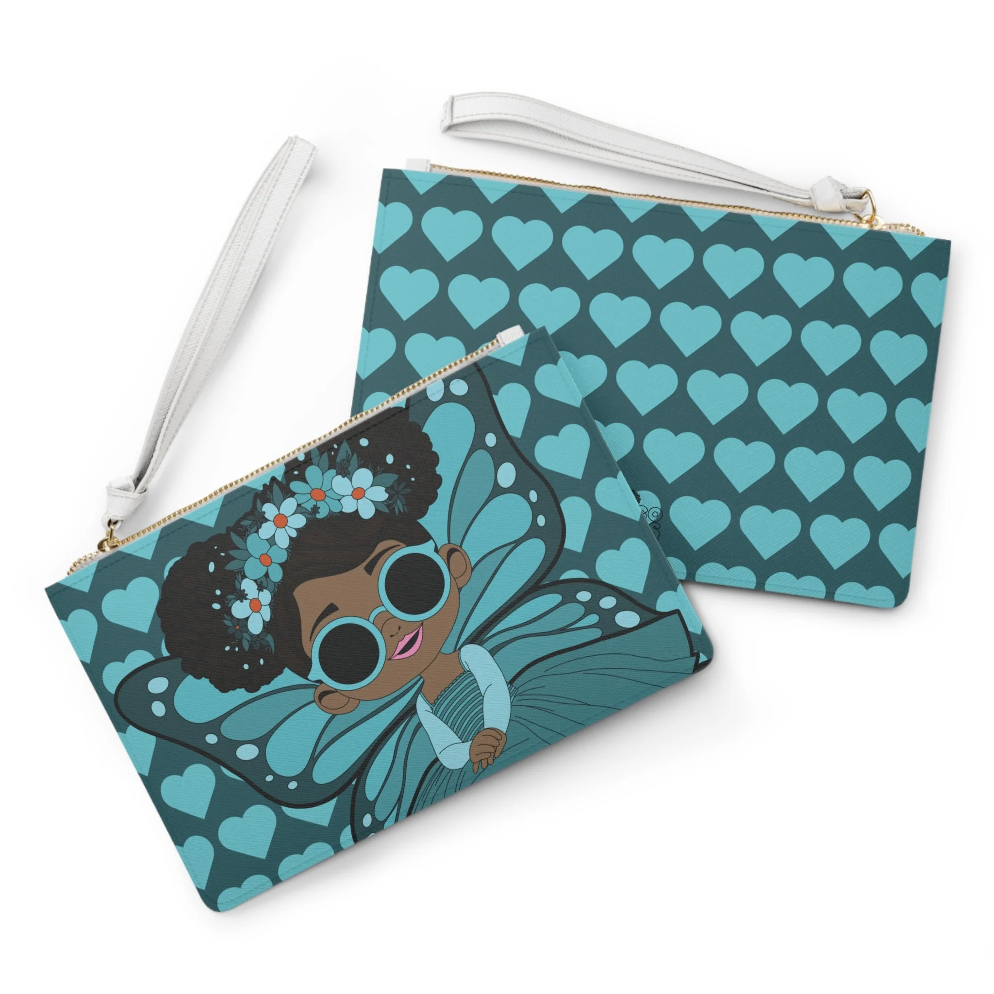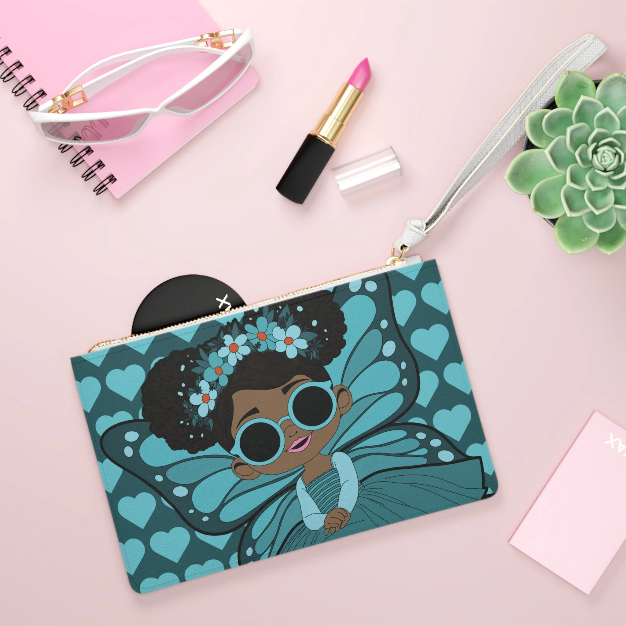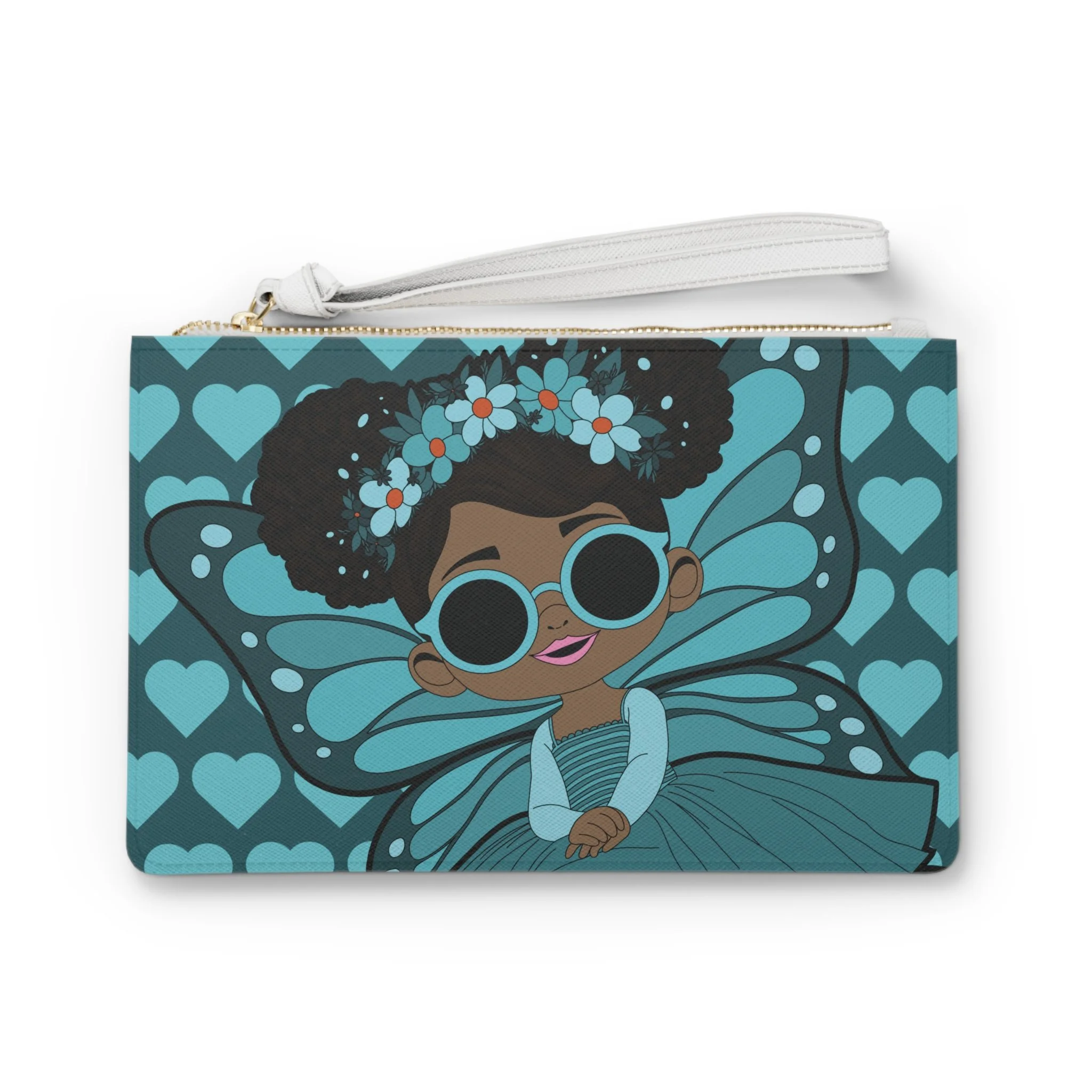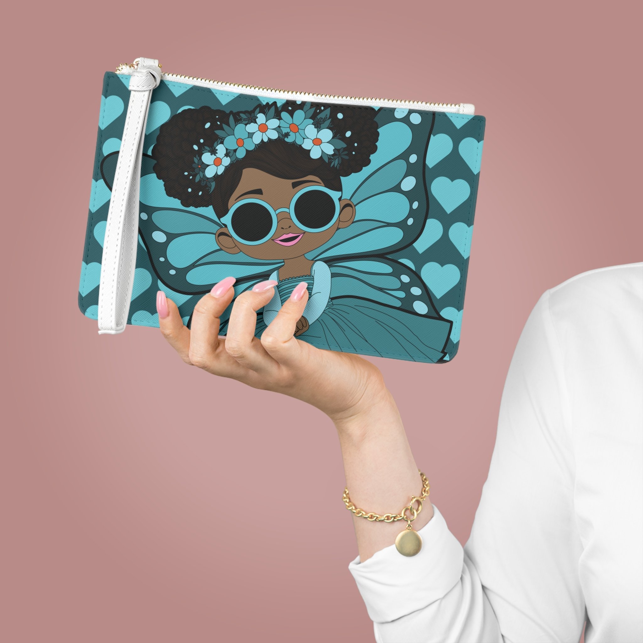 Meet Sassy Sammy, the cool-confidence star of the Coco Pixies collection, splashed across this statement-making clutch bag. With rich teal tones, heart patterns, and Sammy’s signature afro puffs and oversized shades, this clutch brings playful polish to everyday organization. The sleek zip closure and wristlet strap make it easy to grab and go, while the bold pixie artwork turns a practical pouch into a style moment.
