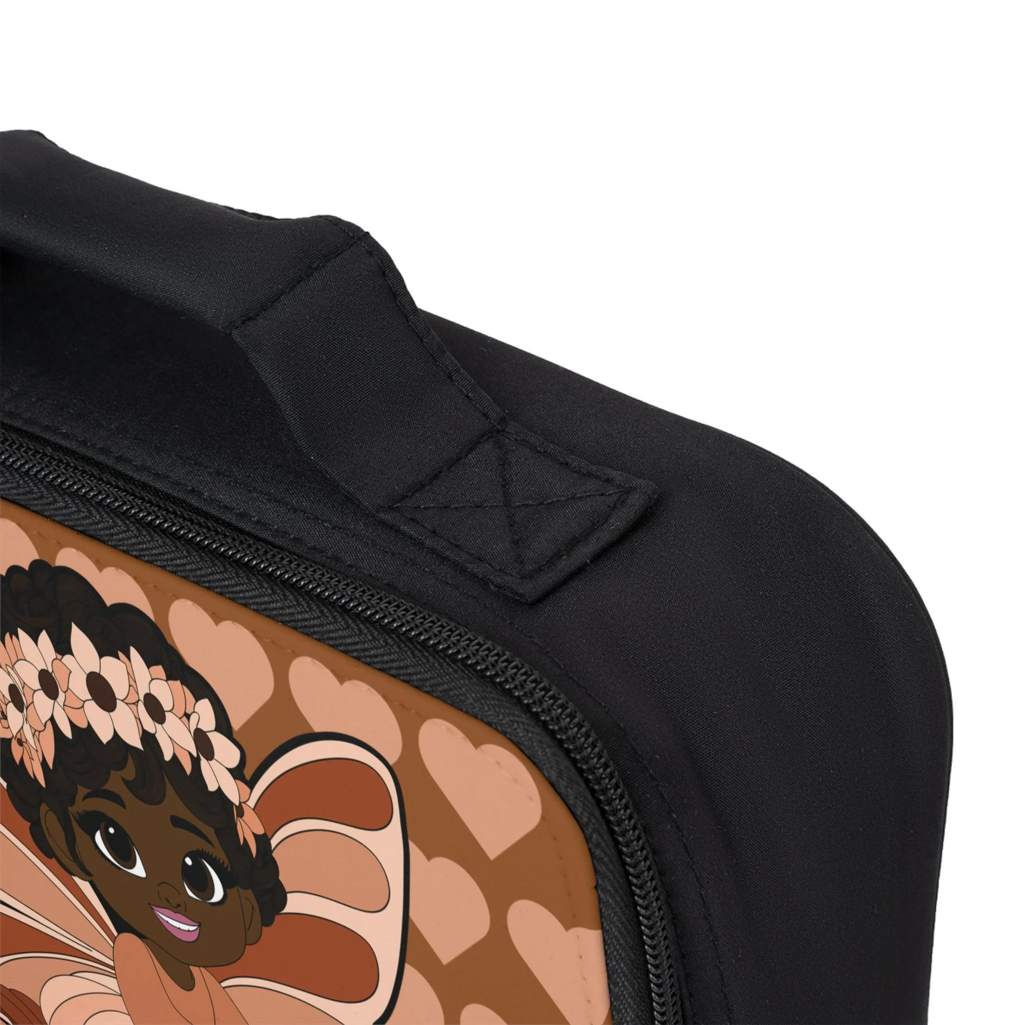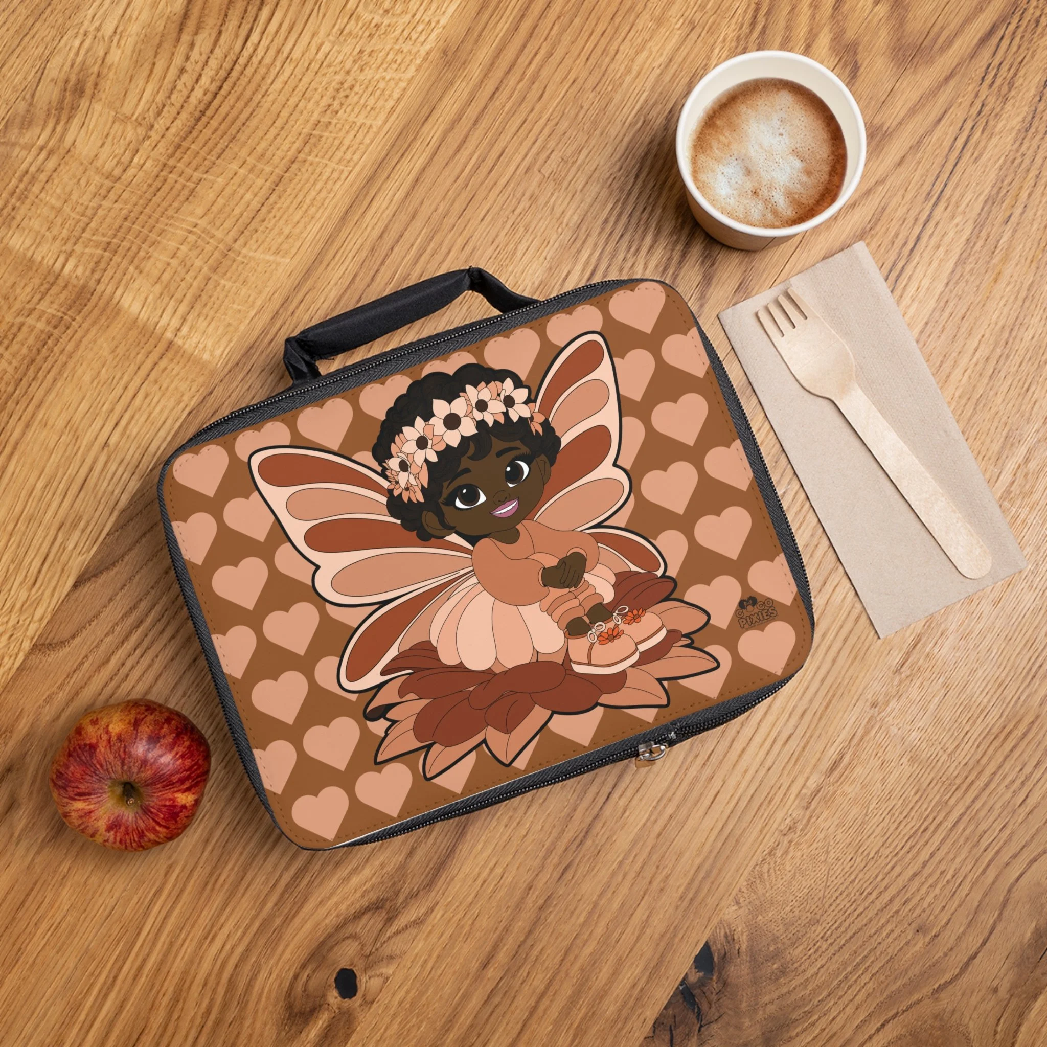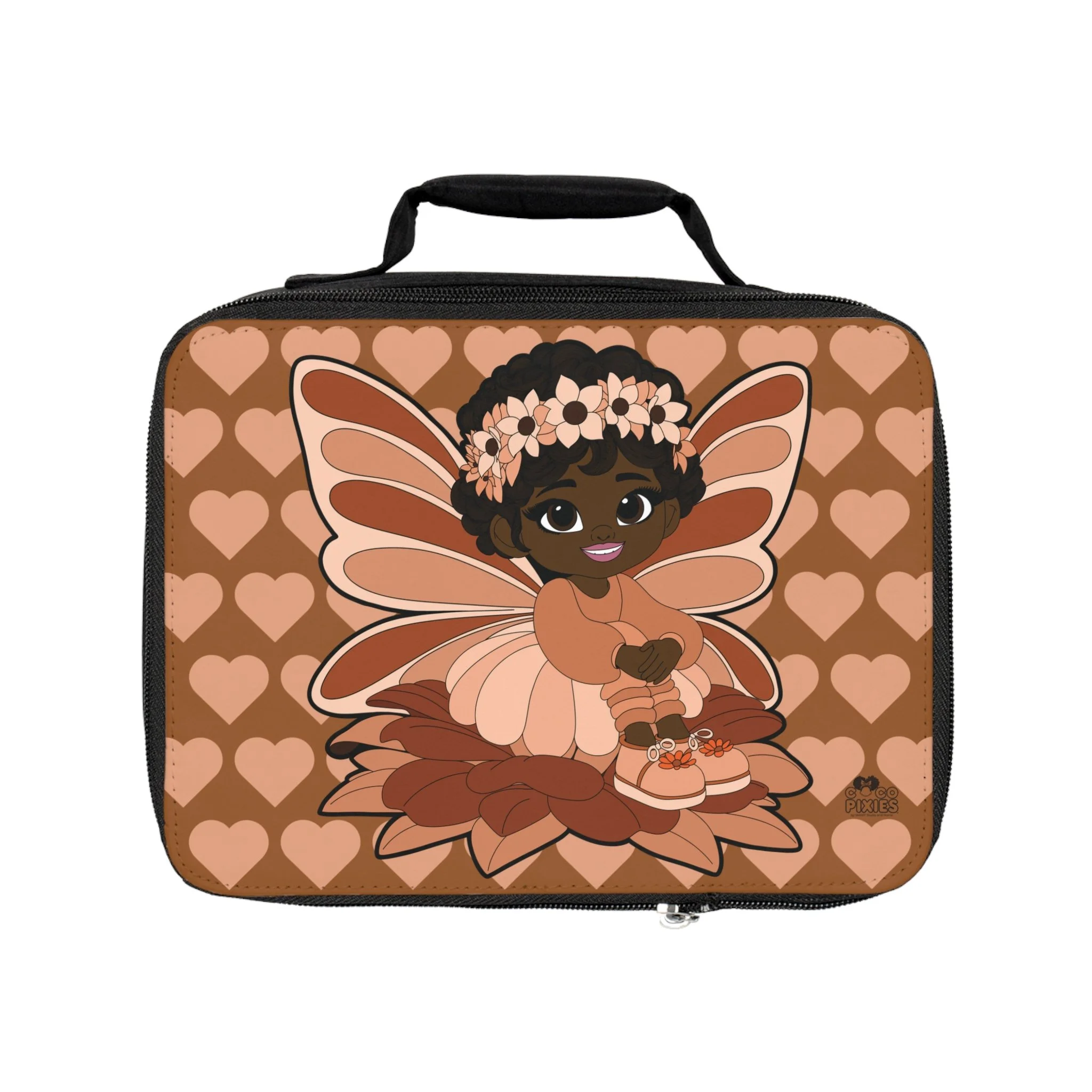 The Sweet Sienna Lunch Bag from the Coco Pixies collection turns everyday meals into a stylish, feel-good moment. Featuring Sweet Sienna with her signature afro puffs, floral crown, and soft pixie wings, this lunch bag is set against a warm heart-patterned backdrop in rich cocoa and blush tones. The design feels cozy, confident, and expressive—perfect for adding personality to school days, outings, or packed lunches on the go.