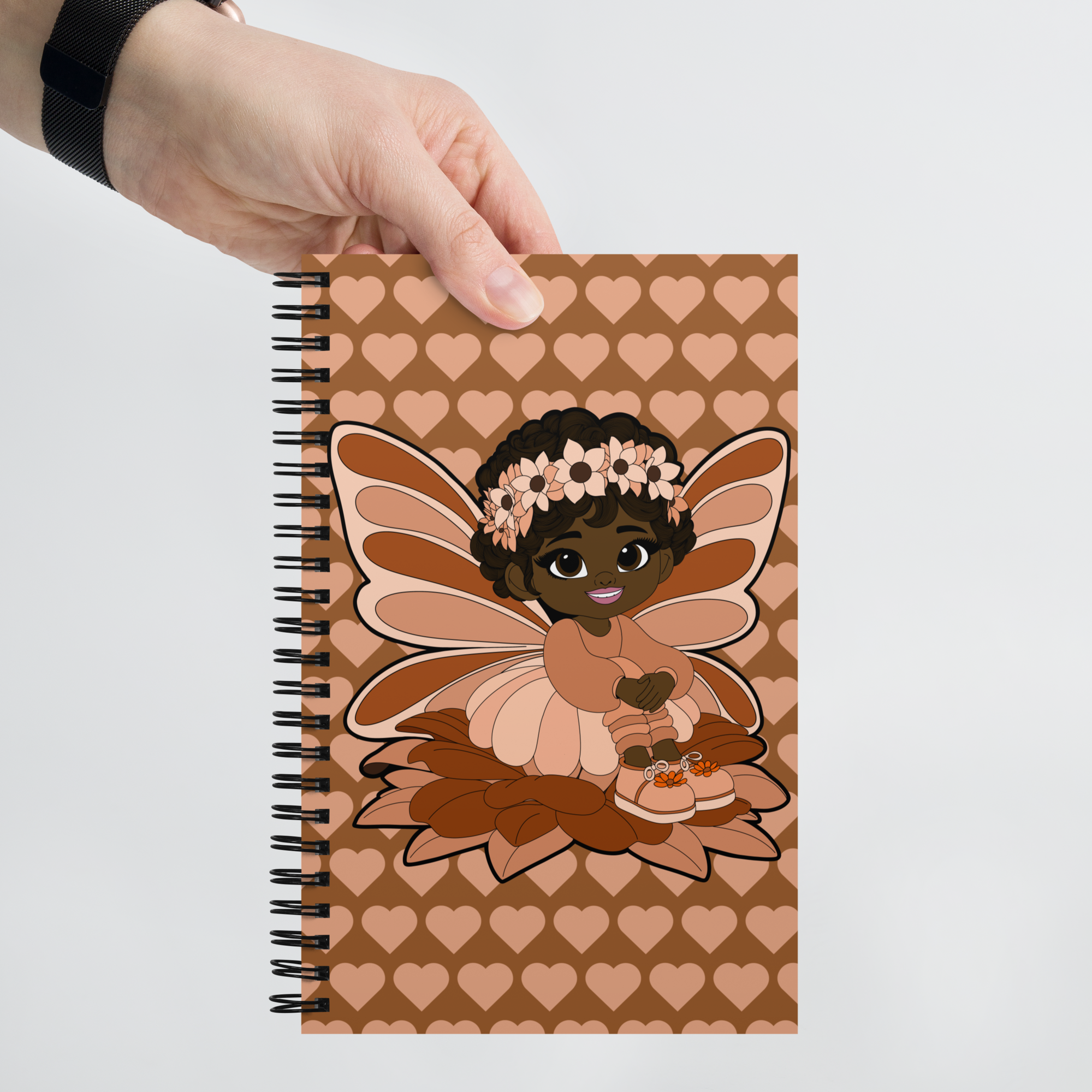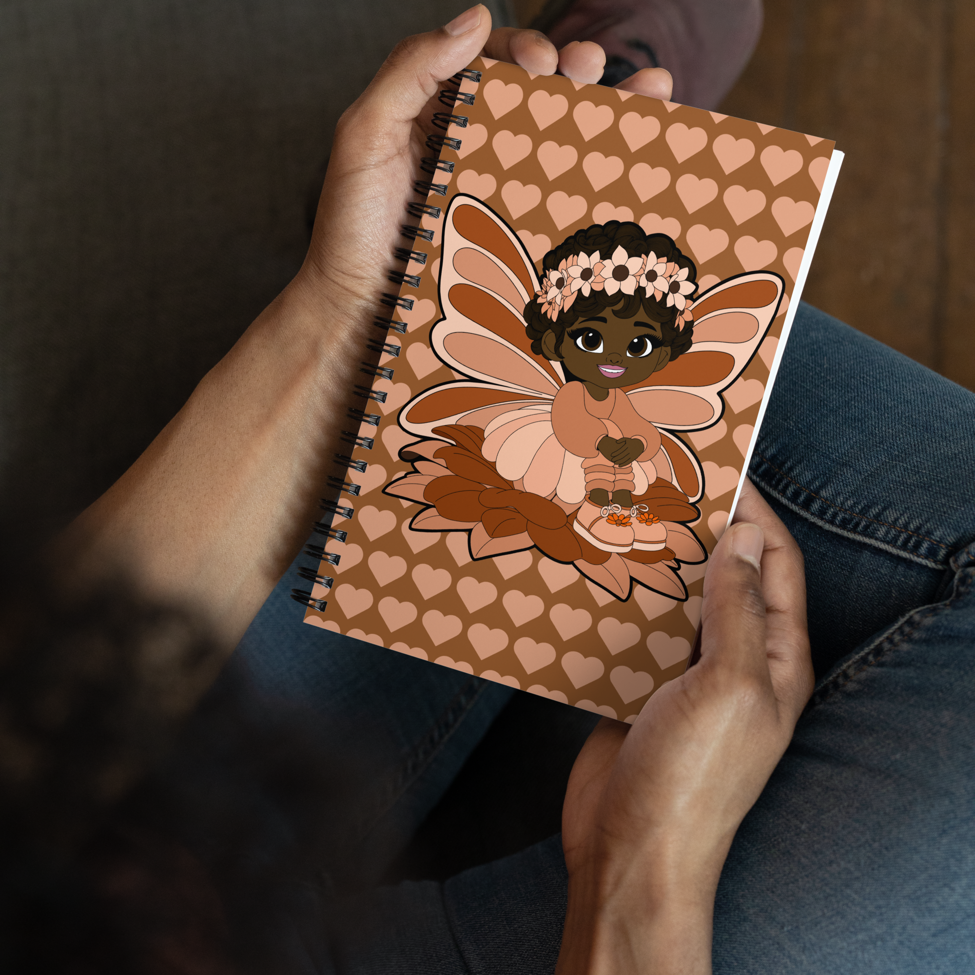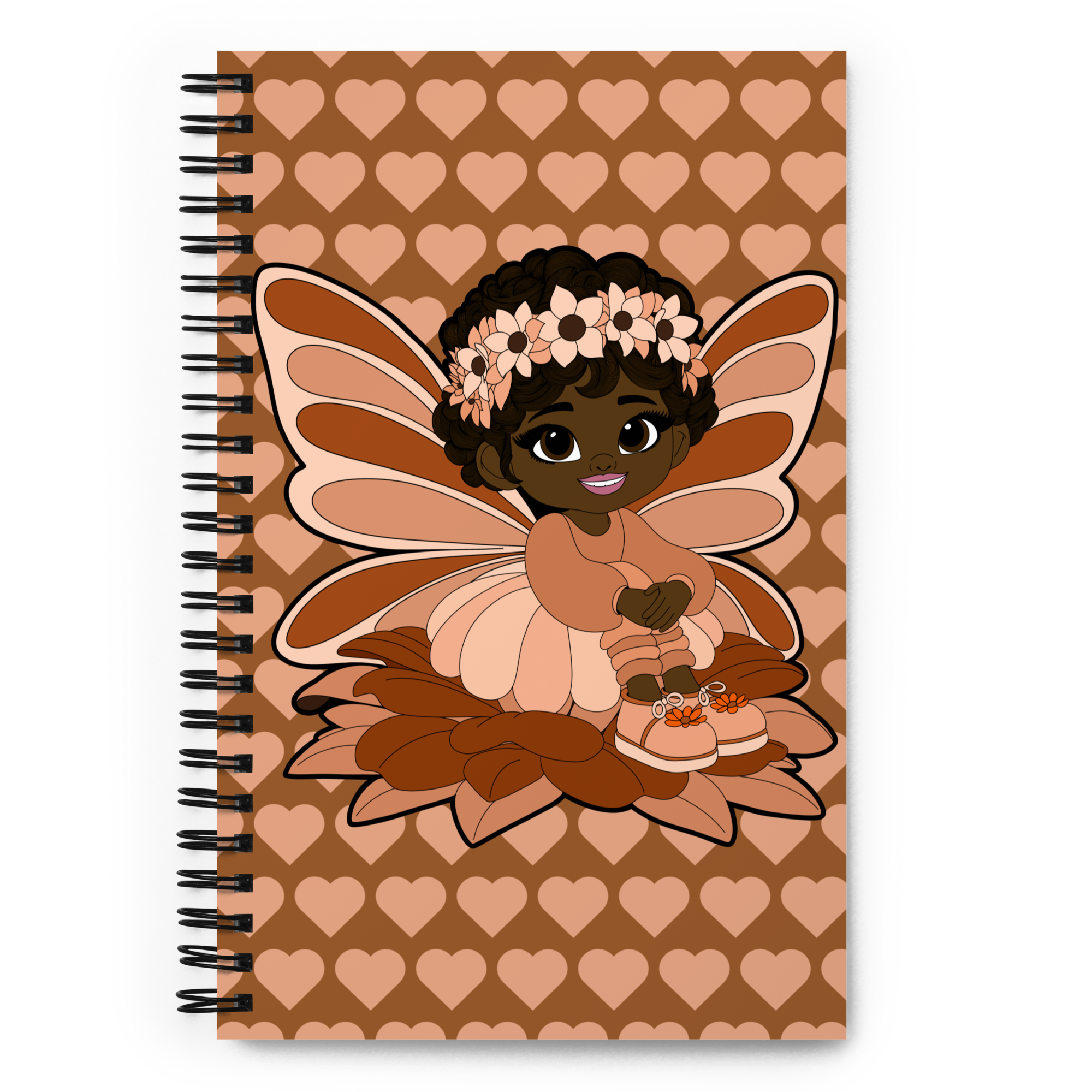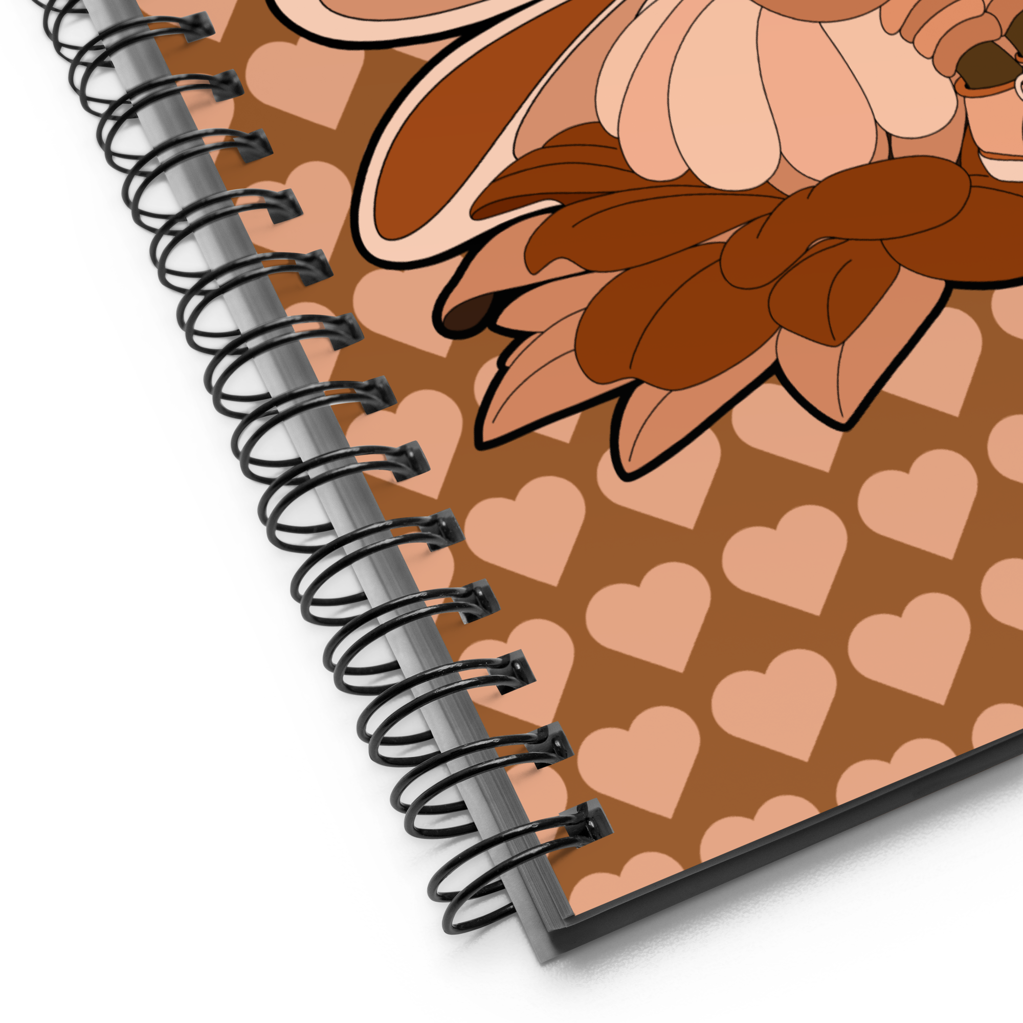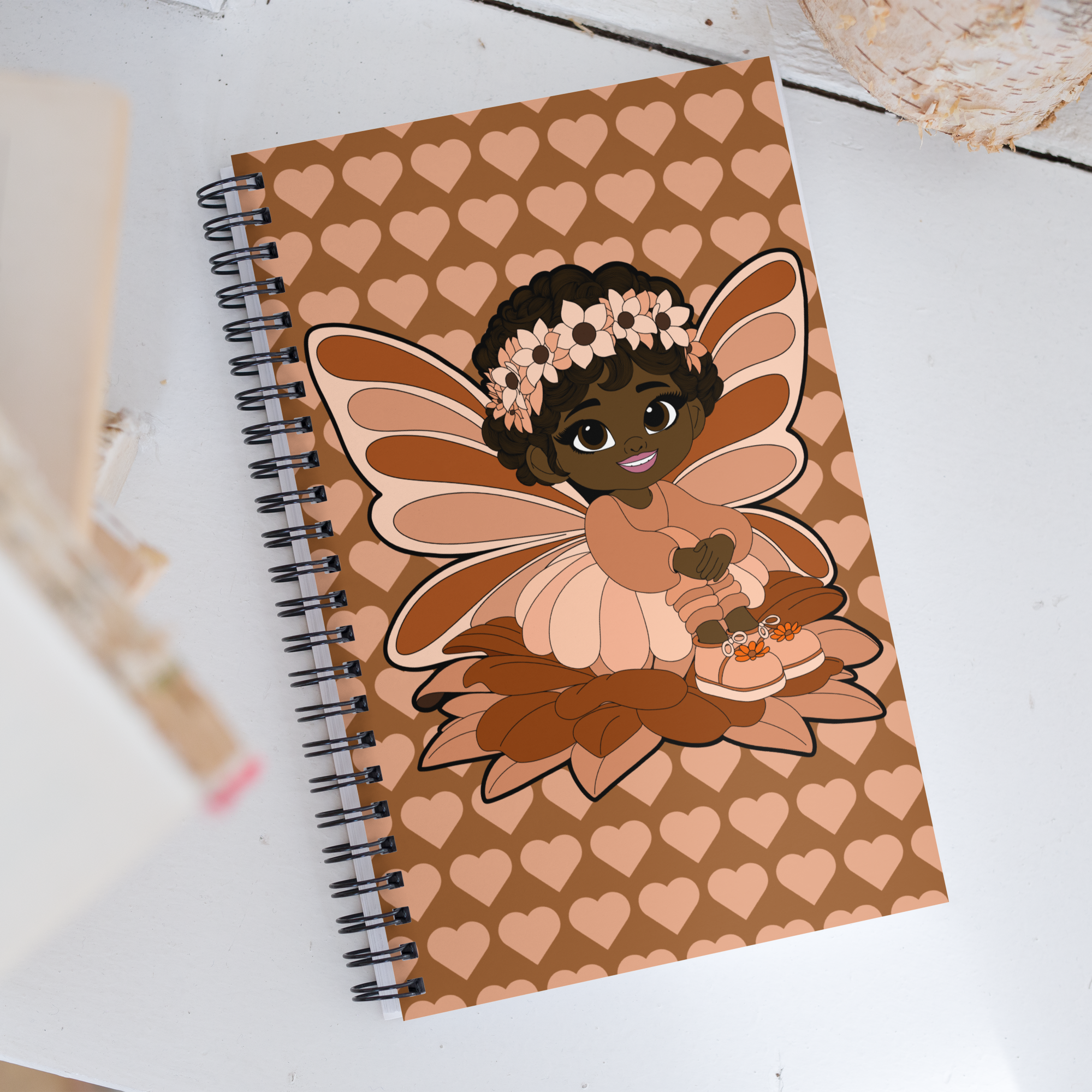 Sweet Sienna brings warmth, charm, and soft confidence to every page of this Coco Pixies spiral notebook. Wrapped in a rich caramel-toned heart pattern, this design feels cozy yet elevated — a boutique statement piece for desks, backpacks, and bedside tables alike. Sweet Sienna sits gracefully atop layered petals, her floral crown and delicate wings framed in earthy blush and cocoa hues that feel timeless and intentional.