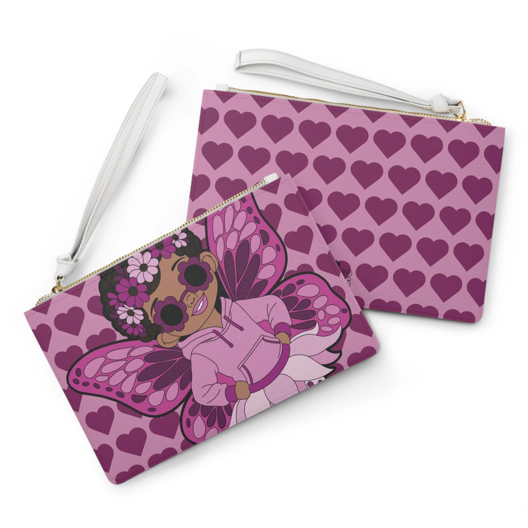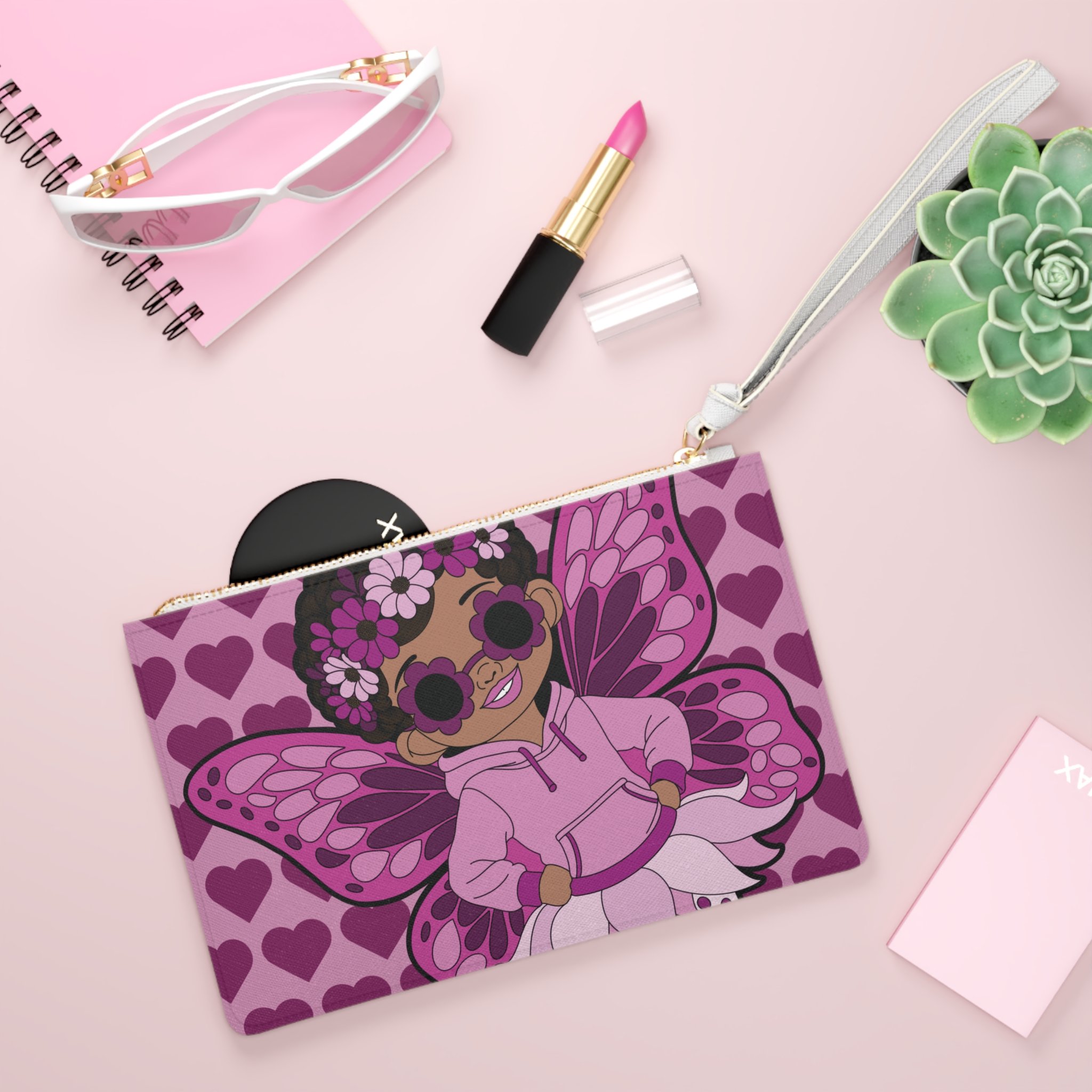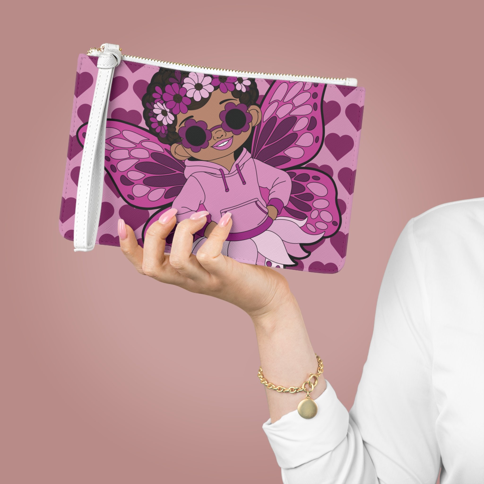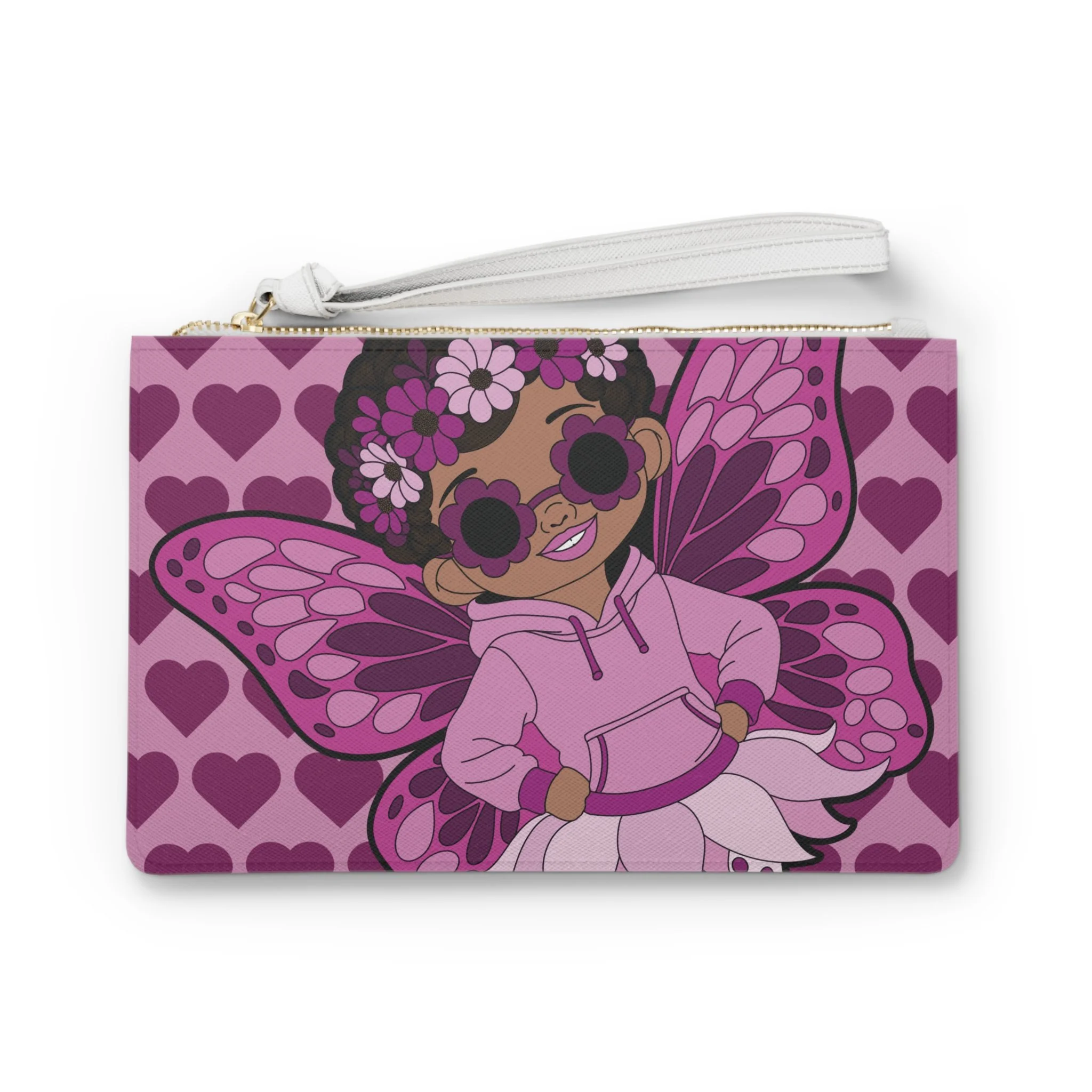 Meet Teonna Twinklepuff, a confident favorite from the Coco Pixies collection, featured on this standout clutch bag bursting with personality. Dressed in rosy pink tones with layered heart patterns and her signature afro puffs, Teonna brings bold pixie style to an everyday essential. Designed with a smooth finish, secure zip closure, and wrist strap, this clutch balances playful design with practical function.
