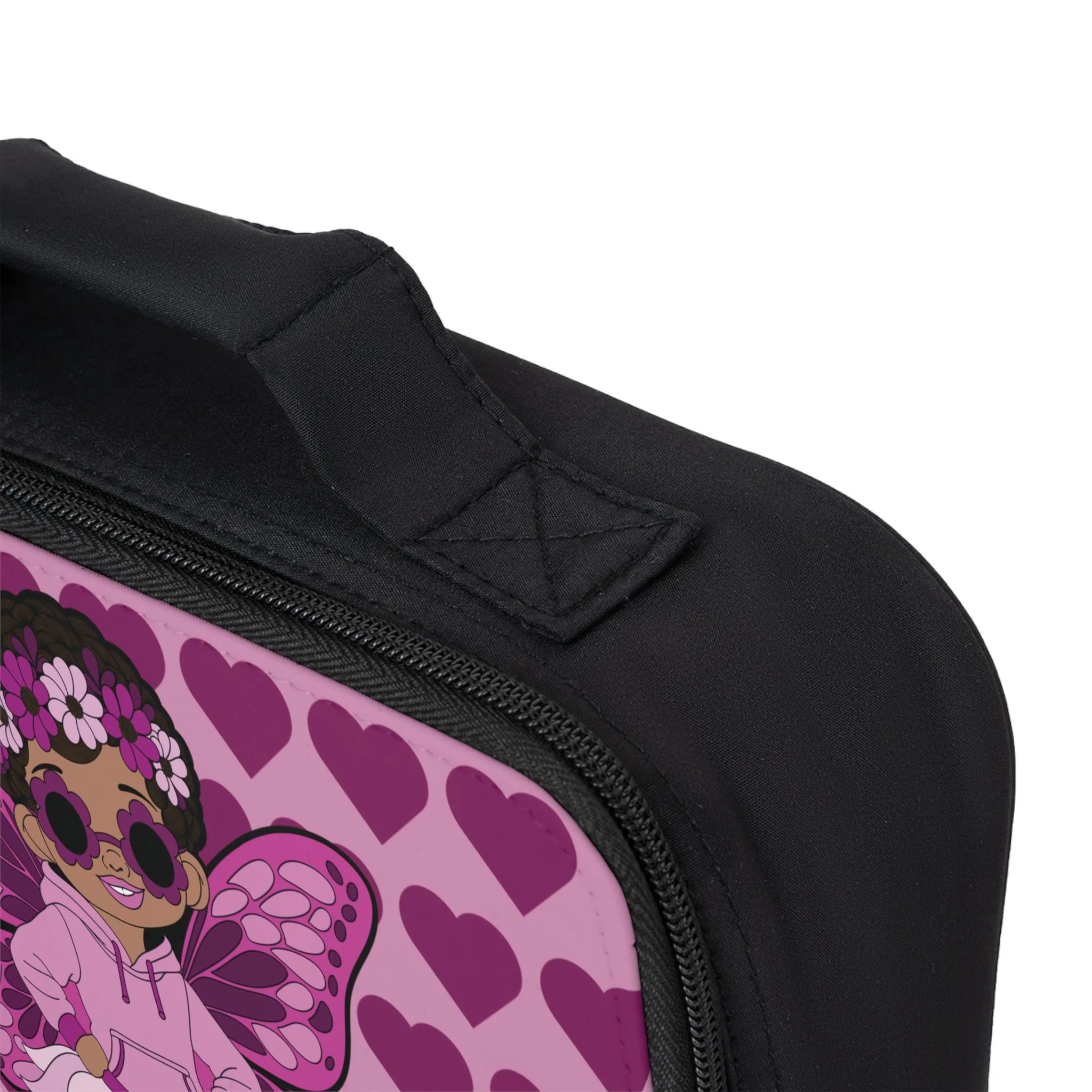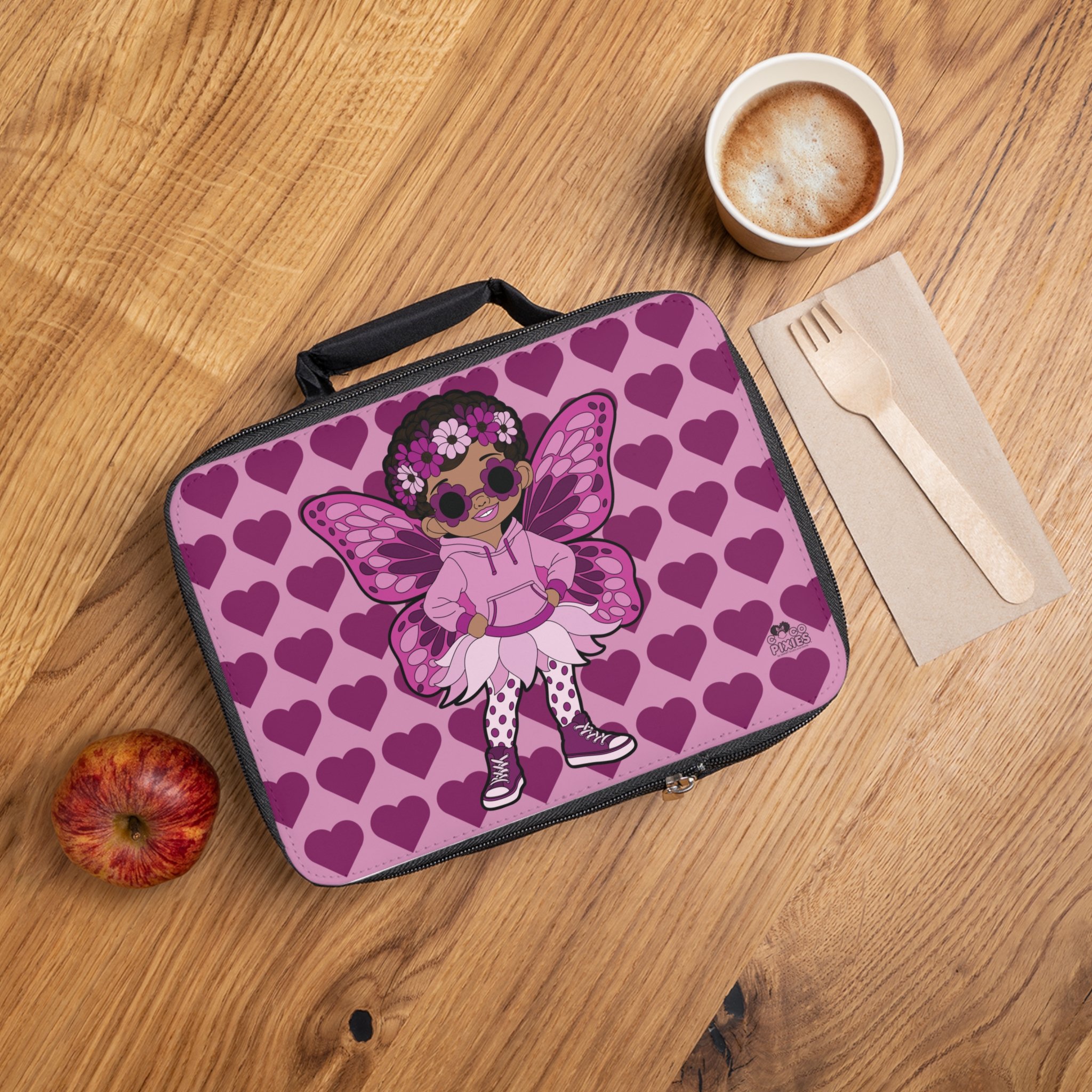 The Teonna Twinklepuff Lunch Bag from the Coco Pixies collection brings bold personality and practical design to everyday meals. Set against a playful pink heart background, Teonna’s signature afro puffs, wings, and confident stance create a standout look that feels expressive and fun. With its structured shape, zip-around closure, and easy-carry top handle, this lunch bag is designed to keep meals secure while adding pixie style to school days and outings.