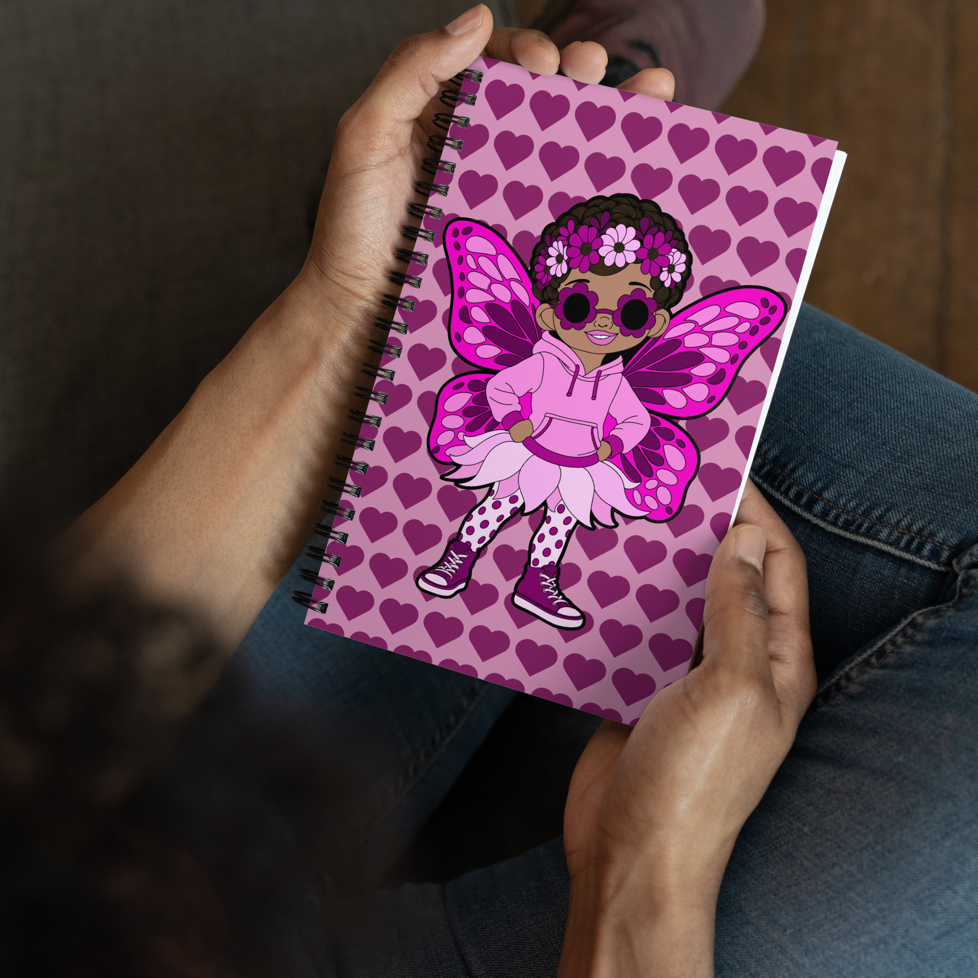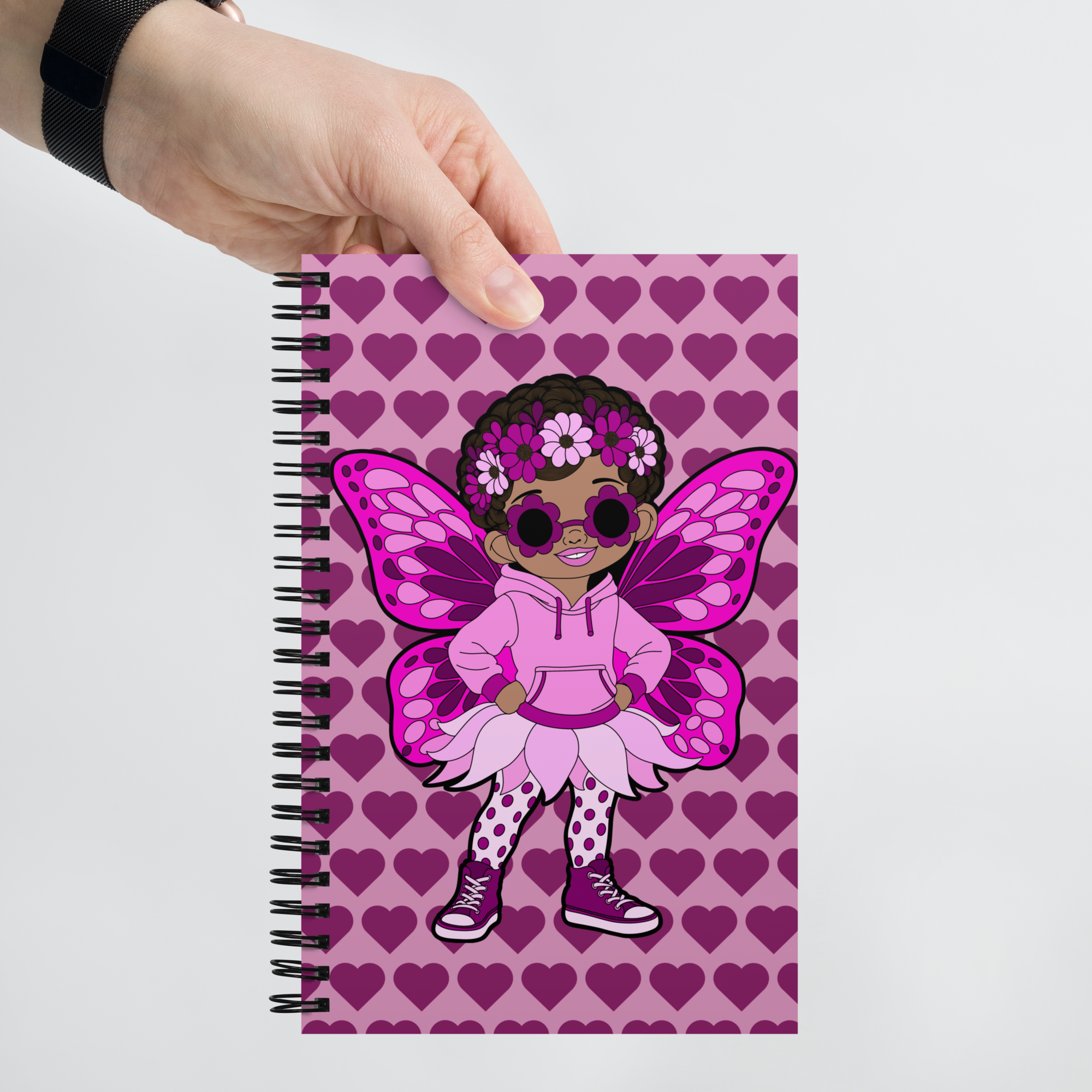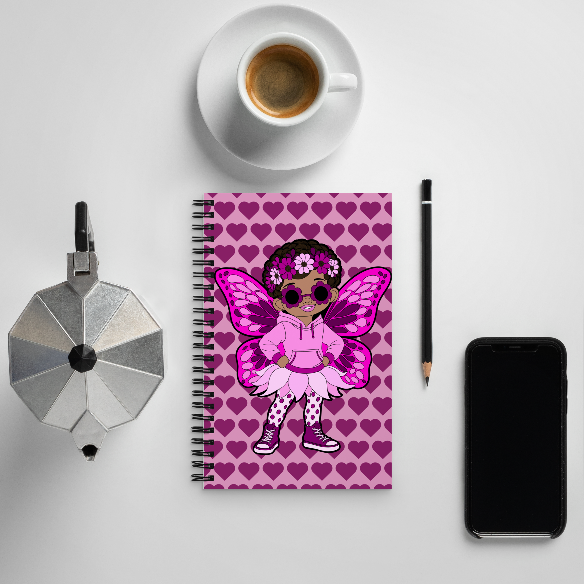 Teonna Twinklepuff makes a bold statement on this vibrant Coco Pixies notebook/journal, wrapped in a signature pink heart pattern that feels playful, confident, and unmistakably chic. With her floral crown, oversized flower shades, dotted tights, petal skirt, and bright pink wings, Teonna Twinklepuff brings personality and sparkle to every page. This notebook is more than stationery—it’s a daily reminder to stand tall, think big, and write with confidence.